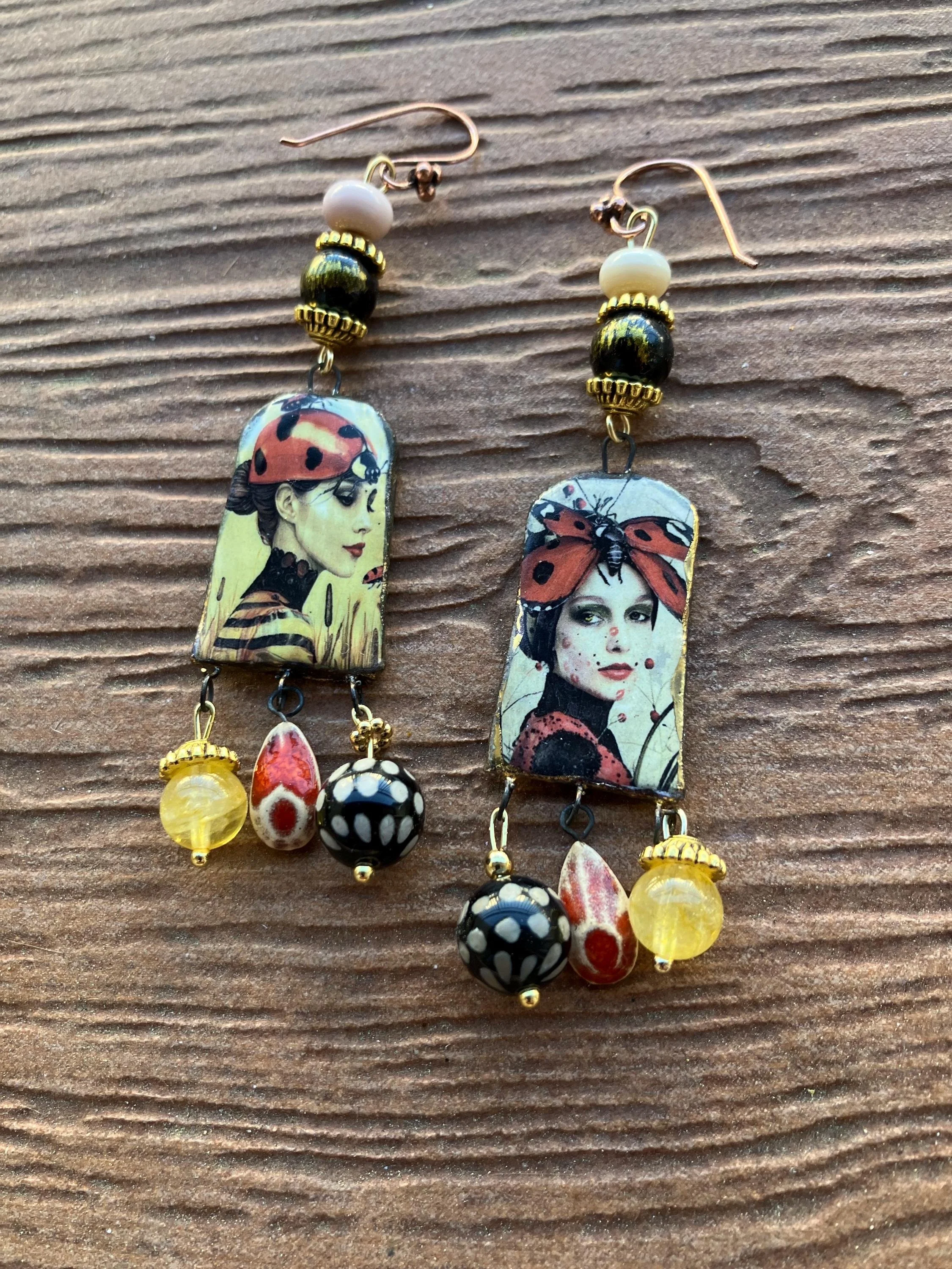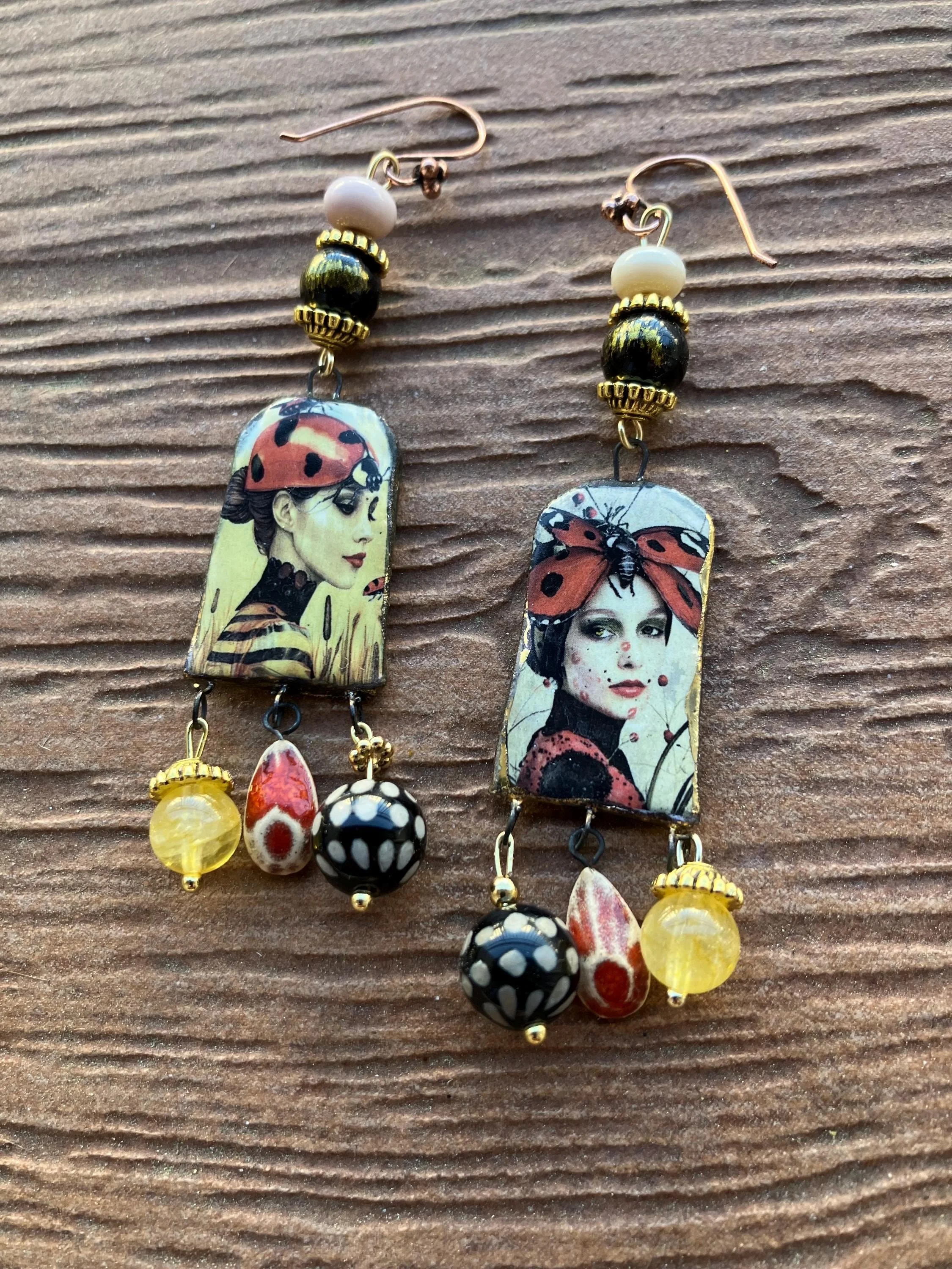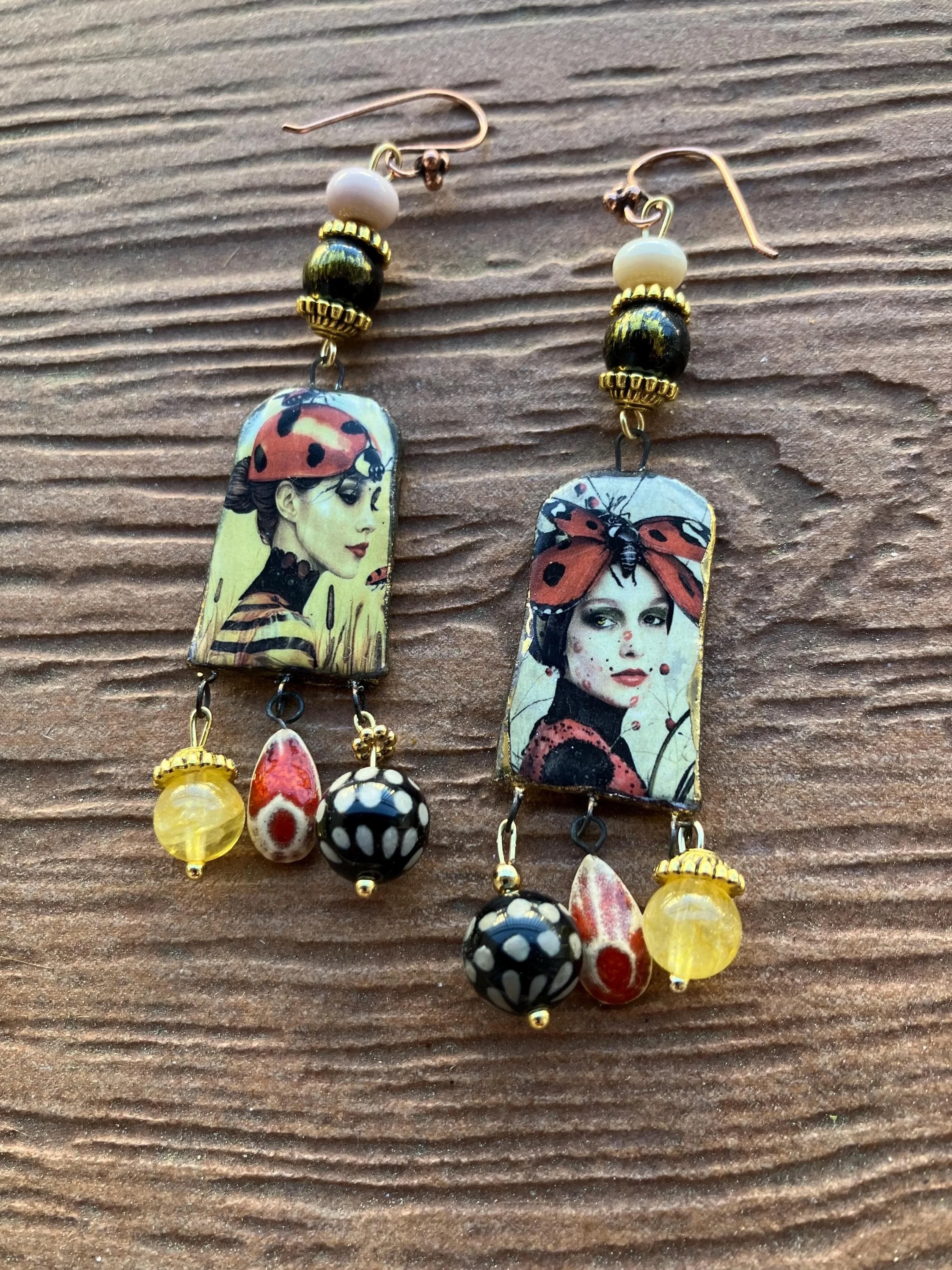 Boucles art deco en céramique d art, semi précieuse citrine et jade mashan