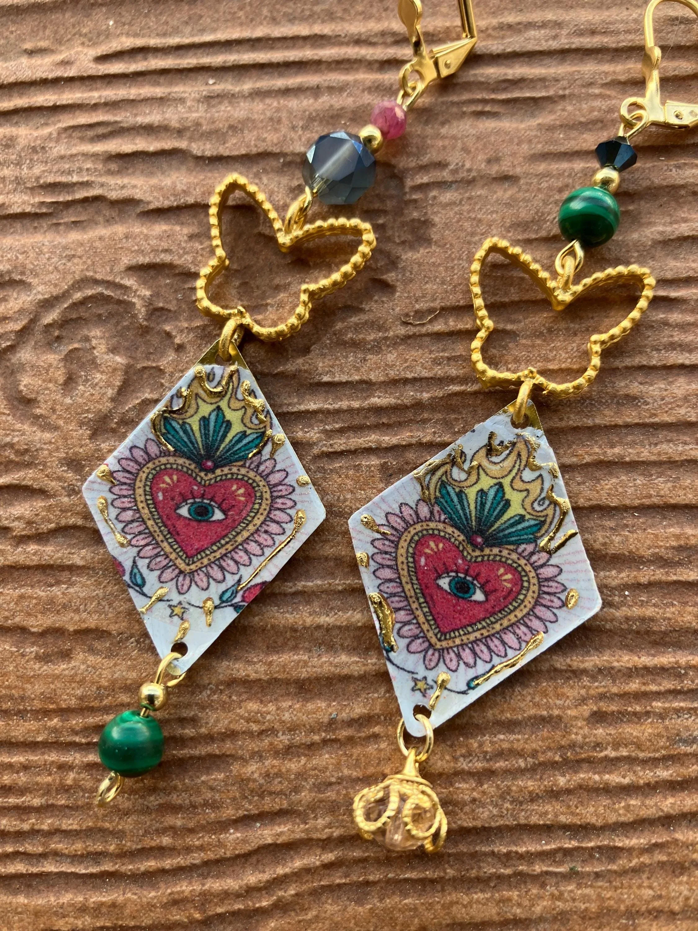 Magnifiques pendants losange en laiton peint représentant un cœur réalisés par l artiste peintre Naelatelier