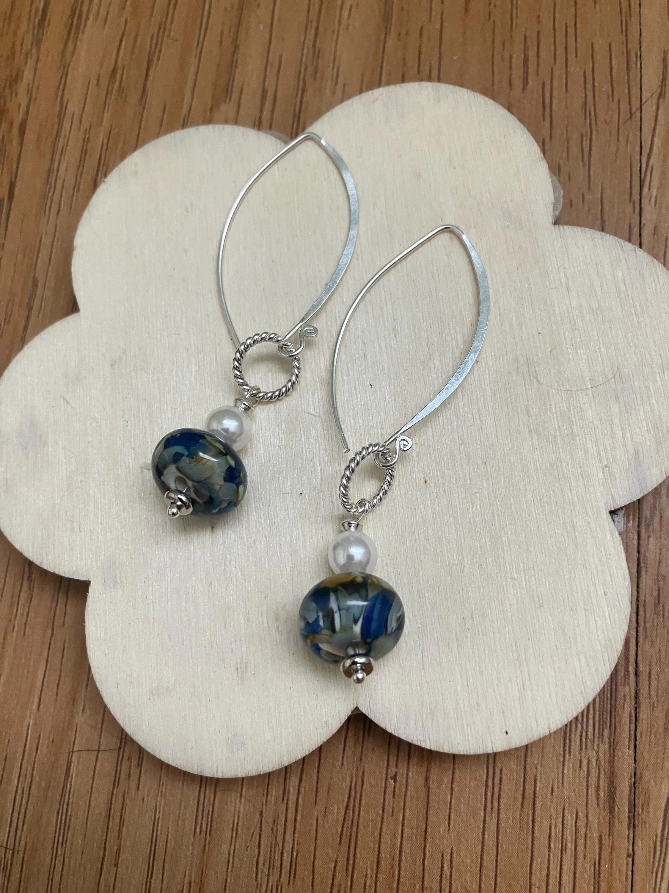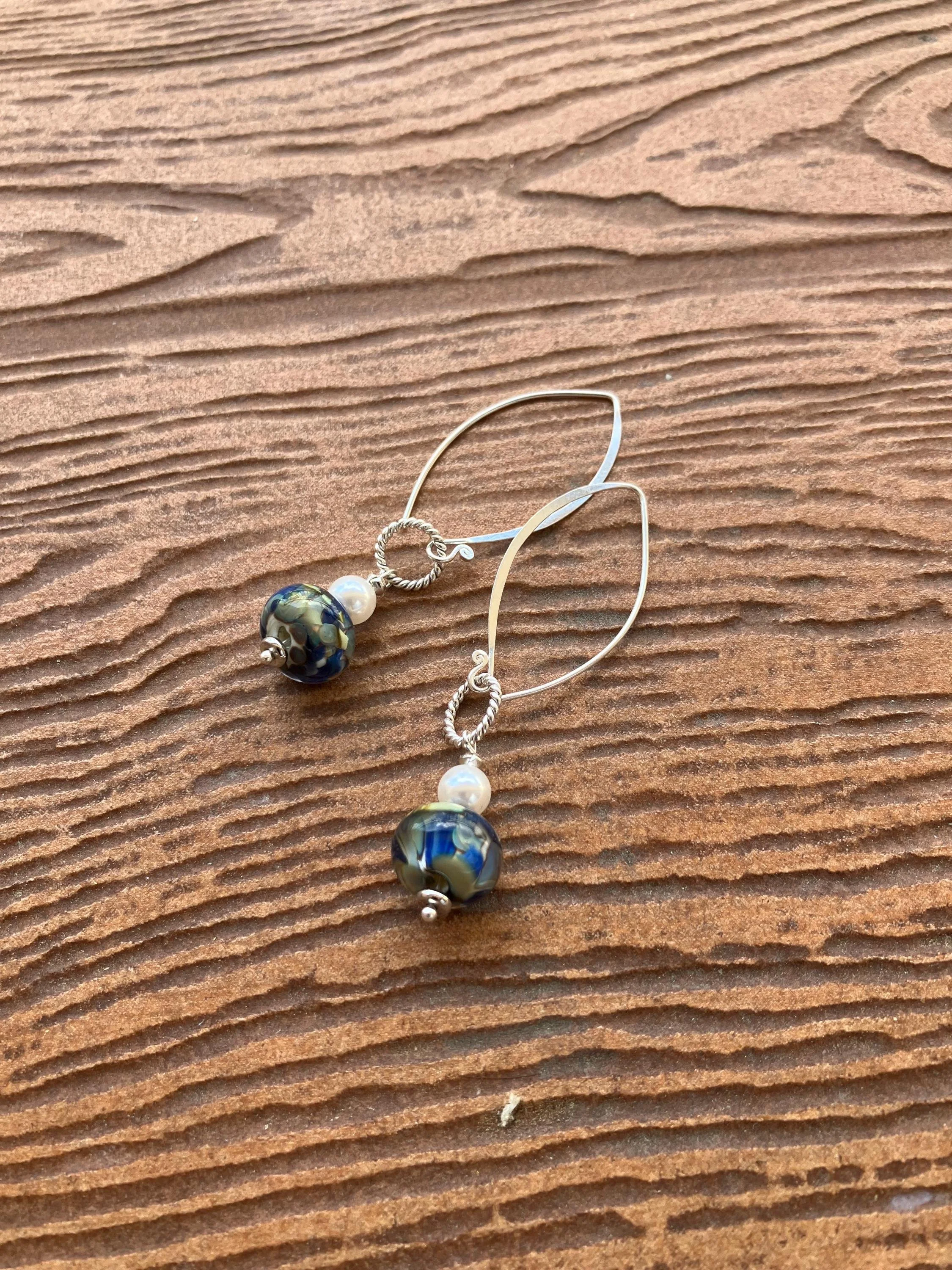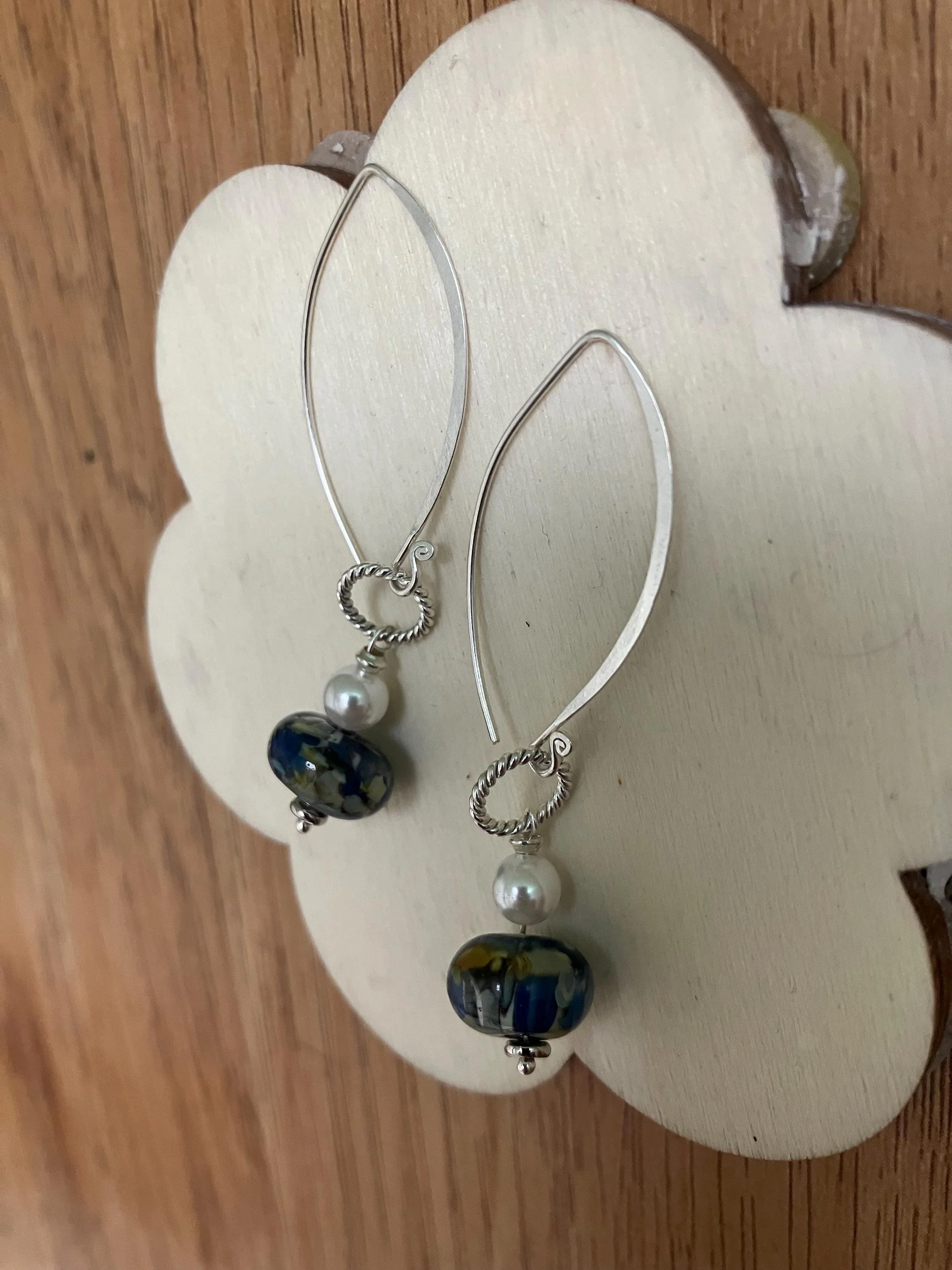 Boucles rétro chic composées De grands crochets en argent 925 D anneaux martèles en argent De superbes perles en verre filé au chalumeau bleu Perles de nacre blanches Swarovski