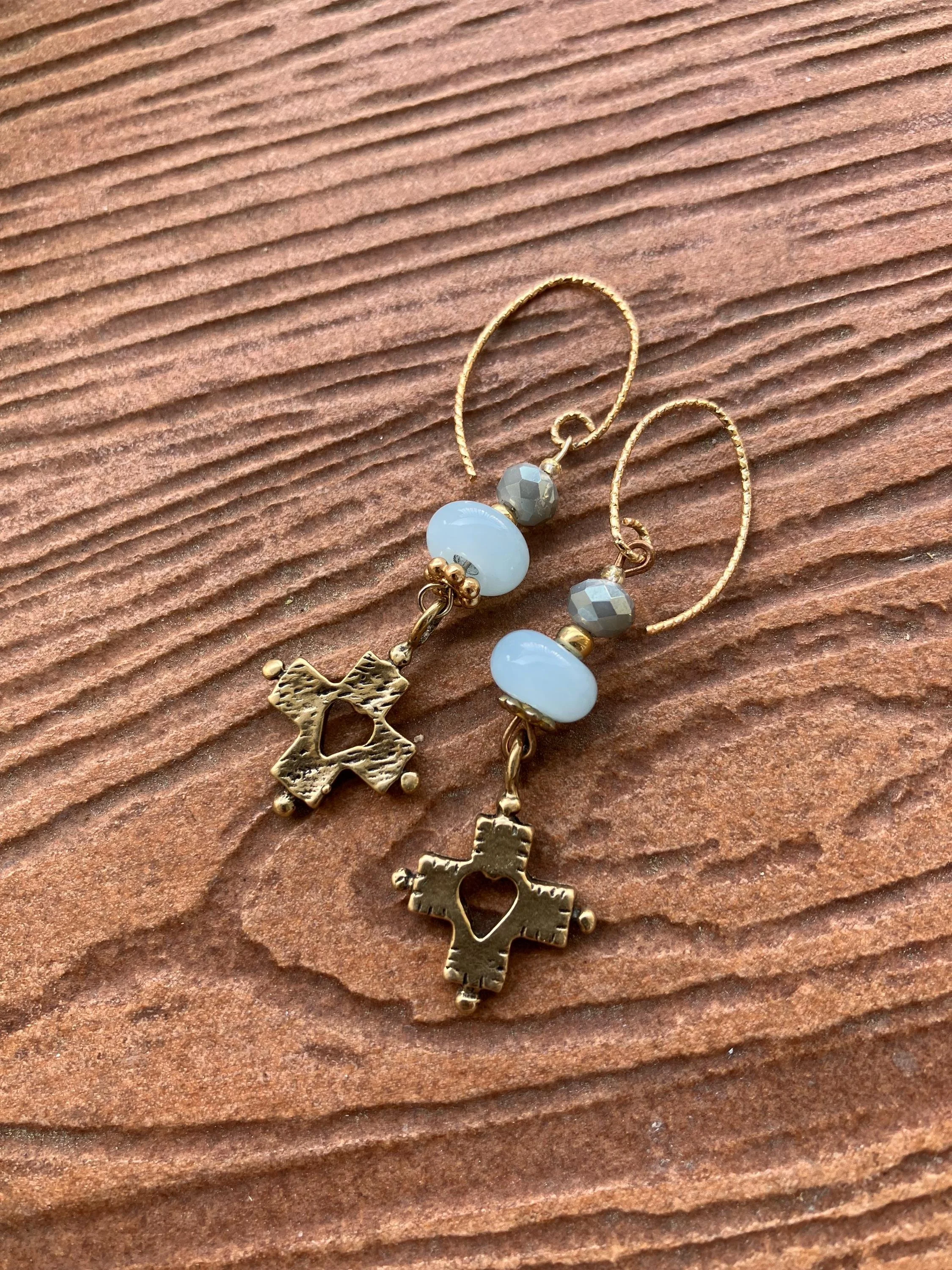 Boucles originales composées de crochets En plaqué or martèle Perles en verre irisé Perles en verre filé bleu clair Magnifiques pendants croix en bronze véritable