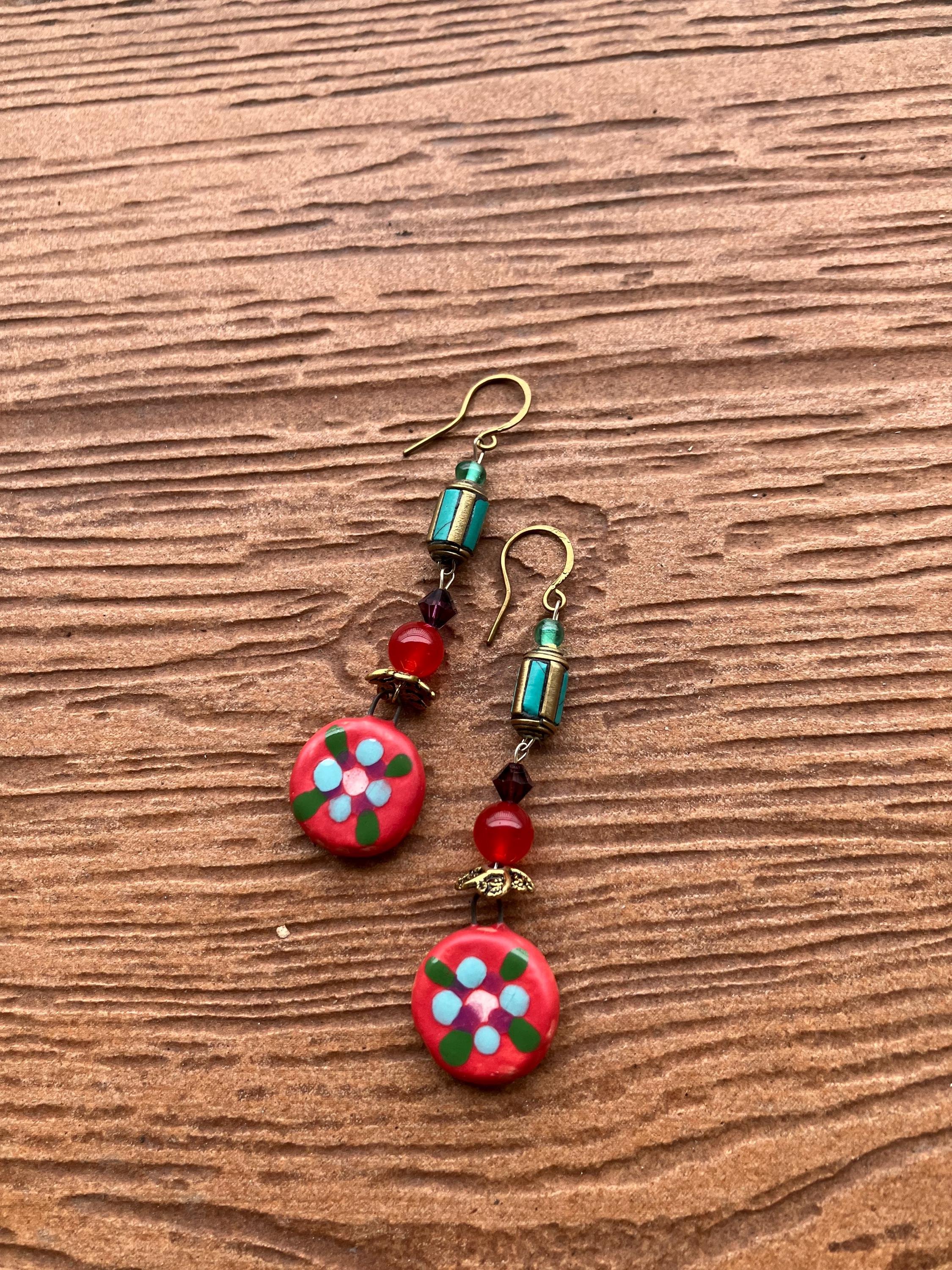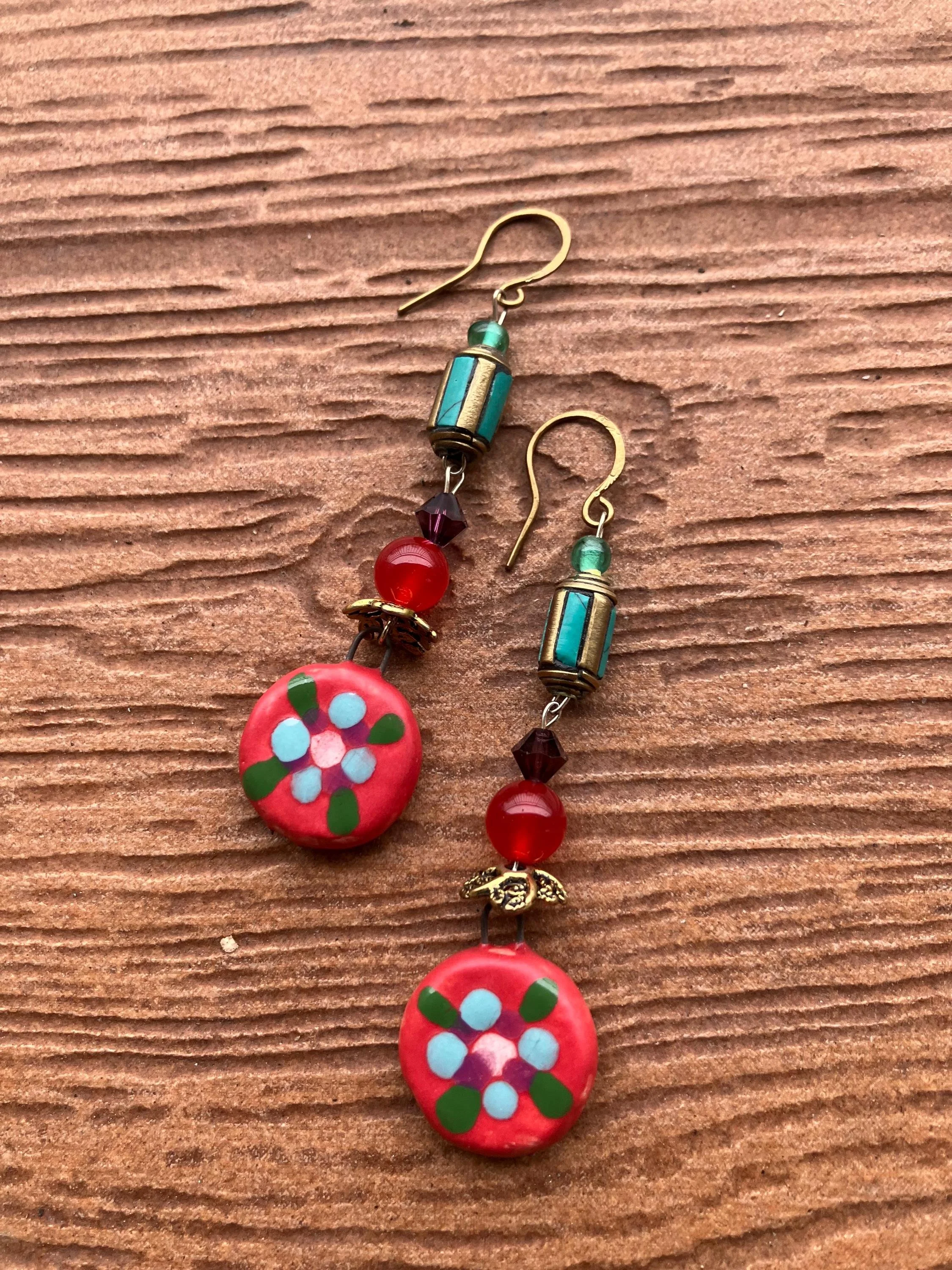 boucles ethniques chic en céramique artisanale peinte, semi précieuse cornaline, perle ethnique, cristal Swarovski et crochets fait main