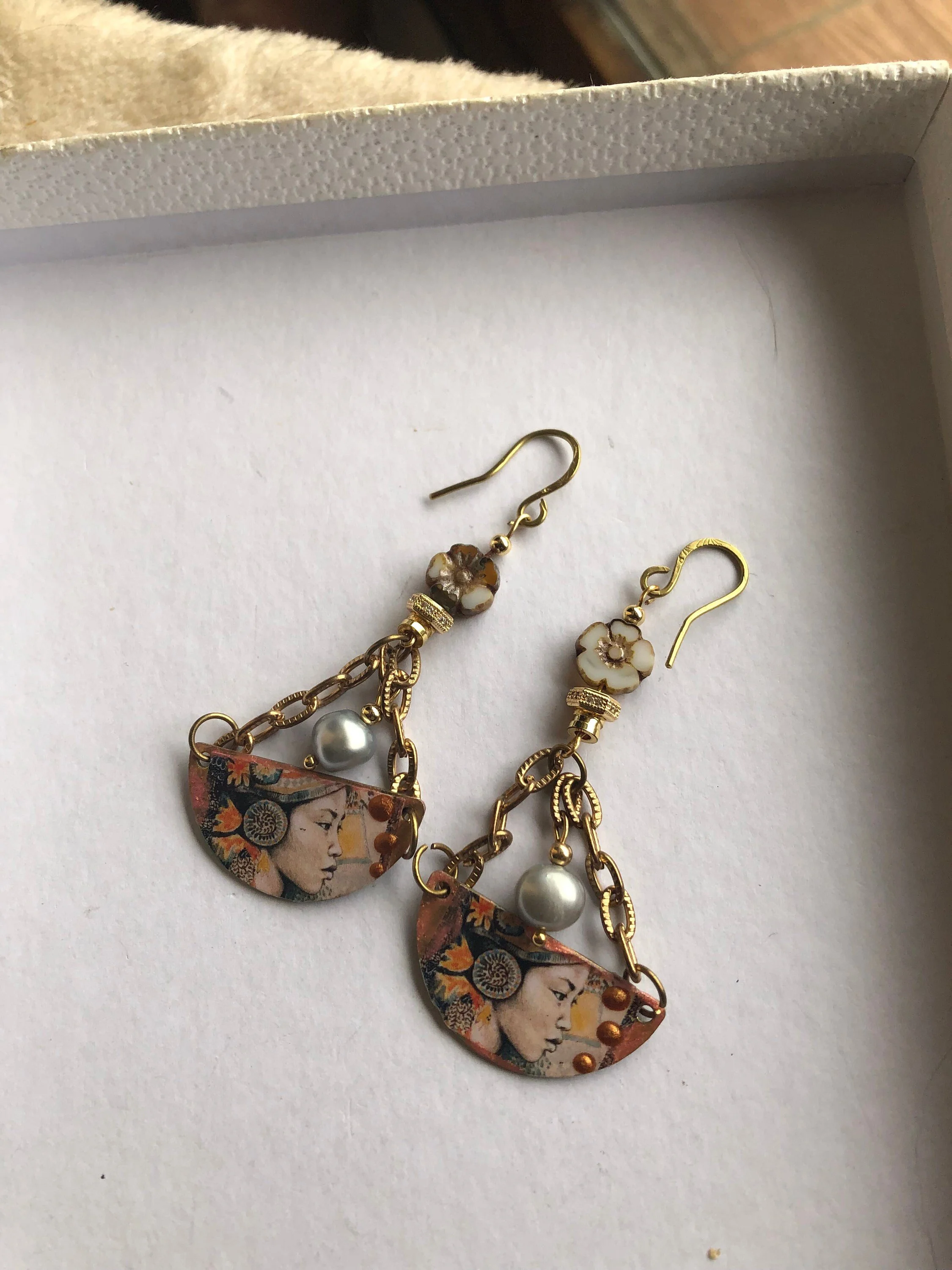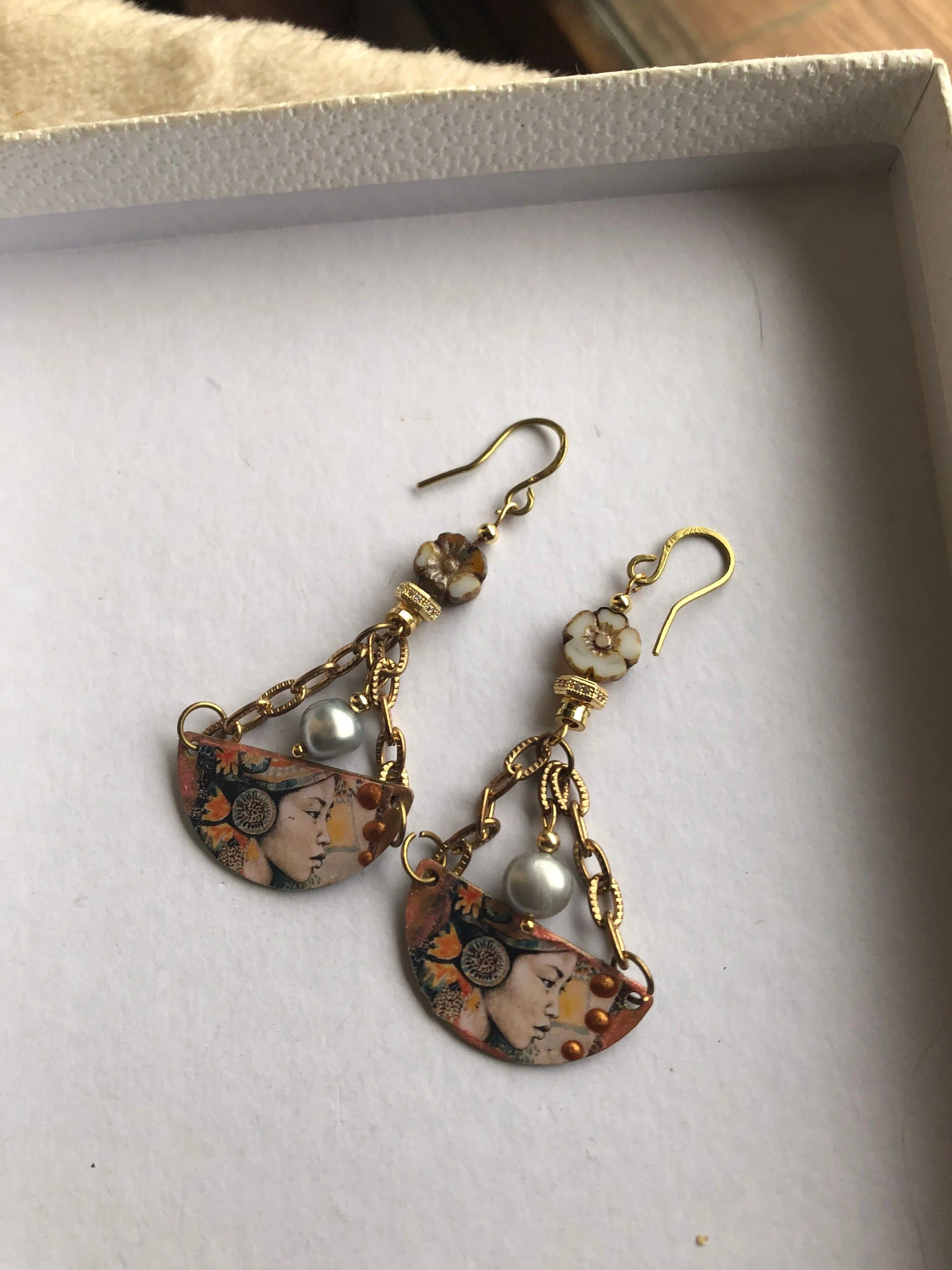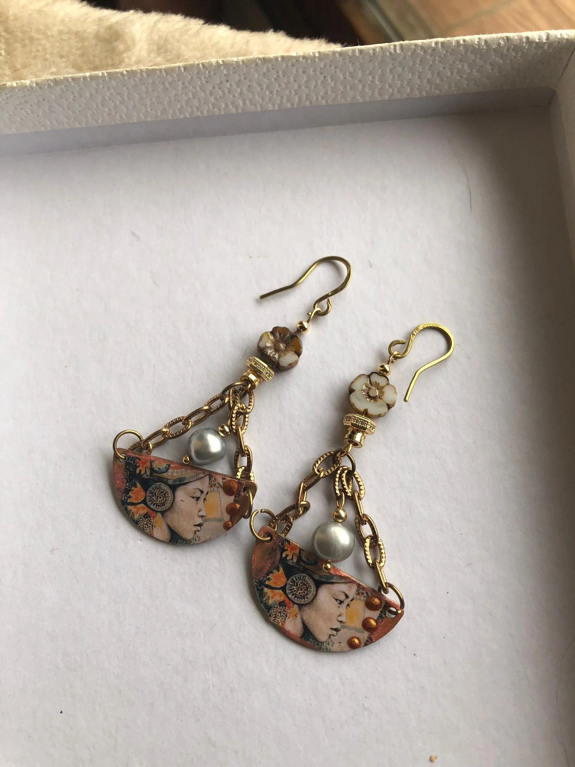 Cathynature-bijoux › Boucles japonisantes fleuries Image 1 sur 3 Image 2 sur 3 Image 3 sur 3 Boucles japonisantes fleuries 26,00 € épuisé Magnifique paire de boucle d oreille japonisantes ComposéesDe pendants demi lune en laiton customises représentant le visage d une japonaise Perles véritables d eau douce gris clair Chaîne maille en acier inoxydable Intercalaires plaque or et strass Fleur en verre tchèque Picasso Crochets fait main en laiton brut martèle Modèle unique Épuisé Ajout effectué ! Magnifique paire de boucle d oreille japonisantes ComposéesDe pendants demi lune en laiton customises représentant le visage d une japonaise Perles véritables d eau douce gris clair Chaîne maille en acier inoxydable Intercalaires plaque or et strass Fleur en verre tchèque Picasso Crochets fait main en laiton brut martèle Modèle unique