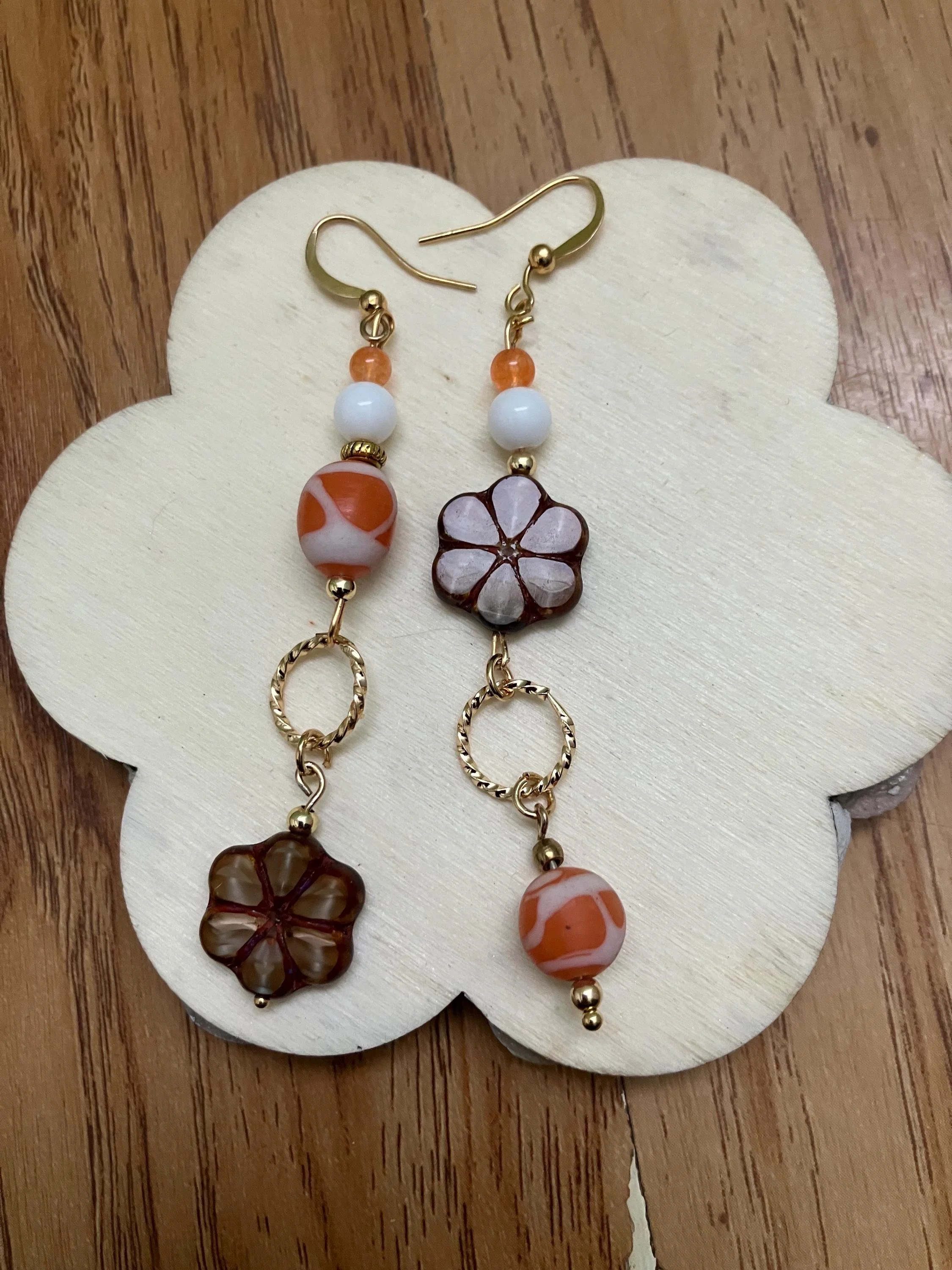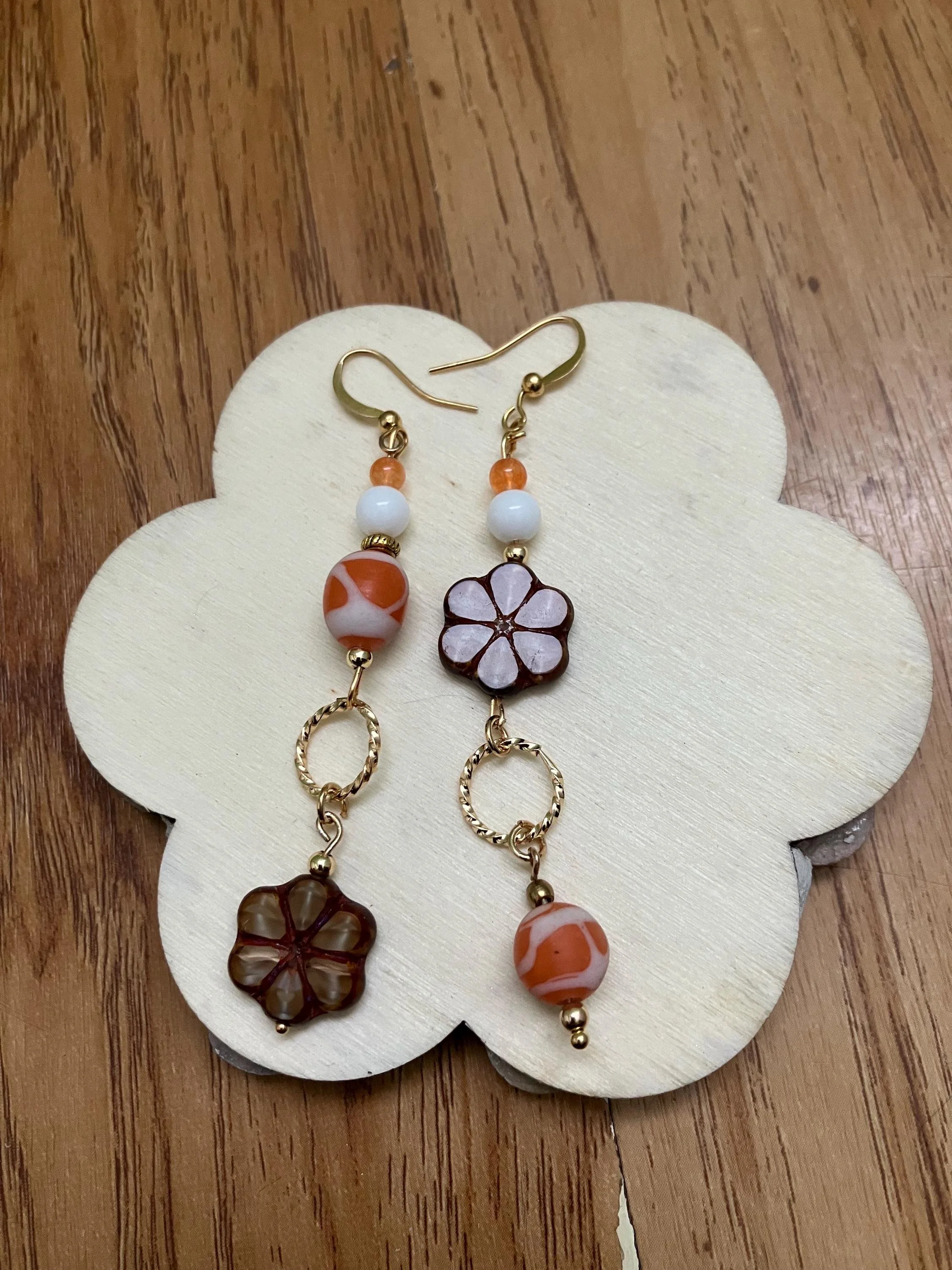 Composées de Crochets en plaqué or Perles fleur orange irisées en verre tchèque Anneaux martèles en plaqué or Perles originales ethniques en verre Perles blanches en verre indien Perles oranges transparentes en verre indien