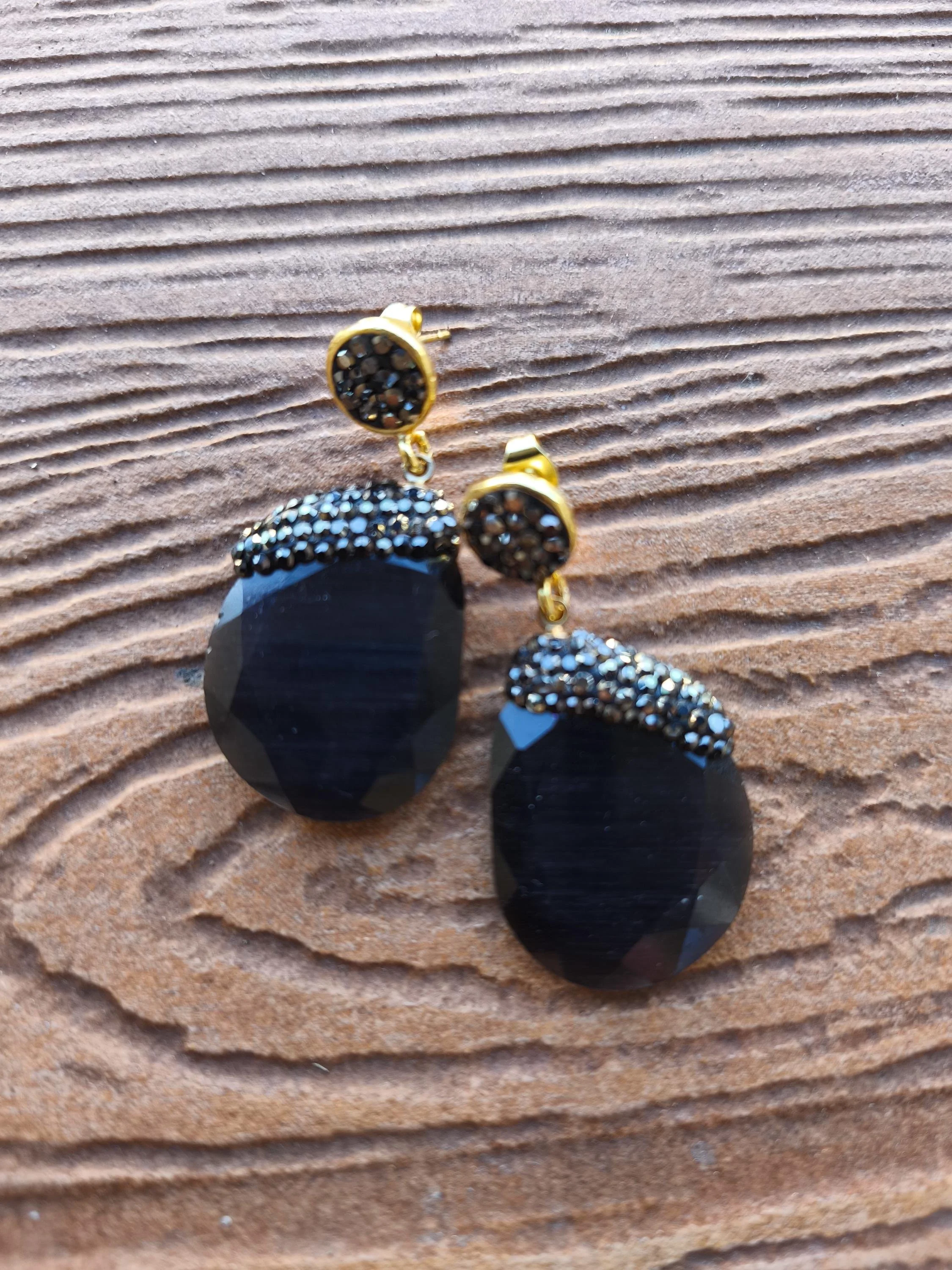 Composée de puces en plaqué or et strass Magnifiques pendants en laiton doré à l or fin sertis de superbes perles semi précieuse en quartz oeil de chat noir
