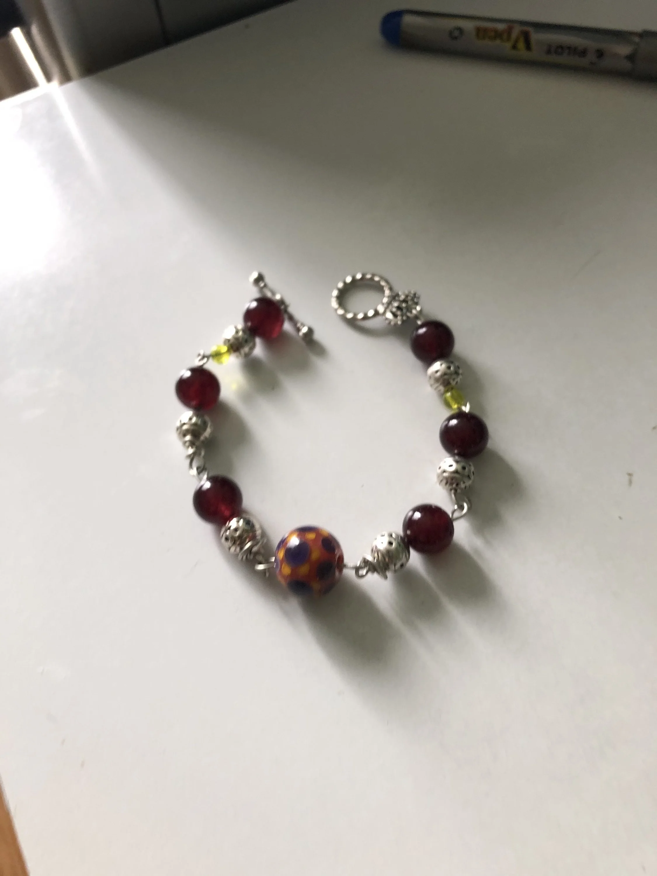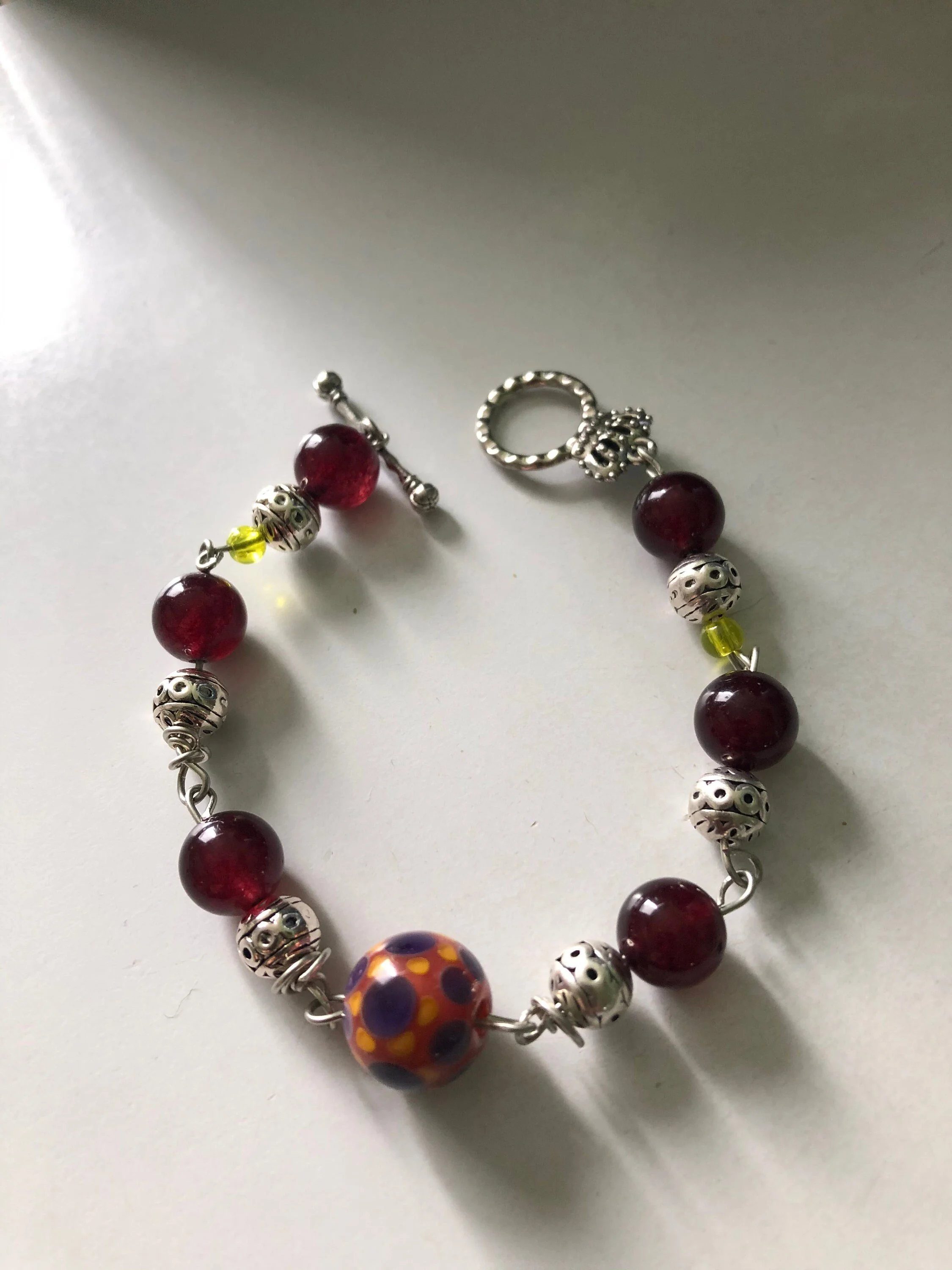 Cathynature-bijoux › Bracelet bohème chic, bracelet semi précieuses grenat et jaune Image 1 sur 4 Image 2 sur 4 Image 3 sur 4 Image 4 sur 4 Bracelet bohème chic, bracelet semi précieuses grenat et jaune 16,00 € épuisé Vends un joli bracelet composé de Splendides perles semi précieuses de 10mm chacune en jade grenat Perles en argent antique ethniquePerles enVerre indien Fermoir toggle couronne en plaque argent Grosse perle originale en verre file au chalumeau Monte sur du fil de cuivre artistique Modèle unique Mesure 19 cm Épuisé Ajout effectué ! Vends un joli bracelet composé de Splendides perles semi précieuses de 10mm chacune en jade grenat Perles en argent antique ethniquePerles enVerre indien Fermoir toggle couronne en plaque argent Grosse perle originale en verre file au chalumeau Monte sur du fil de cuivre artistique Modèle unique Mesure 19 cm