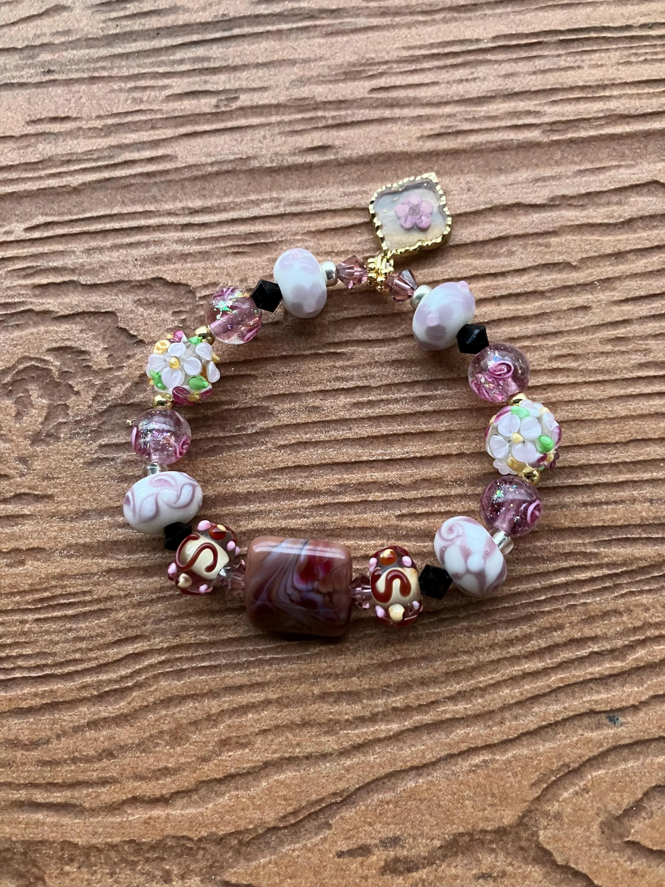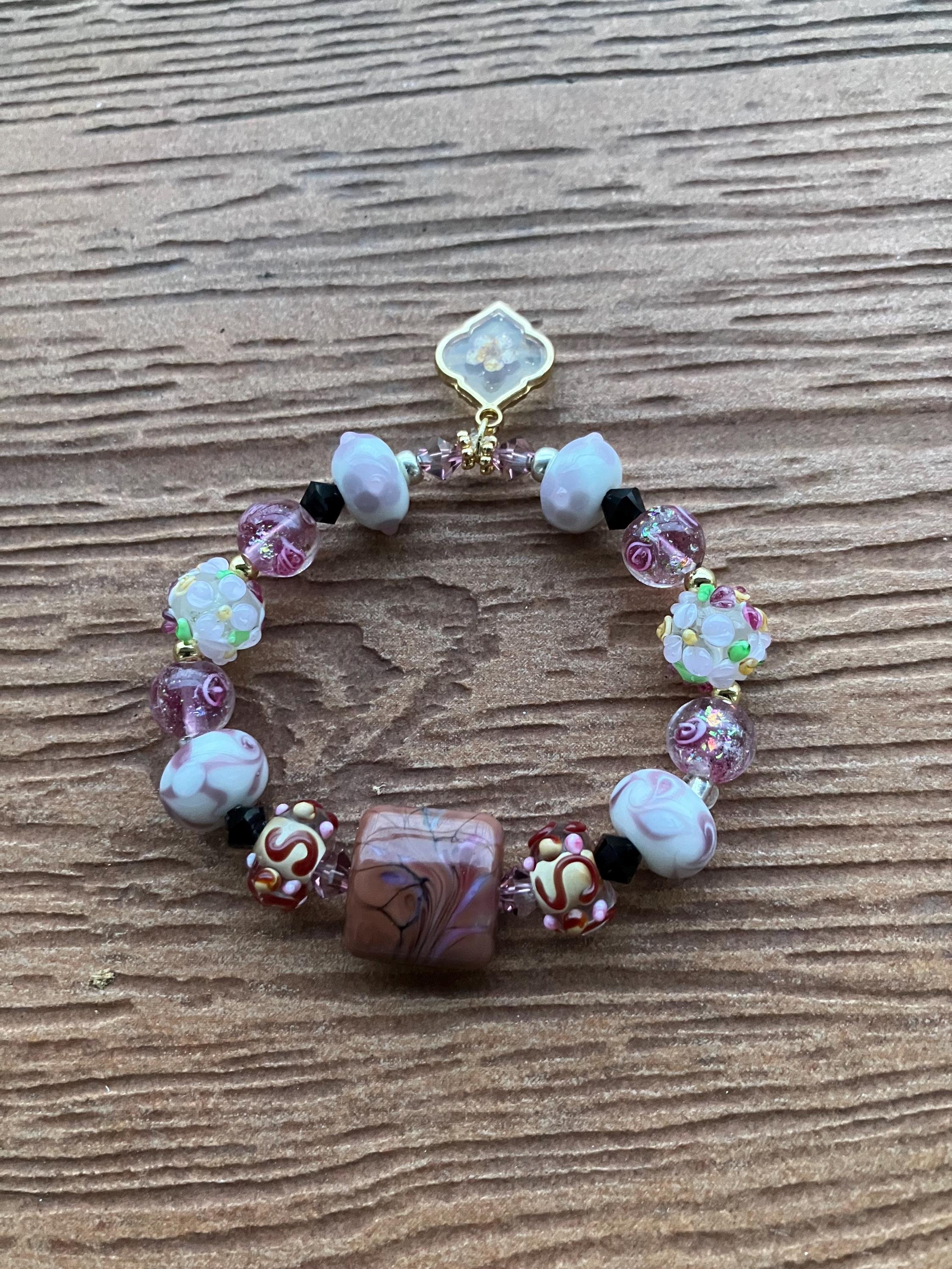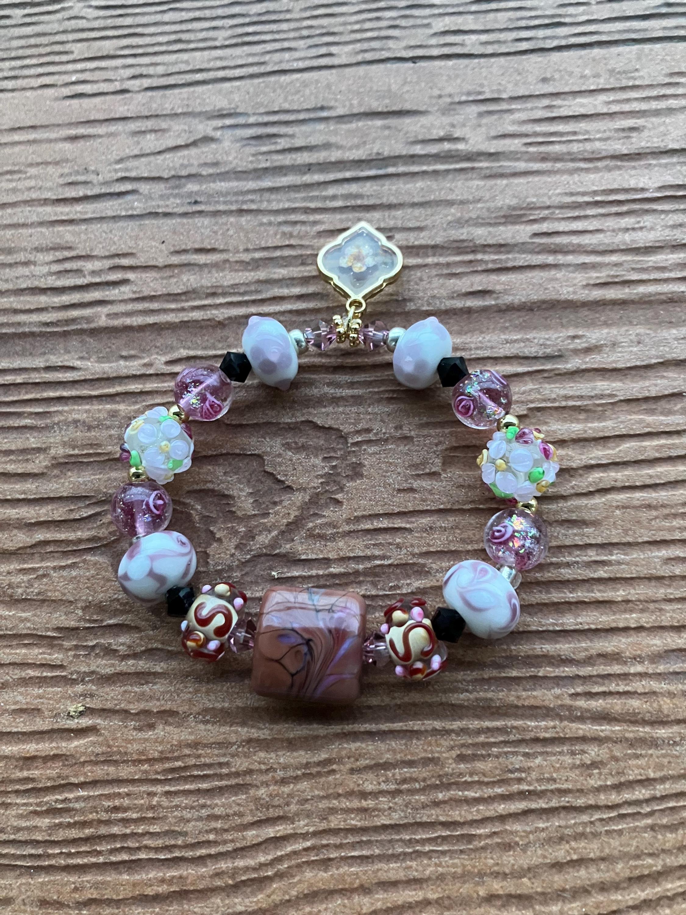 Bracelet bohème romantique rose marron lavande en perles de lampe, cristal Swarovski et plaqué or