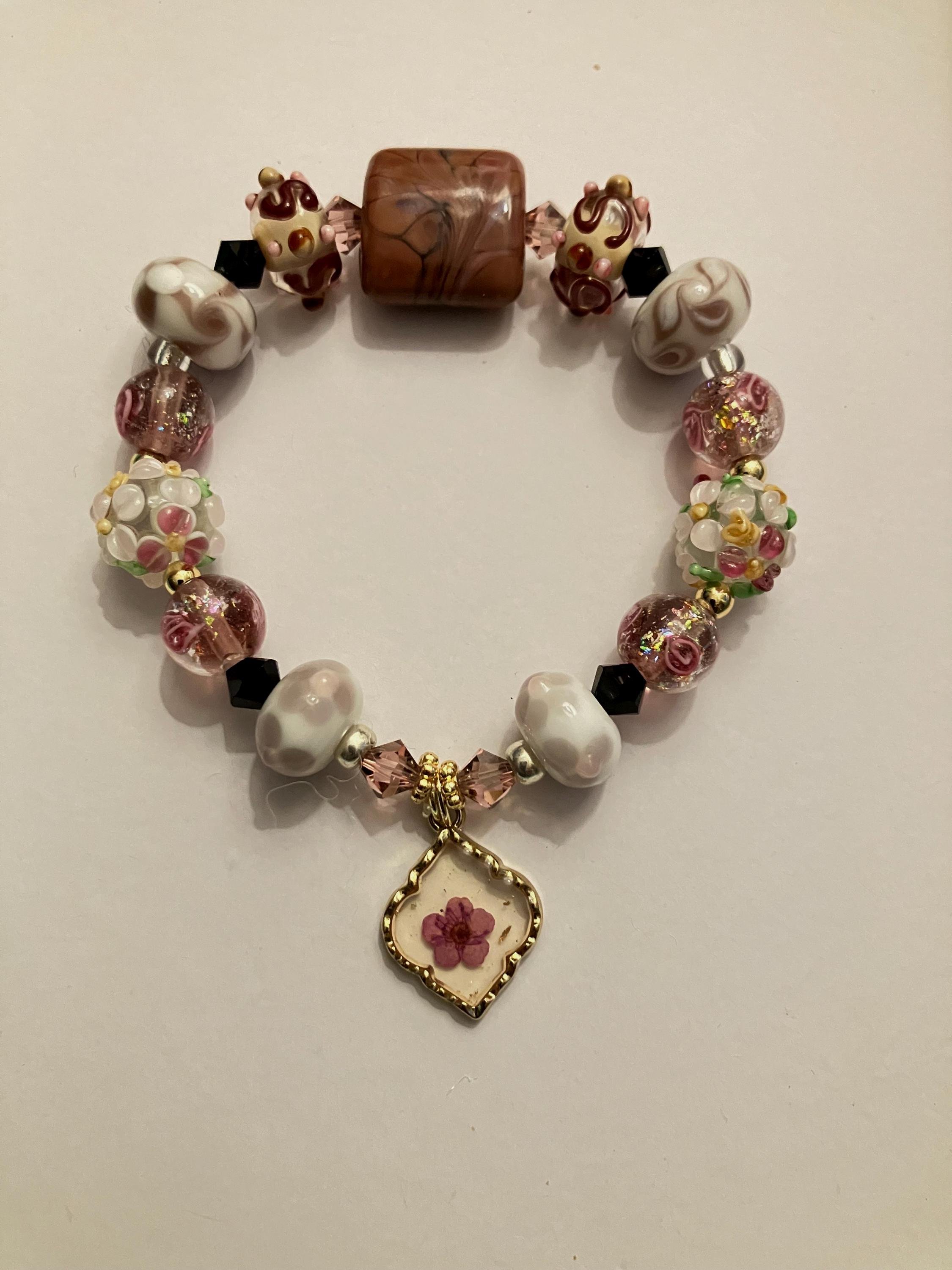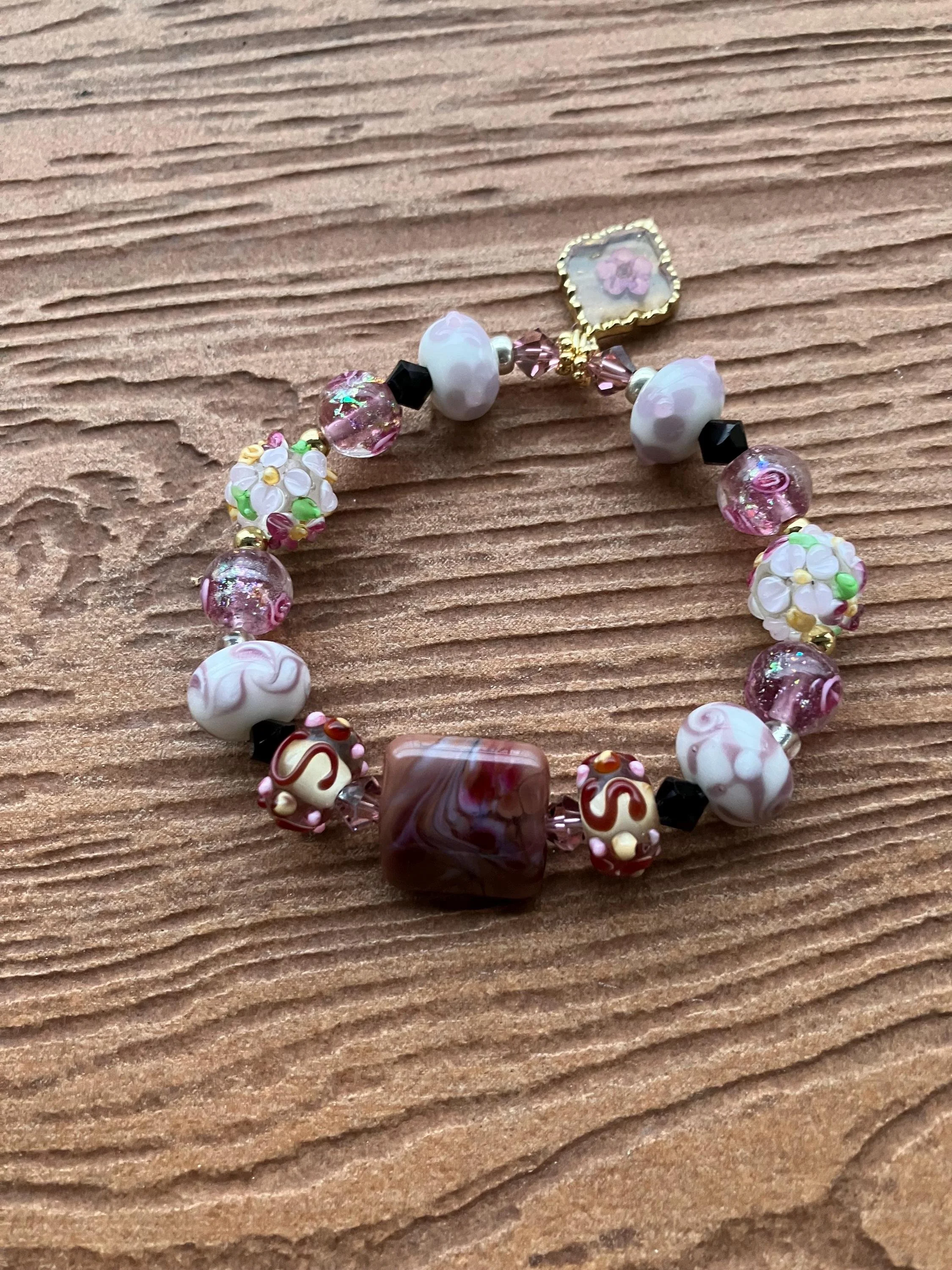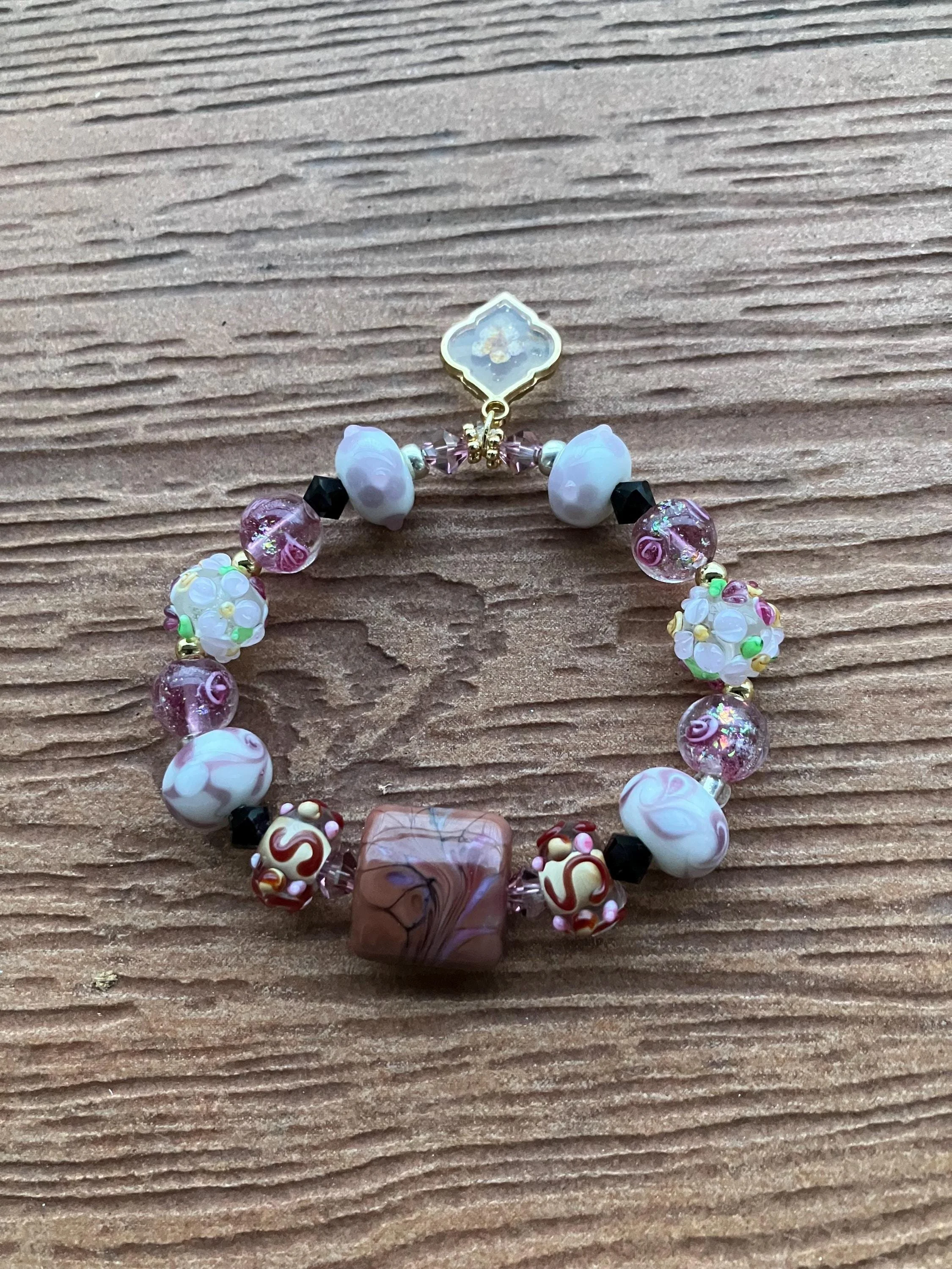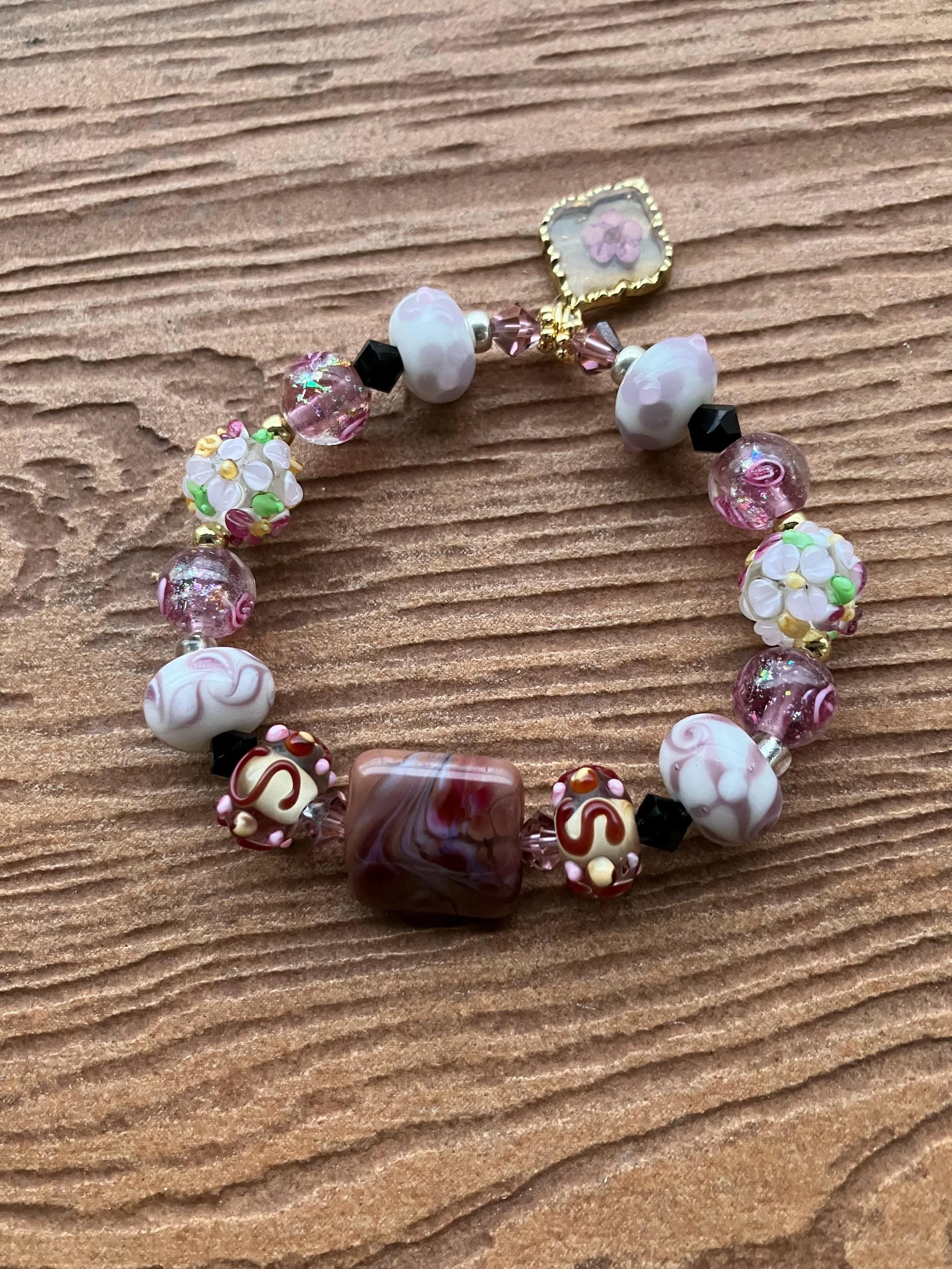 Bracelet bohème romantique rose marron lavande en perles de lampe, cristal Swarovski et plaqué or