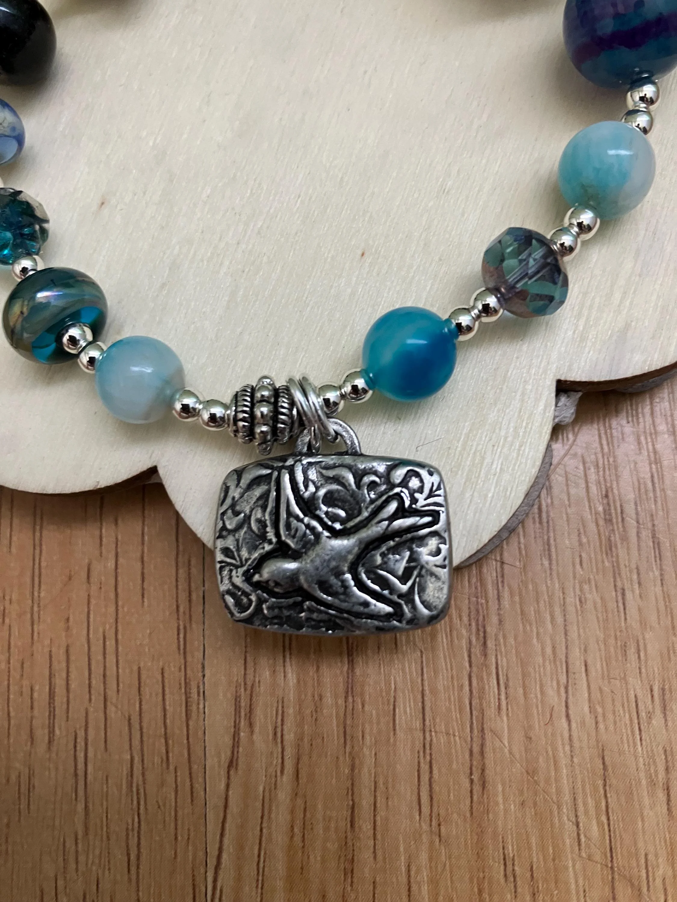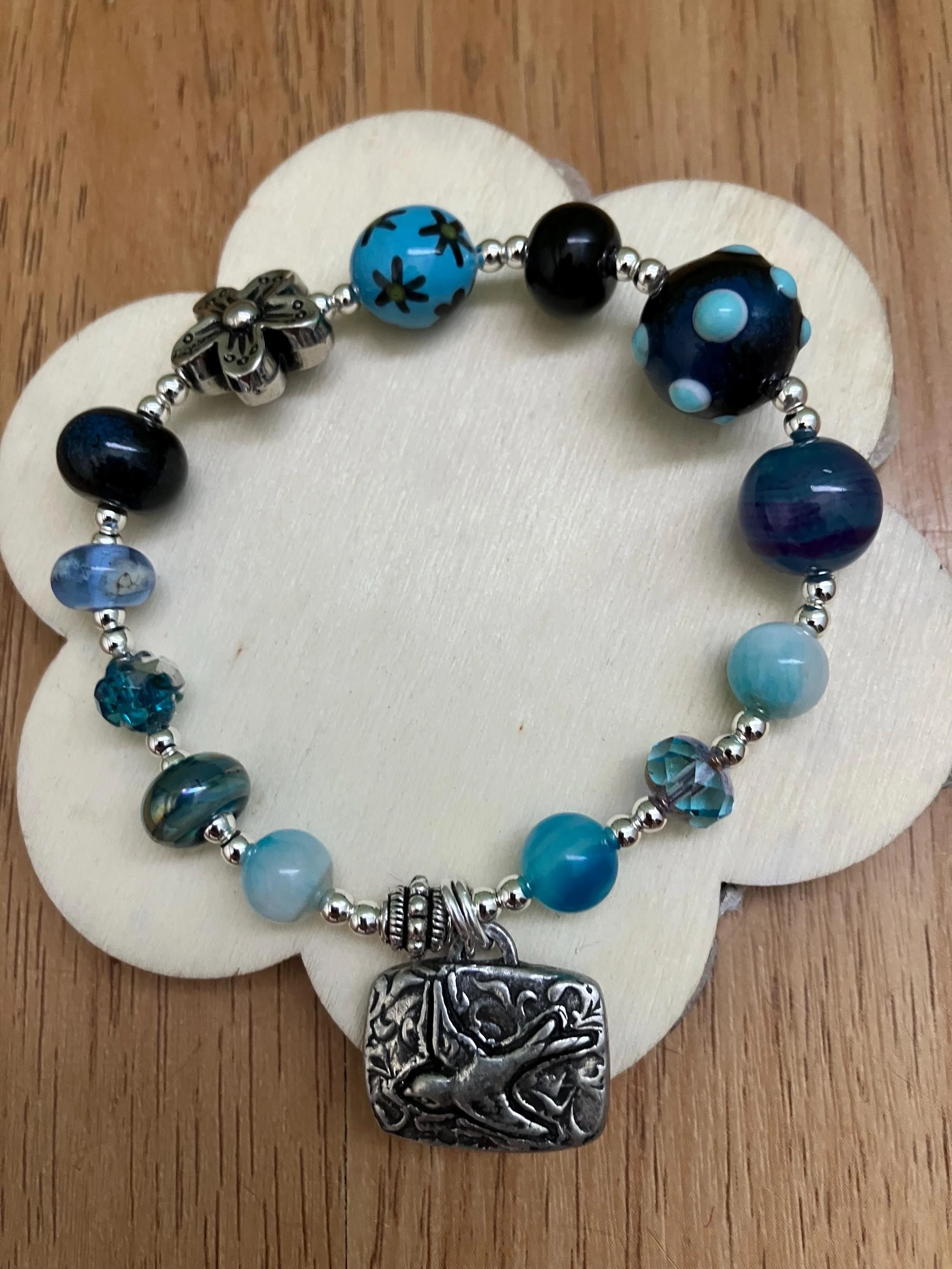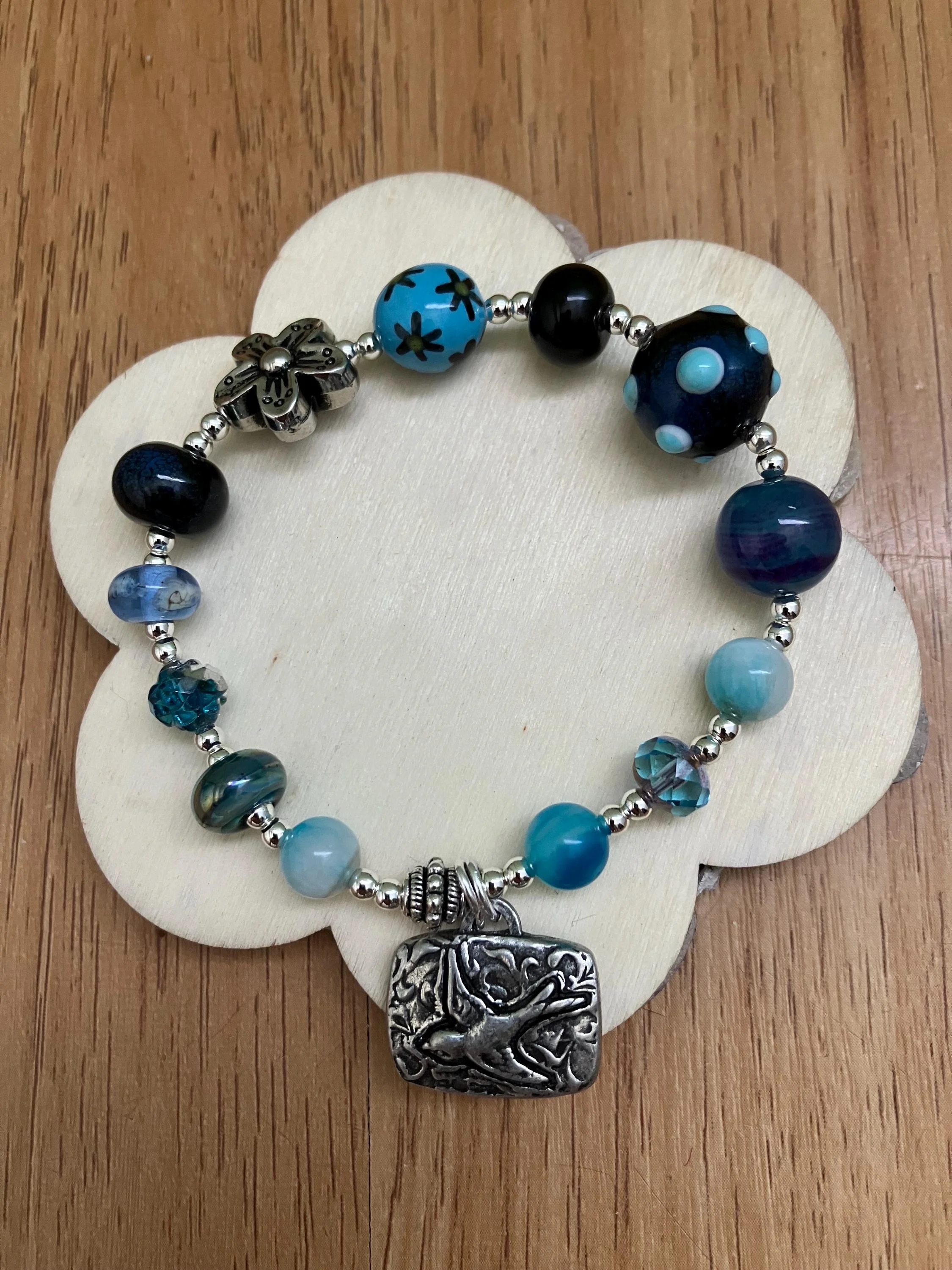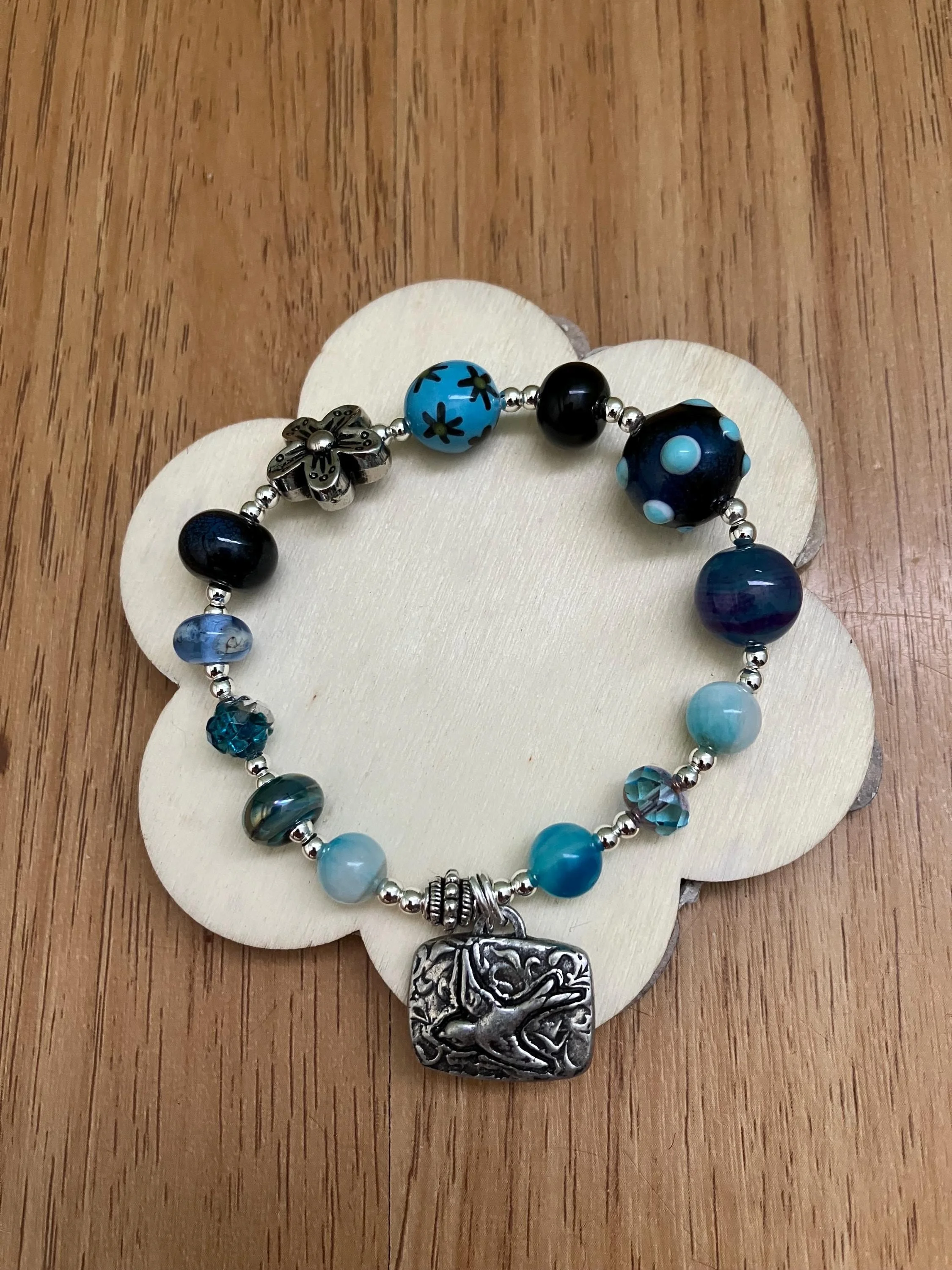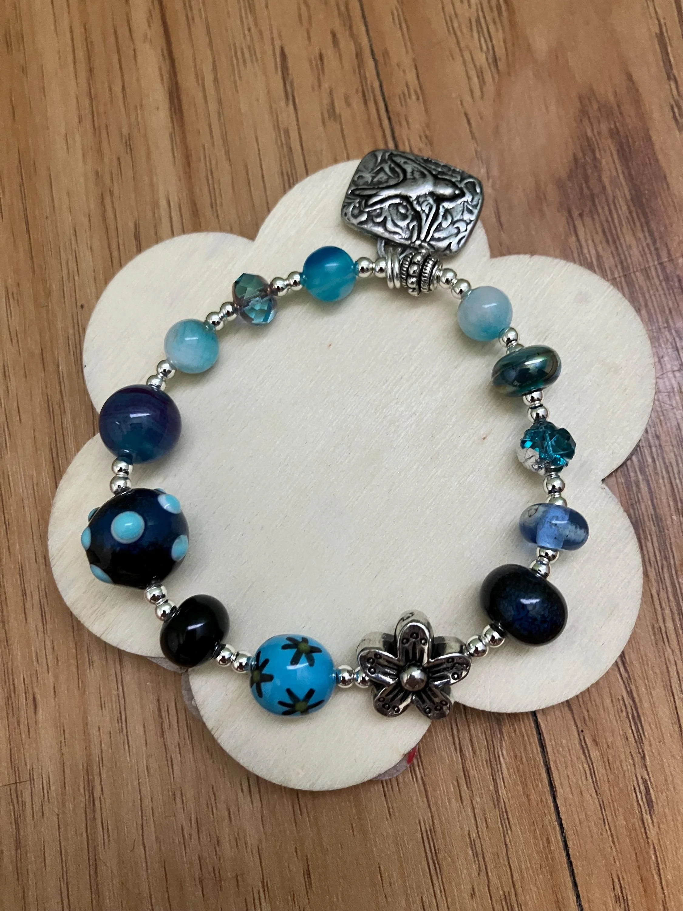 Cathynature-bijoux › Bracelet, bracelet aux tons bleus vert, verre filé d art, semi précieuse, étain massif Image 1 sur 6 Image 2 sur 6 Image 3 sur 6 Image 4 sur 6 Image 5 sur 6 Image 6 sur 6 Bracelet, bracelet aux tons bleus vert, verre filé d art, semi précieuse, étain massif 37,00 € Bracelet aux tons bleus de 20 cm monté sur élastique Composé De plusieurs perles en verre filé au chalumeau de différentes tailles et aspects dans les tons bleus De différentes perles semi précieuse en agate bleu violet, jade bleu orange De perles toupies en verre tchèque iriséD une perle fleur en métal argent antique D un magnifique charm en étain massif représentant une hirondelle Acheter Ajout effectué ! Bracelet aux tons bleus de 20 cm monté sur élastique Composé De plusieurs perles en verre filé au chalumeau de différentes tailles et aspects dans les tons bleus De différentes perles semi précieuse en agate bleu violet, jade bleu orange De perles toupies en verre tchèque iriséD une perle fleur en métal argent antique D un magnifique charm en étain massif représentant une hirondelle