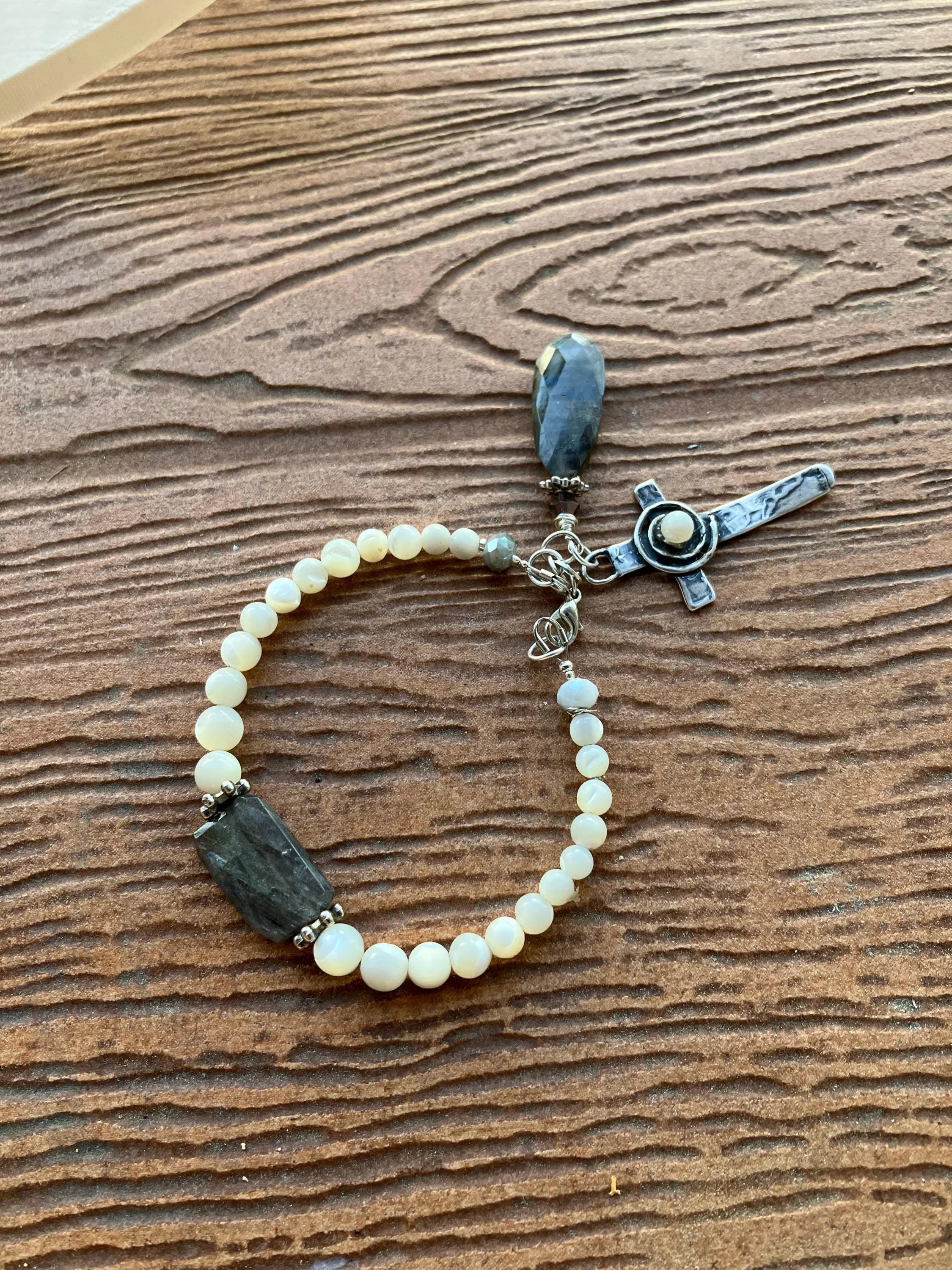 Bracelet chic de 20 cm composé de : - Perles naturelles en nacre véritable - Perle connecteur en semi précieuse labradorite - Superbe goutte en semi précieuse labradorite - Perles de verre tchèque irisé - Croix artisan martelé réalisé à la main en argent 925 oxydé, inscription verso Believe