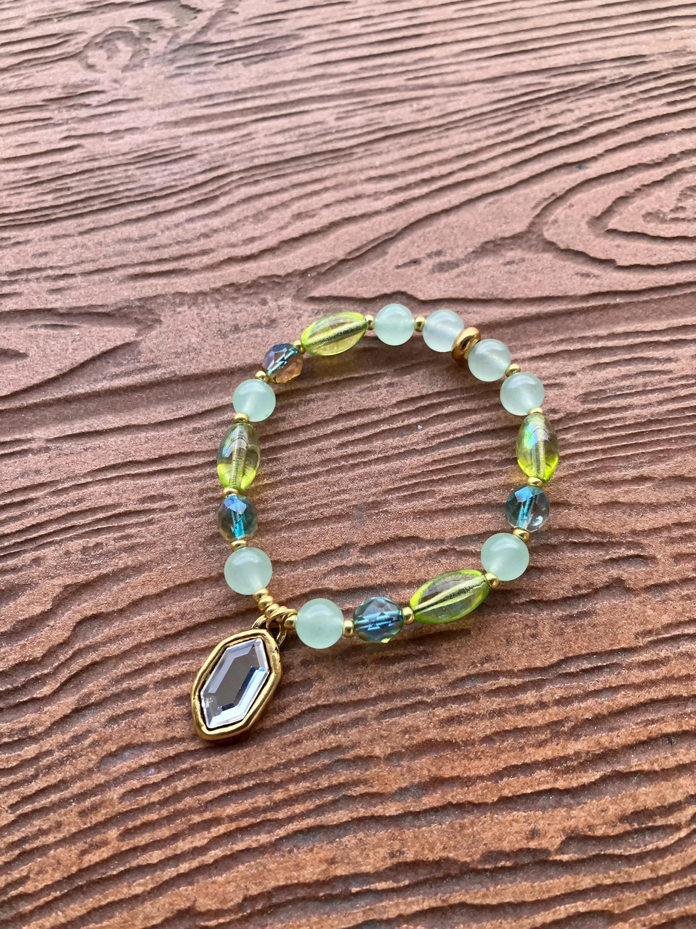 Joli bracelet de 19 cm monté sur élastique Composé De perles semi précieuse de 8 mm chacune en aventurine De perles tube verre pale en verre tchèque De perles bleu vert irisées en verre tchèque De perles de nacre dorées D un magnifique pendant en étain massif doré avec véritable cristal Swarovski