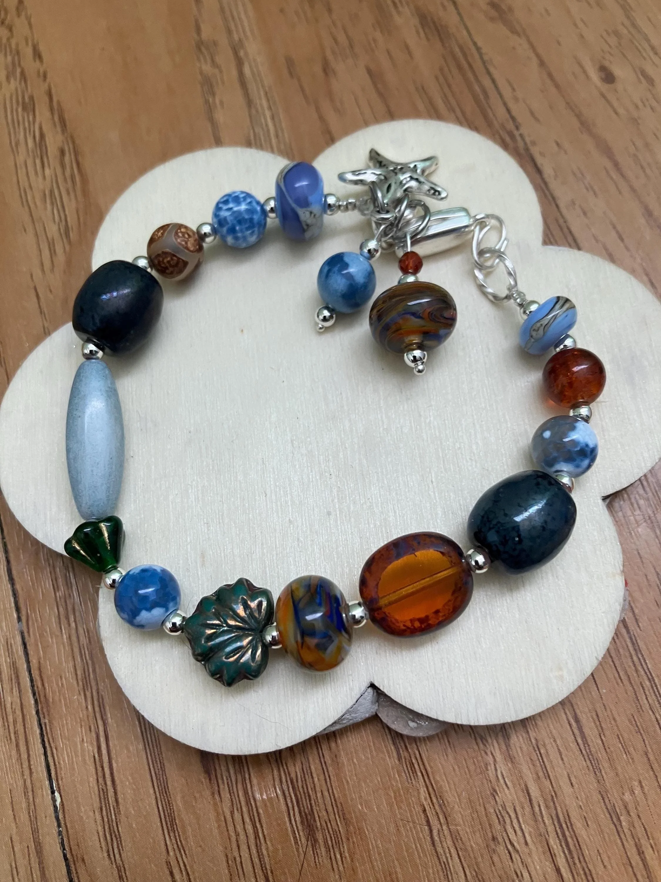 Bracelet, bracelet été, bleu, orange, semi precieuse, agate feu, agate tibétaine, verre filé d art