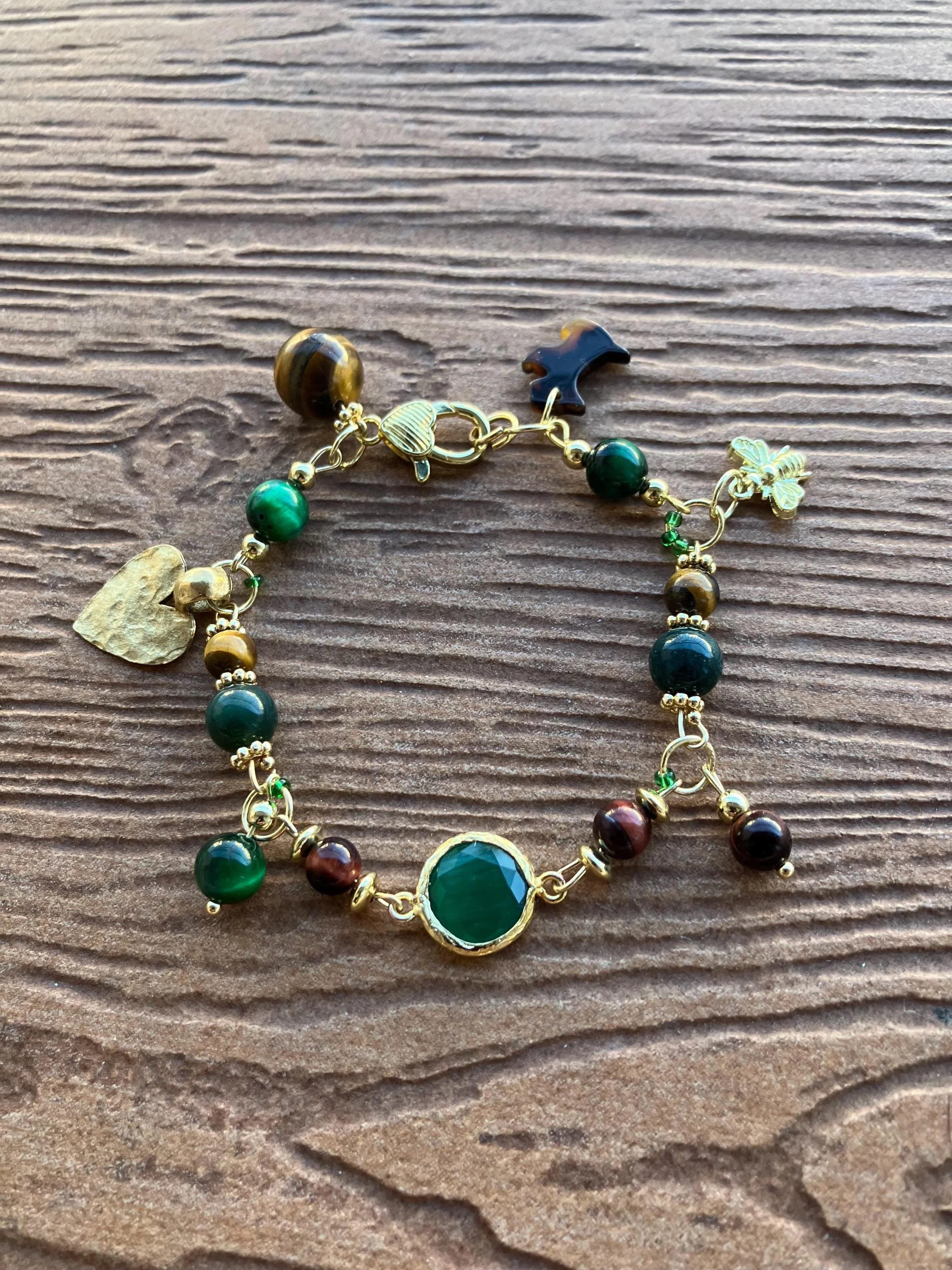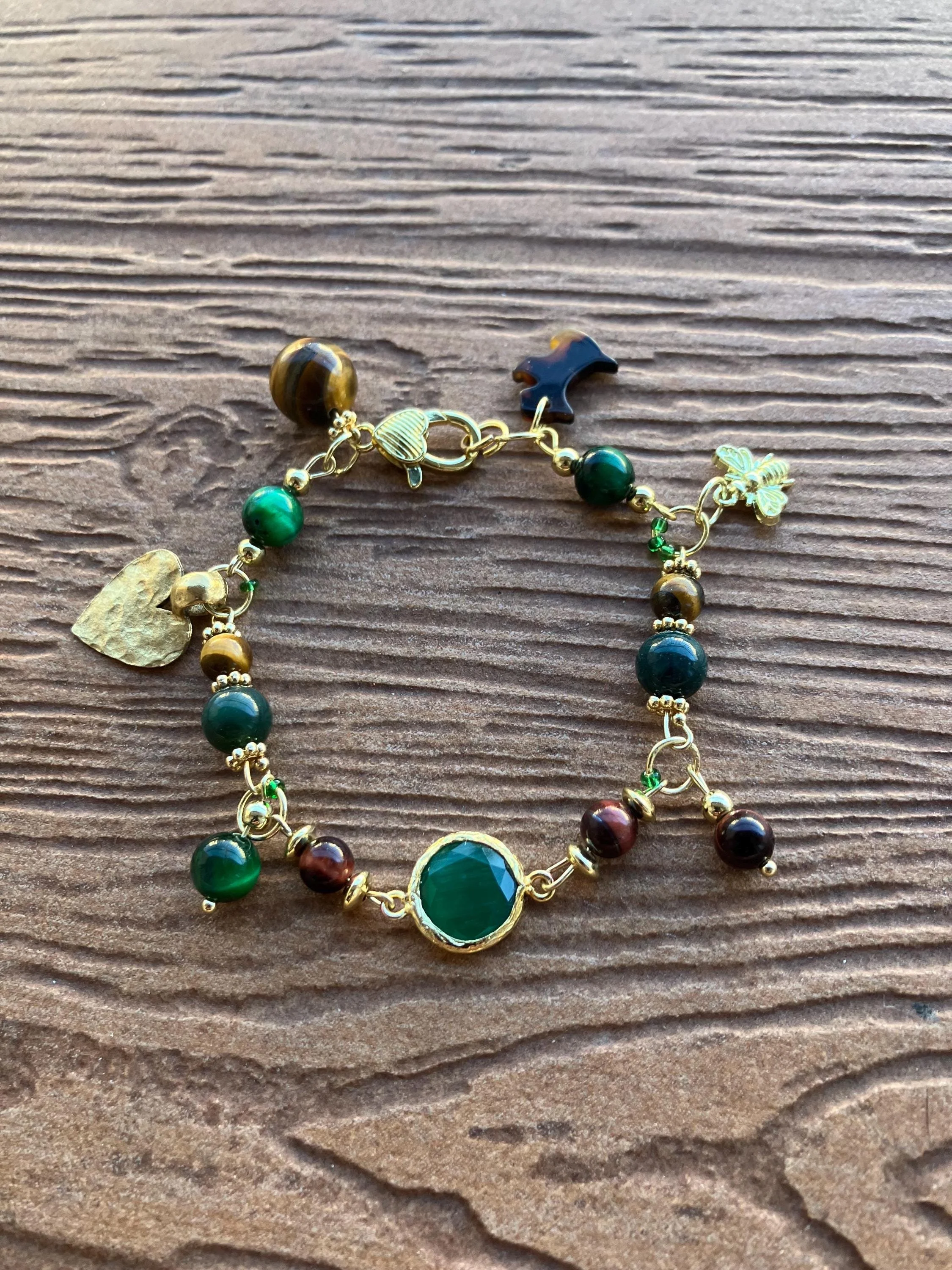 Cathynature-bijoux › Bracelet Charm pierres semi précieuse œil de tigre, malachite, jade et plaqué or Image 1 sur 3 Image 2 sur 3 Image 3 sur 3 Bracelet Charm pierres semi précieuse œil de tigre, malachite, jade et plaqué or 45,00 € Joli bracelet de 20 cm Composé de Pierres semi précieuse de différentes tailles En œil de tigre En malachite En jade vert Connecteurs et intercalaires en plaqué or Perles tube transparentes vertes en rocaille Charm cœur en acier plaqué or martelé Charm chien en résine acétate Charm abeille en laiton doré à l or finconnecteur central en cristal vert dans sa lunette en plaqué or Acheter Ajout effectué ! Joli bracelet de 20 cm Composé de Pierres semi précieuse de différentes tailles En œil de tigre En malachite En jade vert Connecteurs et intercalaires en plaqué or Perles tube transparentes vertes en rocaille Charm cœur en acier plaqué or martelé Charm chien en résine acétate Charm abeille en laiton doré à l or finconnecteur central en cristal vert dans sa lunette en plaqué or