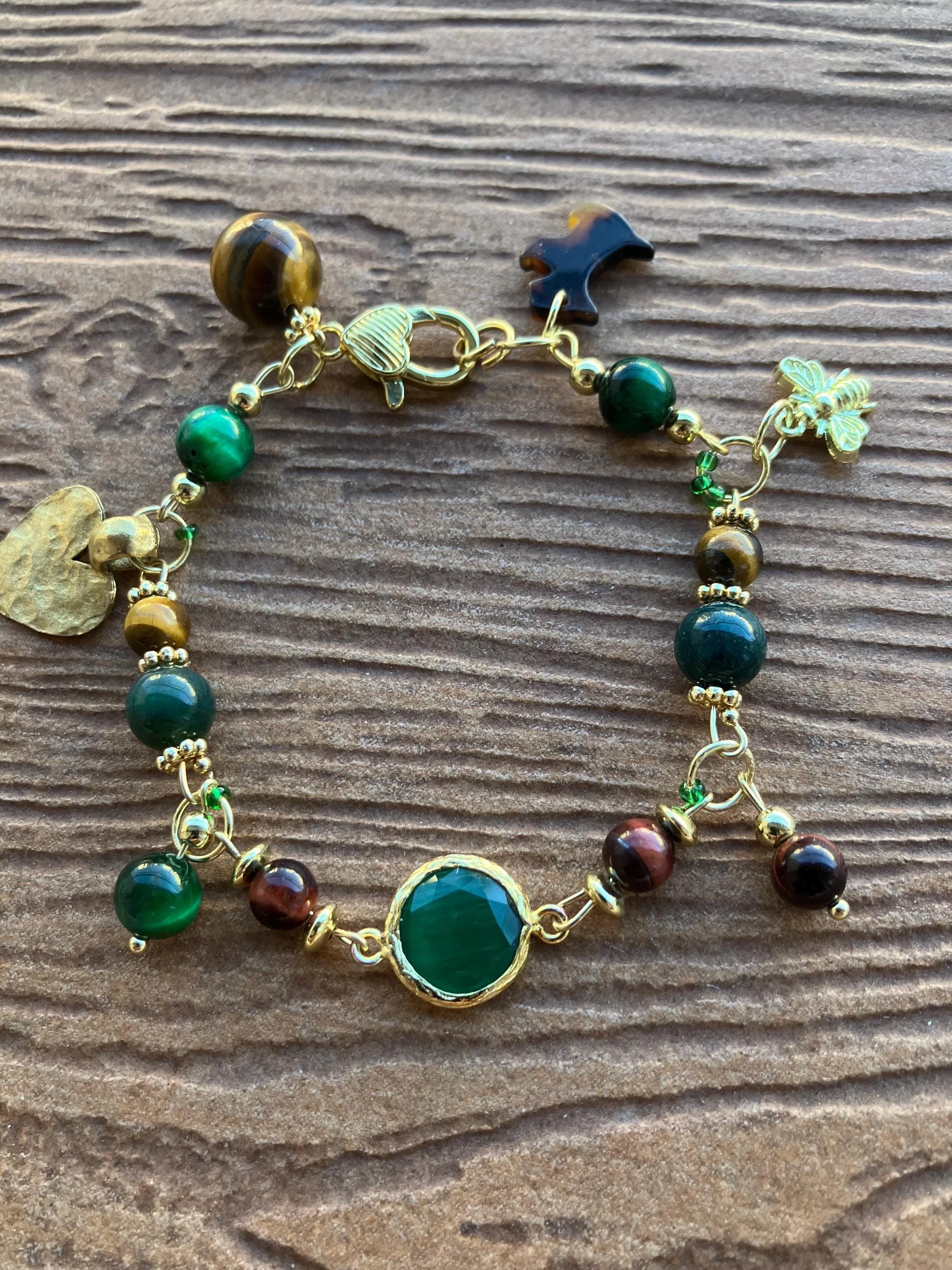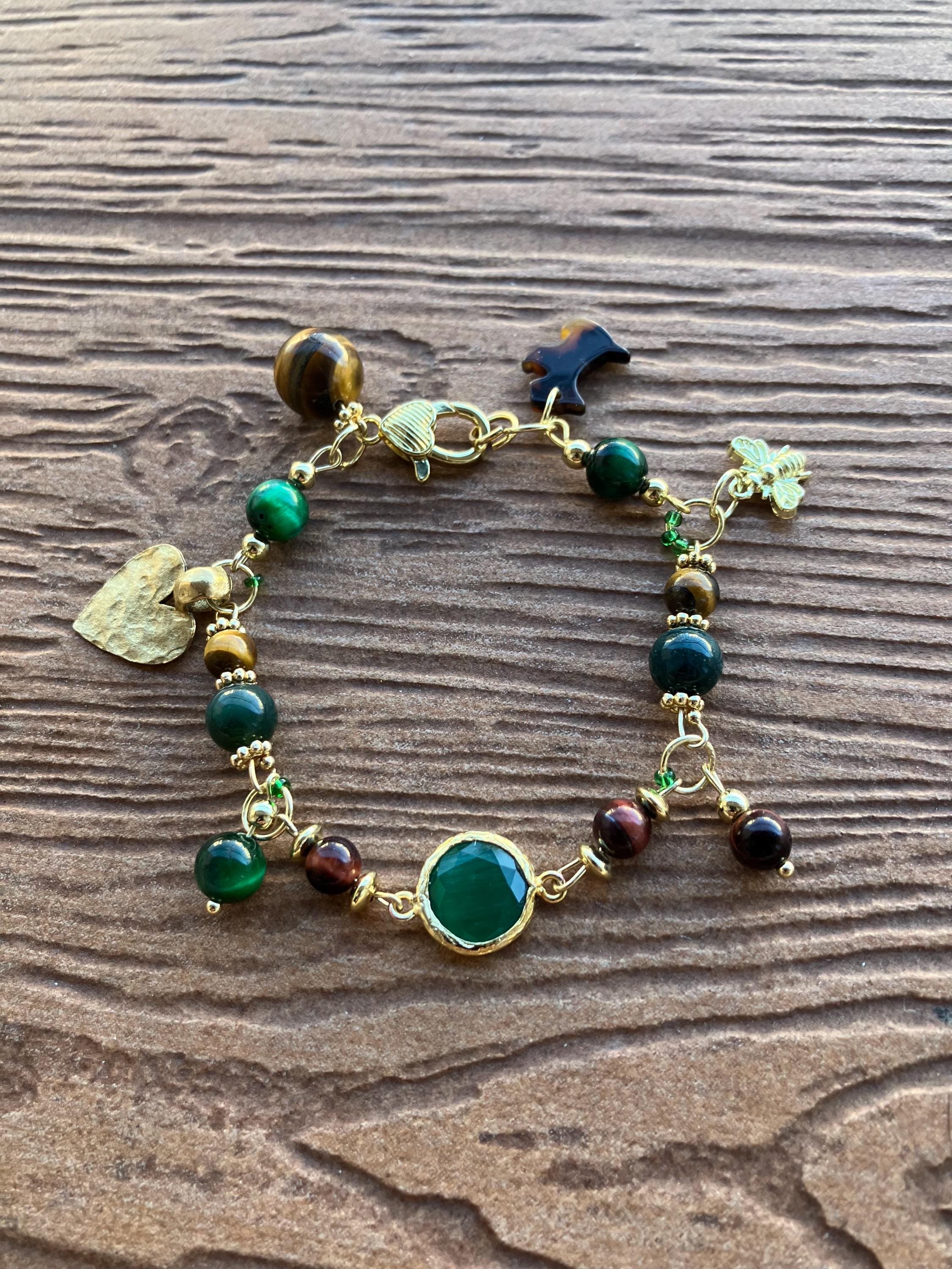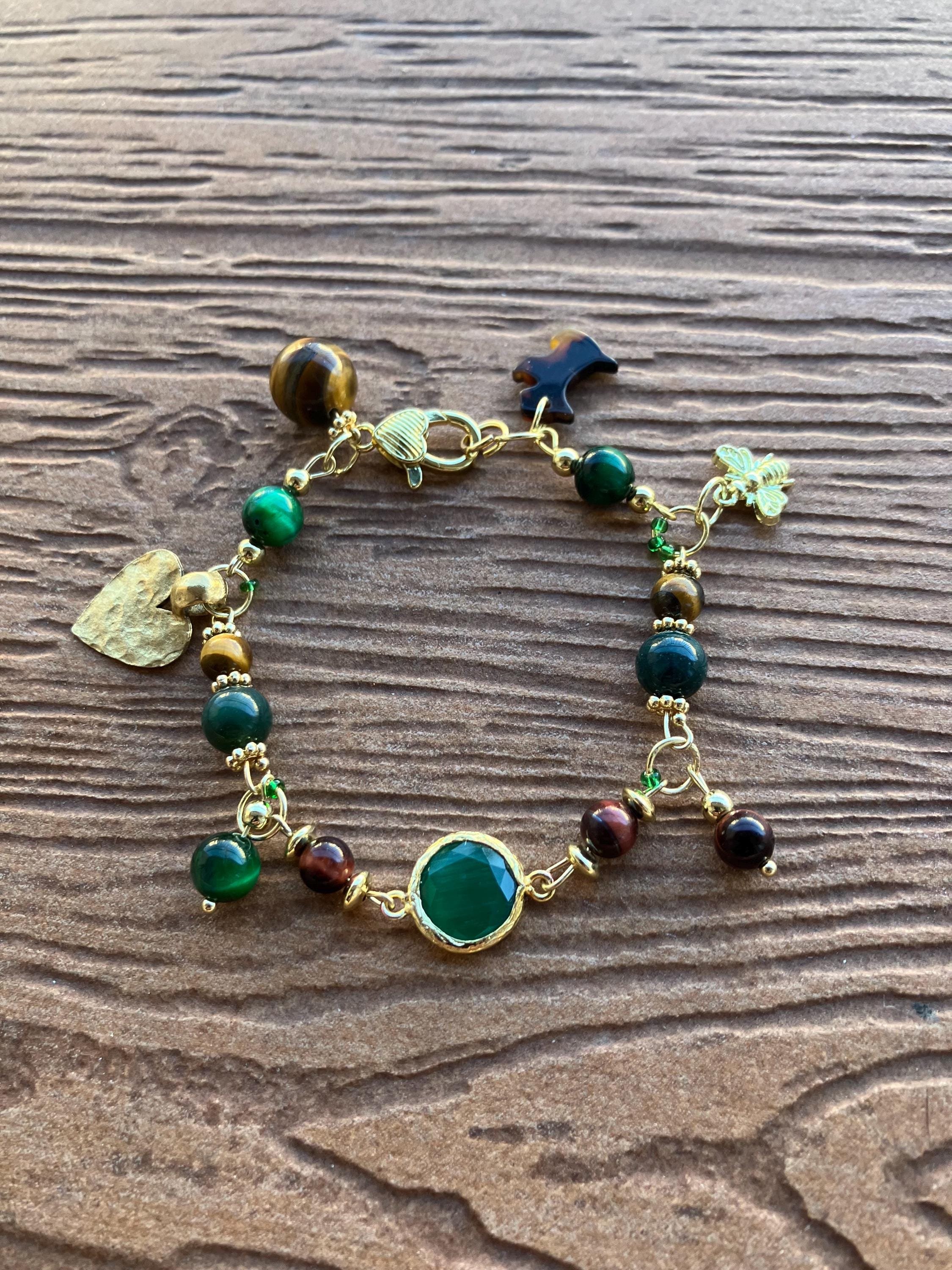 Bracelet Charm pierres semi précieuse œil de tigre, malachite, jade et plaqué or