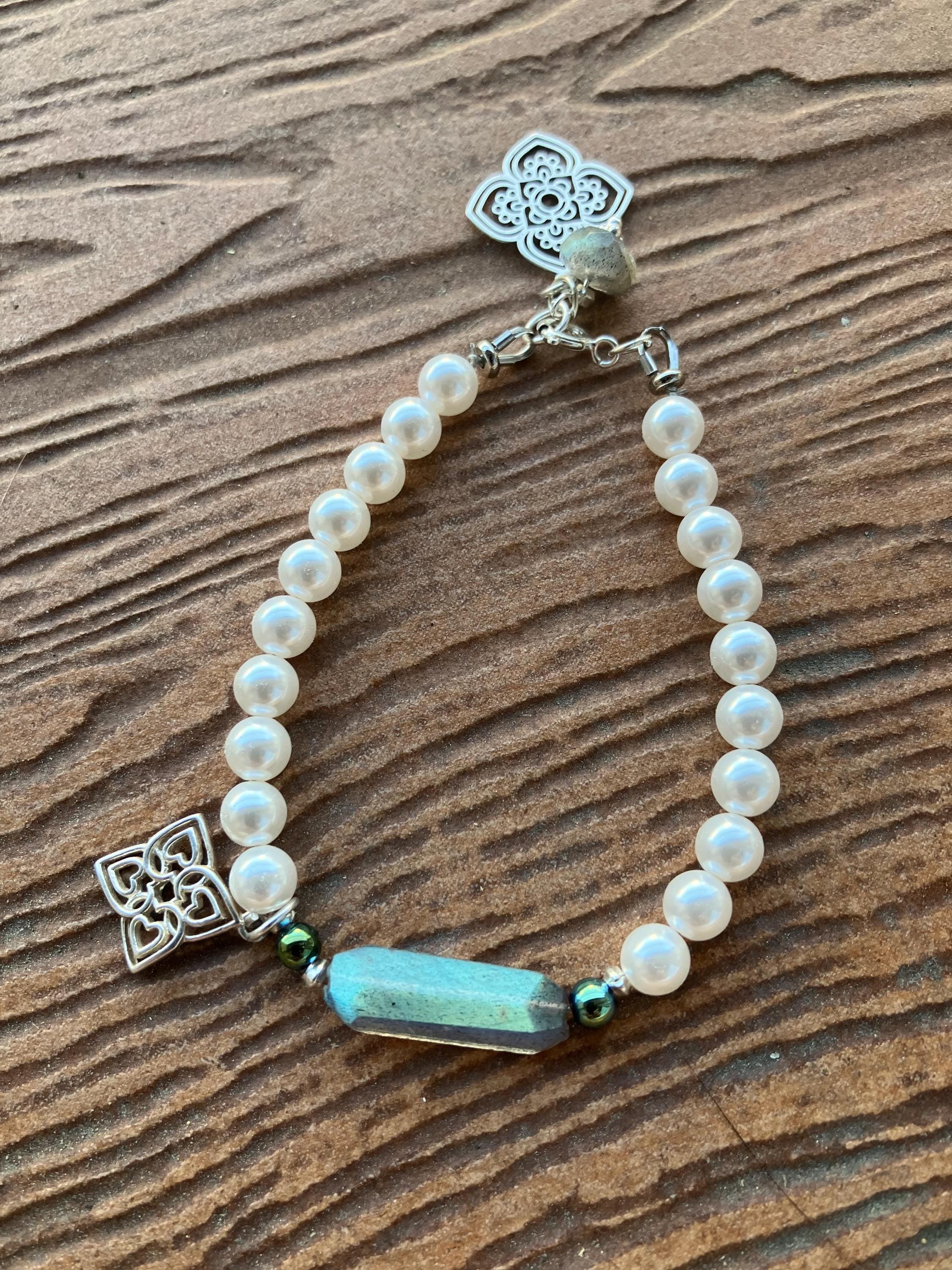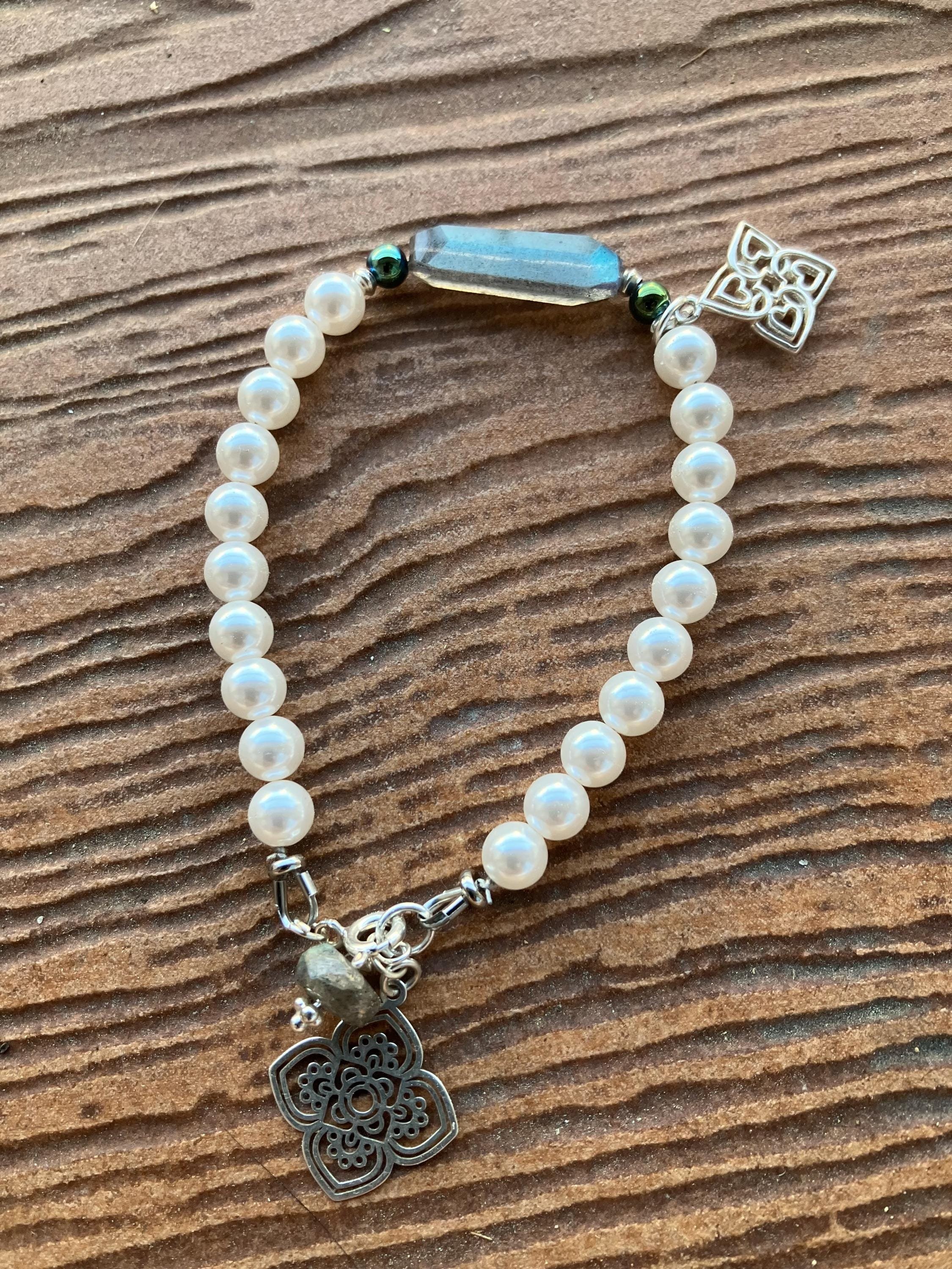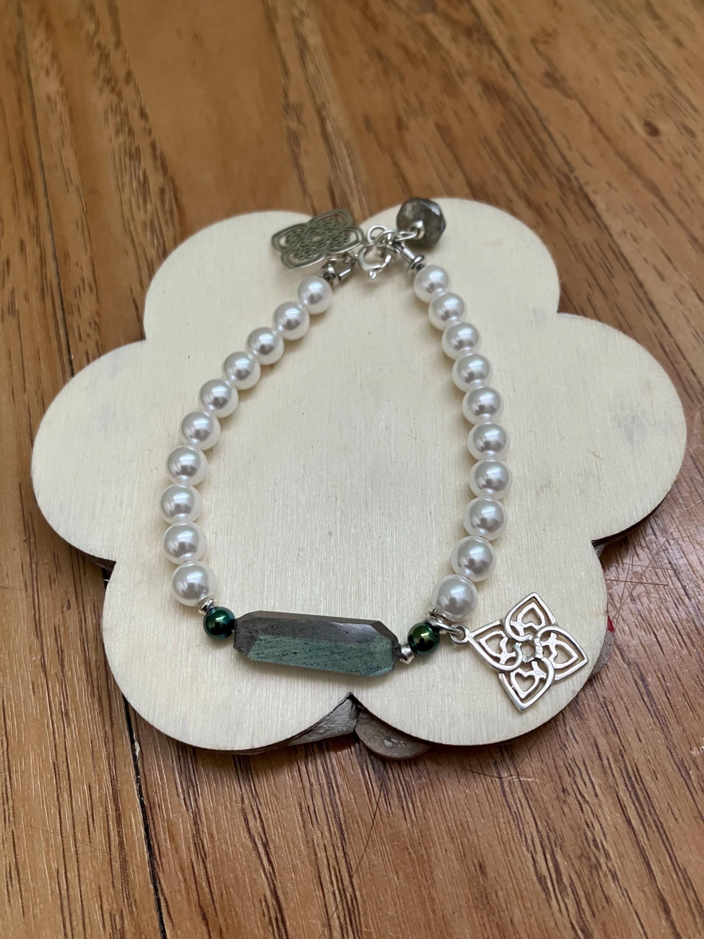 Très joli bracelet chic minimaliste de 18,5 cm composé de : perles de nacre blanche swarovski connecteur perle en semi précieuse labradorite bleue Deux grands charms feuille en filigramme en argent 925 Perle rondelle en semi précieuse labradorite