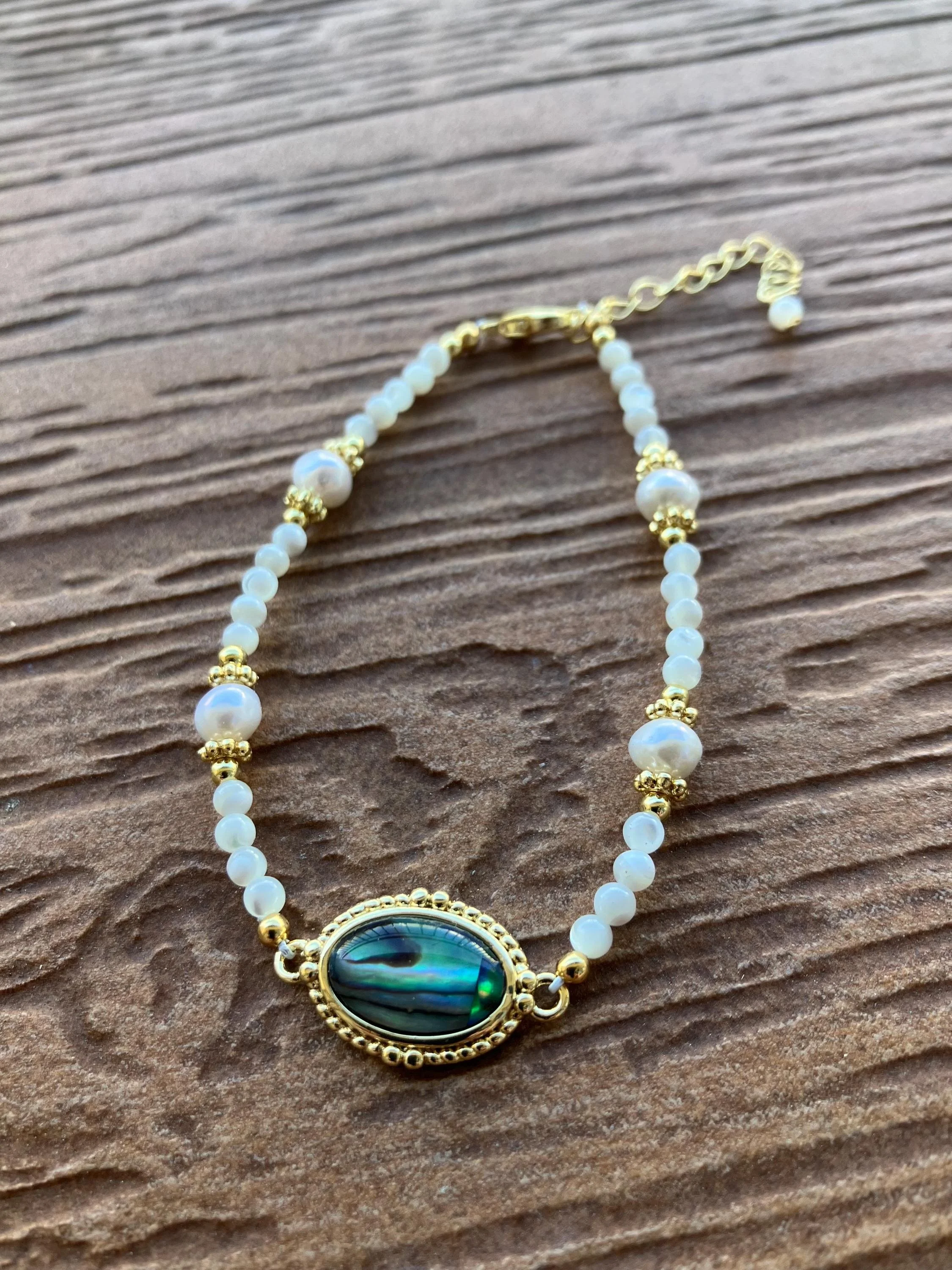 bracelet chic pierres nacre naturelles et perles de culture, connecteur en ormeau