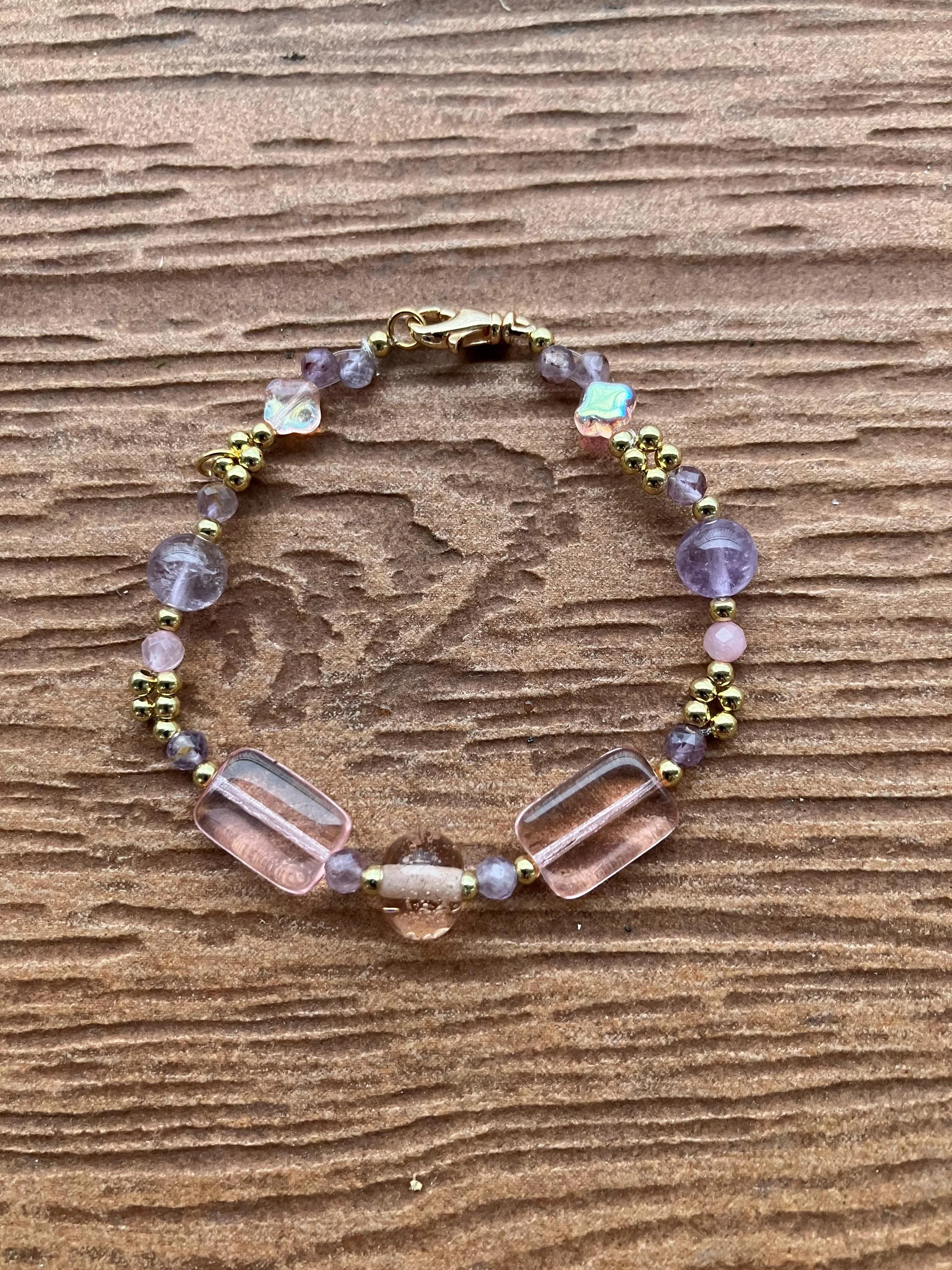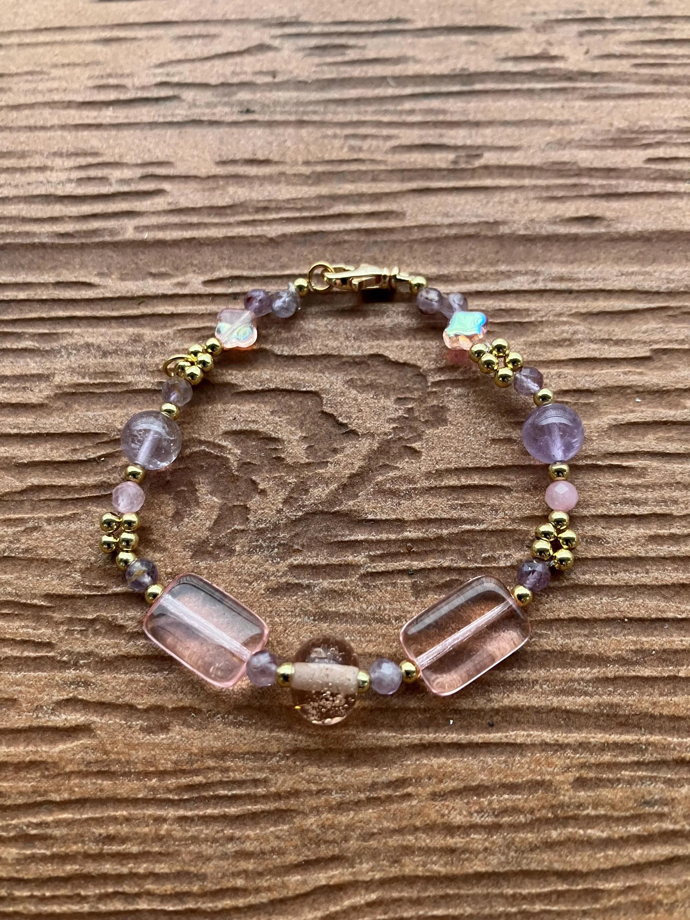 bracelet chic semi précieuse amétrine, cacoxenite, quartz rose, plaqué or, verre filé d art et verre tchèque