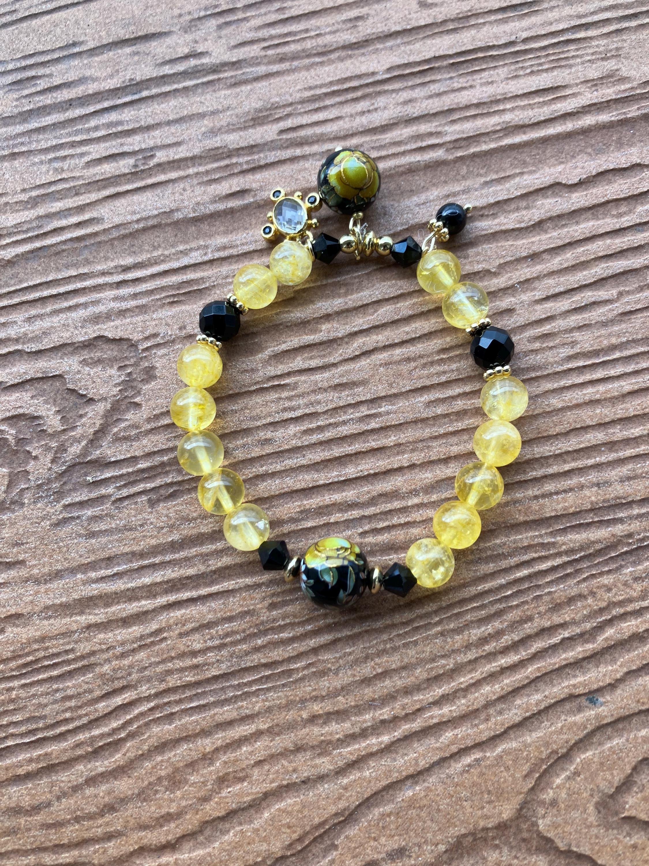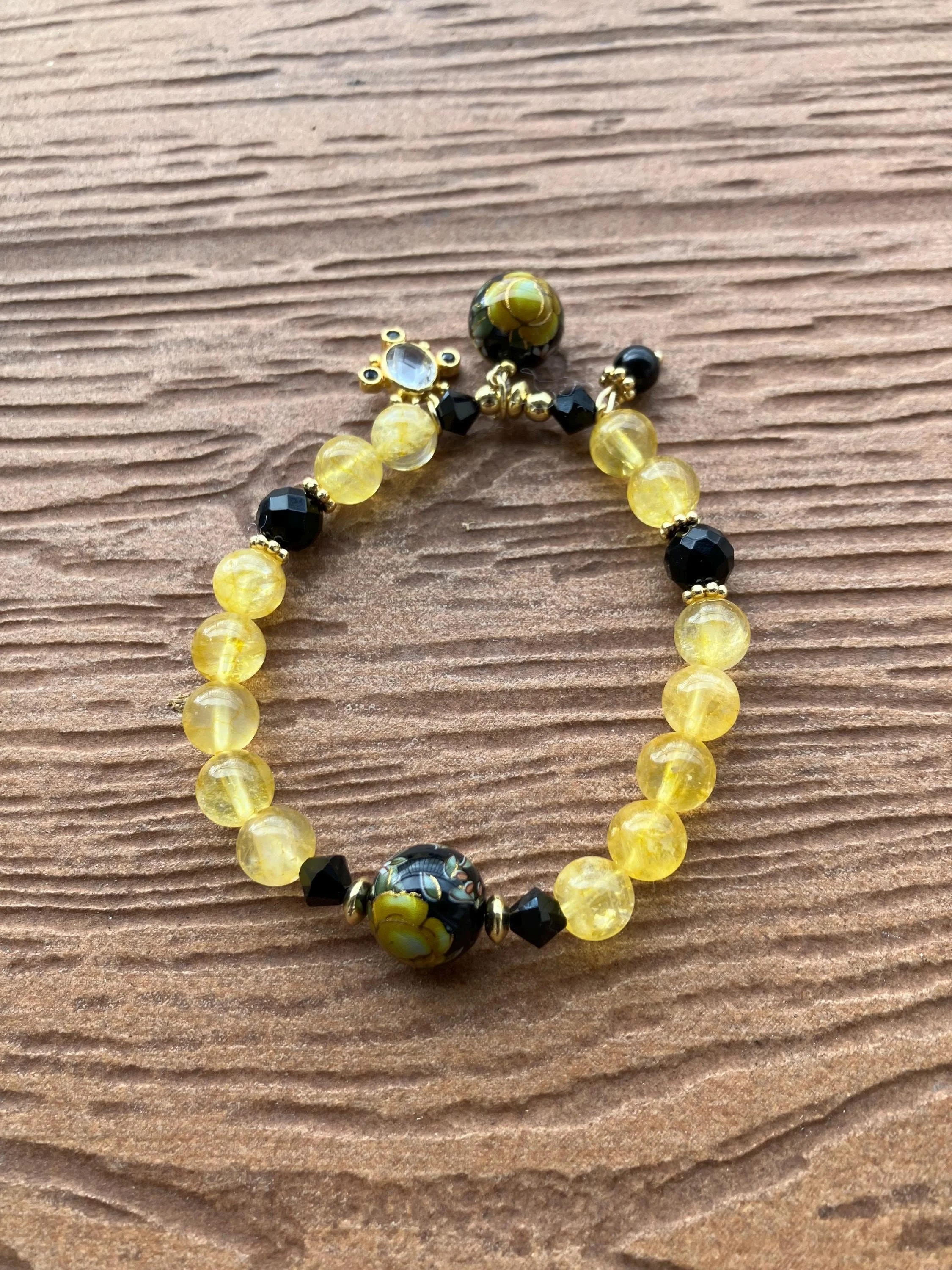 Cathynature-bijoux › Bracelet chic semi précieuse Citrine, Onyx facette, plaqué or et cristal Image 1 sur 3 Image 2 sur 3 Image 3 sur 3 Bracelet chic semi précieuse Citrine, Onyx facette, plaqué or et cristal 48,00 € Très joli bracelet bohème chic monté sur élastique de 18,5 cm Composé de Pierres semi précieuse en citrine grade AAPierres semi précieuse en onyx facette Pierre semi précieuse en onyx brut Perles et intercalaires en plaqué or 18 carats Magnifiques perles tensha japonaise fleuries jaunes et noires Charm original en cristal de quartz Acheter Ajout effectué ! Très joli bracelet bohème chic monté sur élastique de 18,5 cm Composé de Pierres semi précieuse en citrine grade AAPierres semi précieuse en onyx facette Pierre semi précieuse en onyx brut Perles et intercalaires en plaqué or 18 carats Magnifiques perles tensha japonaise fleuries jaunes et noires Charm original en cristal de quartz