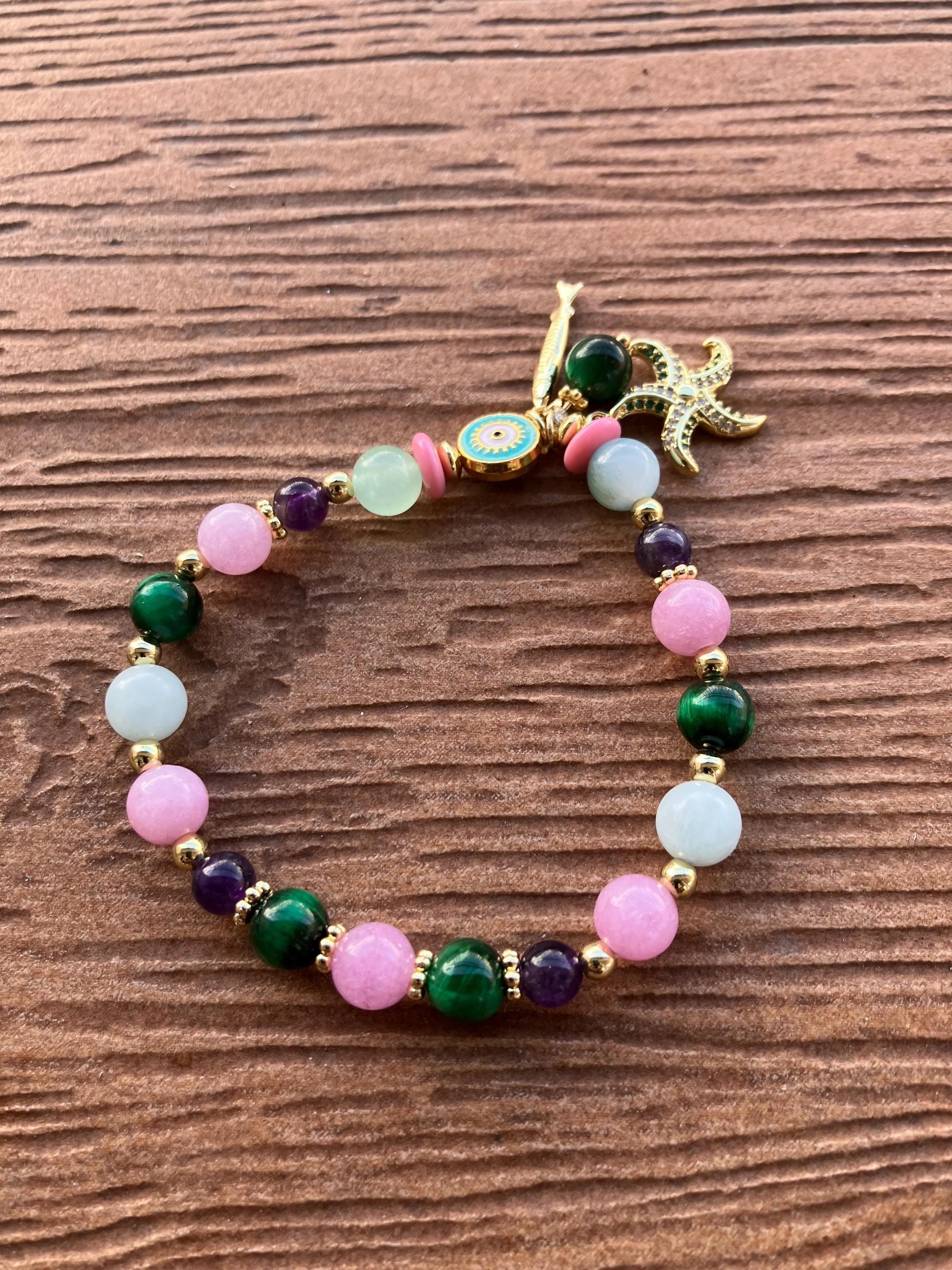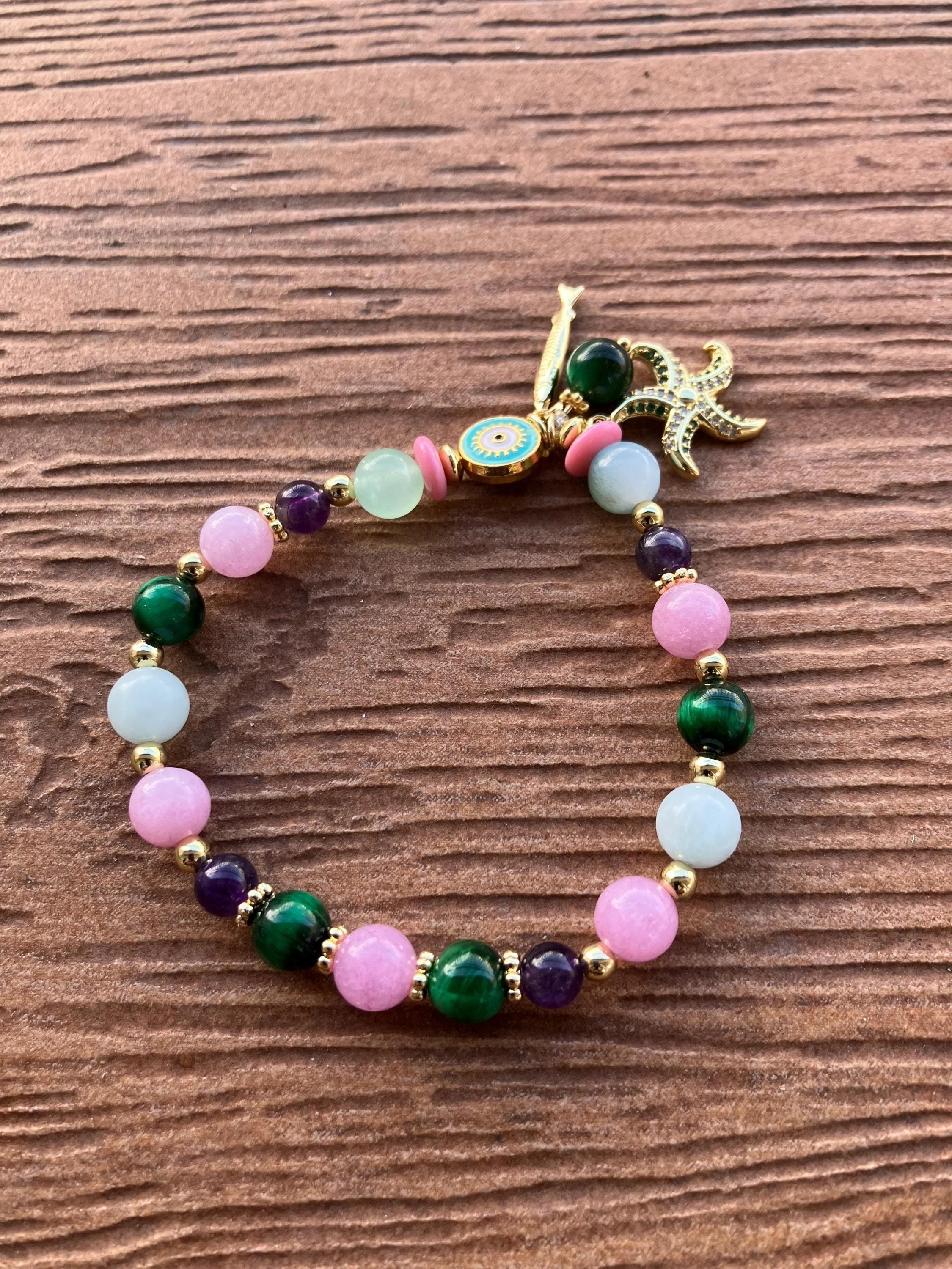 Bracelet coloré chic de pierres semi précieuses malachite, Aquamarine, améthyste, calcédoine et ses Charms de la mer en plaqué or