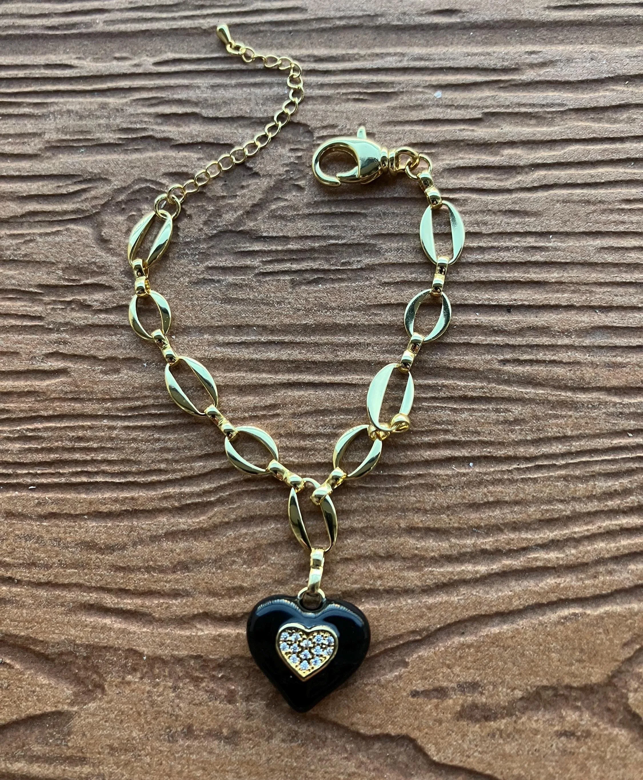 bracelet élégant en laiton 18 carats avec double maillons ovales et son pendentif cœur doré scintillant incrusté sur céramique émaillée