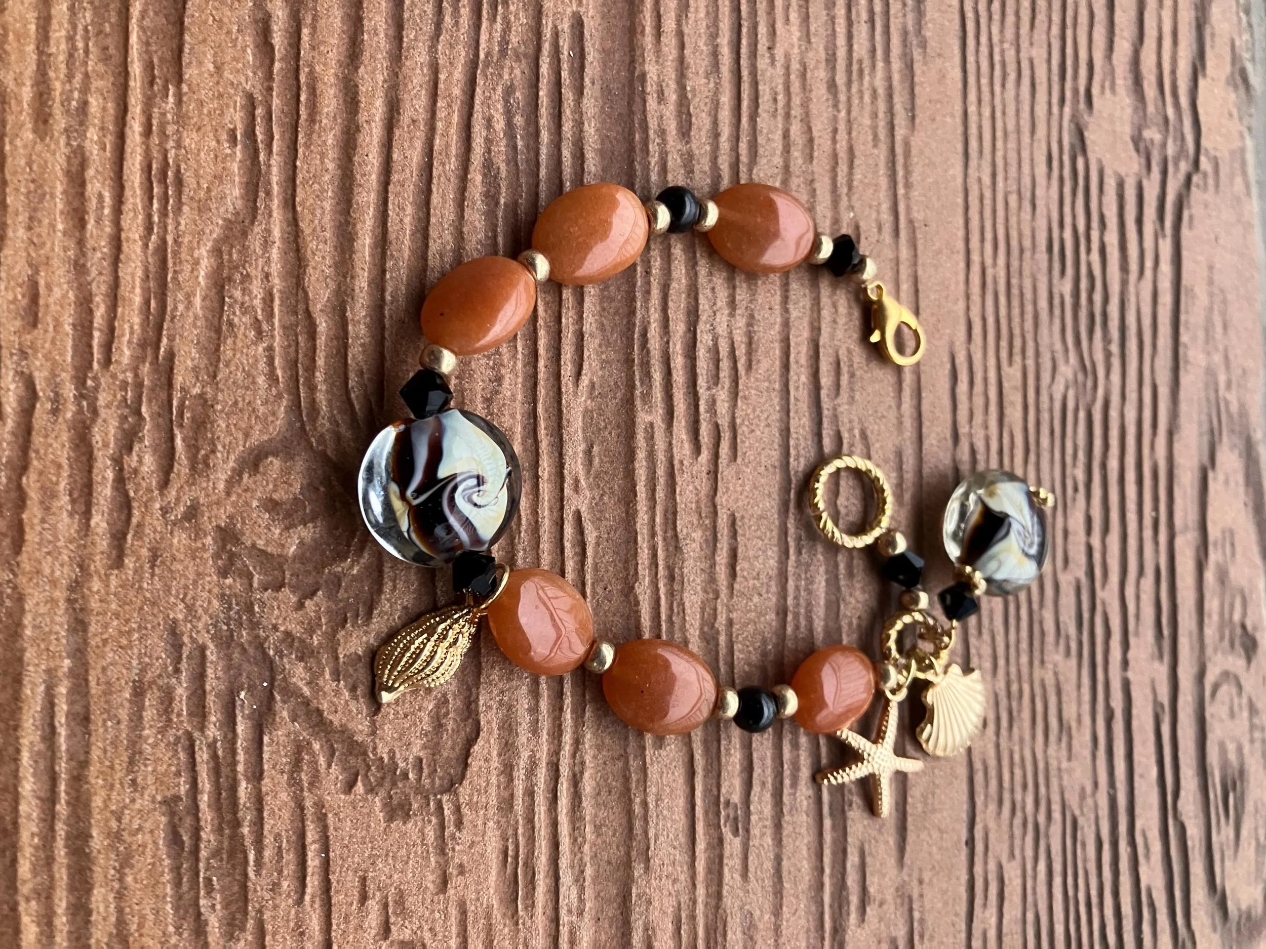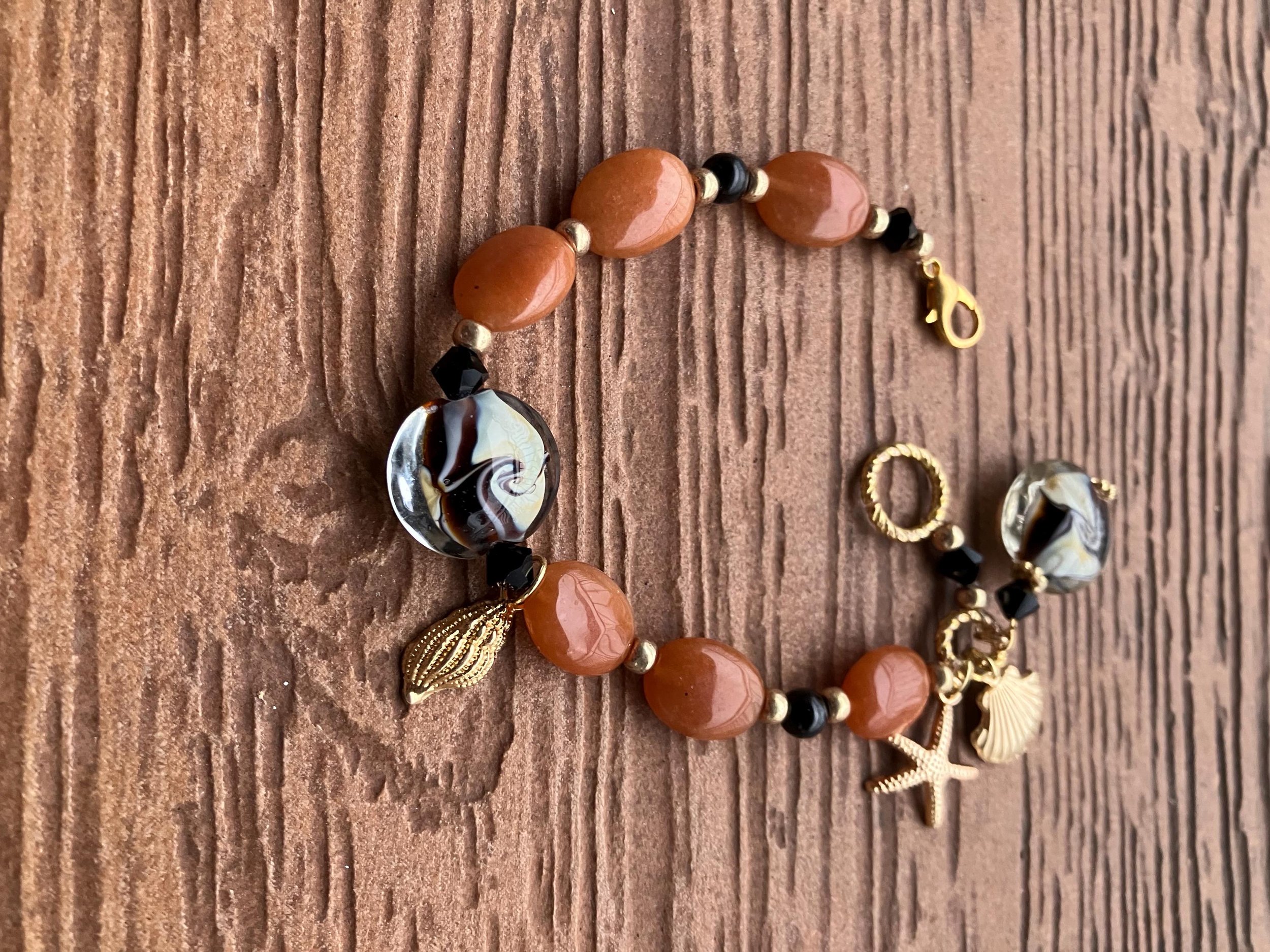 Cathynature-bijoux › Bracelet original couleur miel au verre filé au chalumeau, semi précieuse jade miel et onyx et ses charms en alliage de zinc plaqué or Image 1 sur 2 Image 2 sur 2 Bracelet original couleur miel au verre filé au chalumeau, semi précieuse jade miel et onyx et ses charms en alliage de zinc plaqué or 45,00 € Très joli bracelet aux couleurs hivernales De 22 cm Composé de Magnifique perles galets en verre filé d art avec arabesques noires et crème Superbes perles ovales en semi précieuse jade miel Perles seul précieuse en onyx Perles toupie en cristal Swarovski Perles intercalaires en laiton brut Charms de la mer en alliage de zinc plaqué or Acheter Ajout effectué ! Très joli bracelet aux couleurs hivernales De 22 cm Composé de Magnifique perles galets en verre filé d art avec arabesques noires et crème Superbes perles ovales en semi précieuse jade miel Perles seul précieuse en onyx Perles toupie en cristal Swarovski Perles intercalaires en laiton brut Charms de la mer en alliage de zinc plaqué or