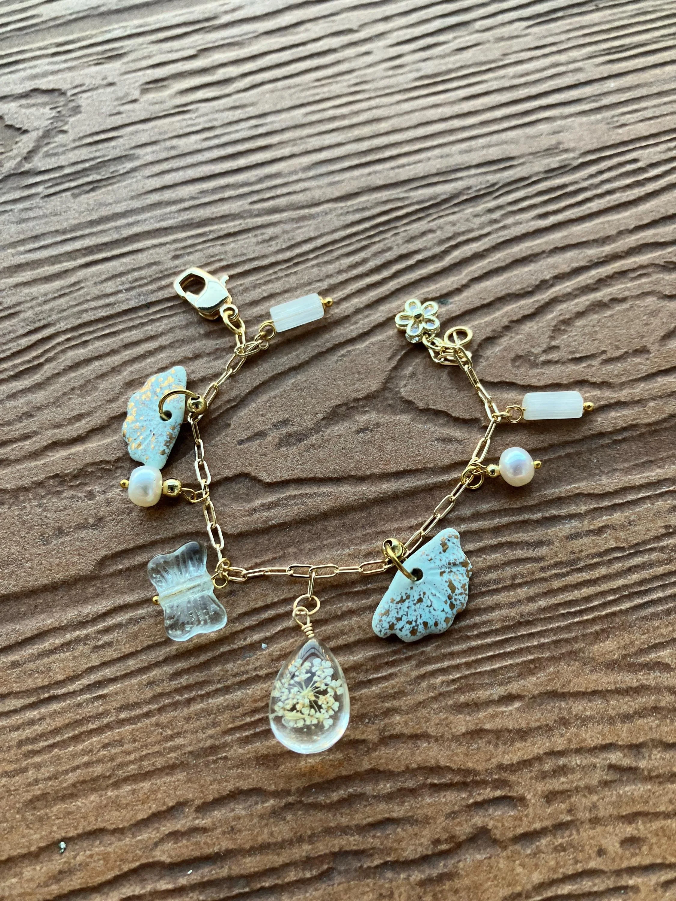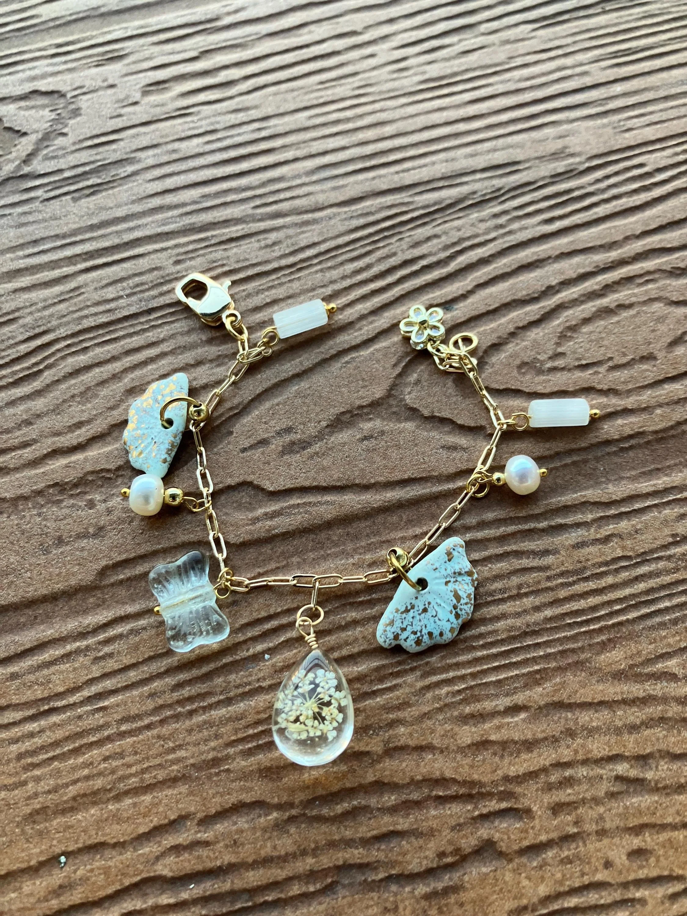 bracelet original pampilles céramique or, verre vintage, fleur séchée, plaqué or et perles de culture