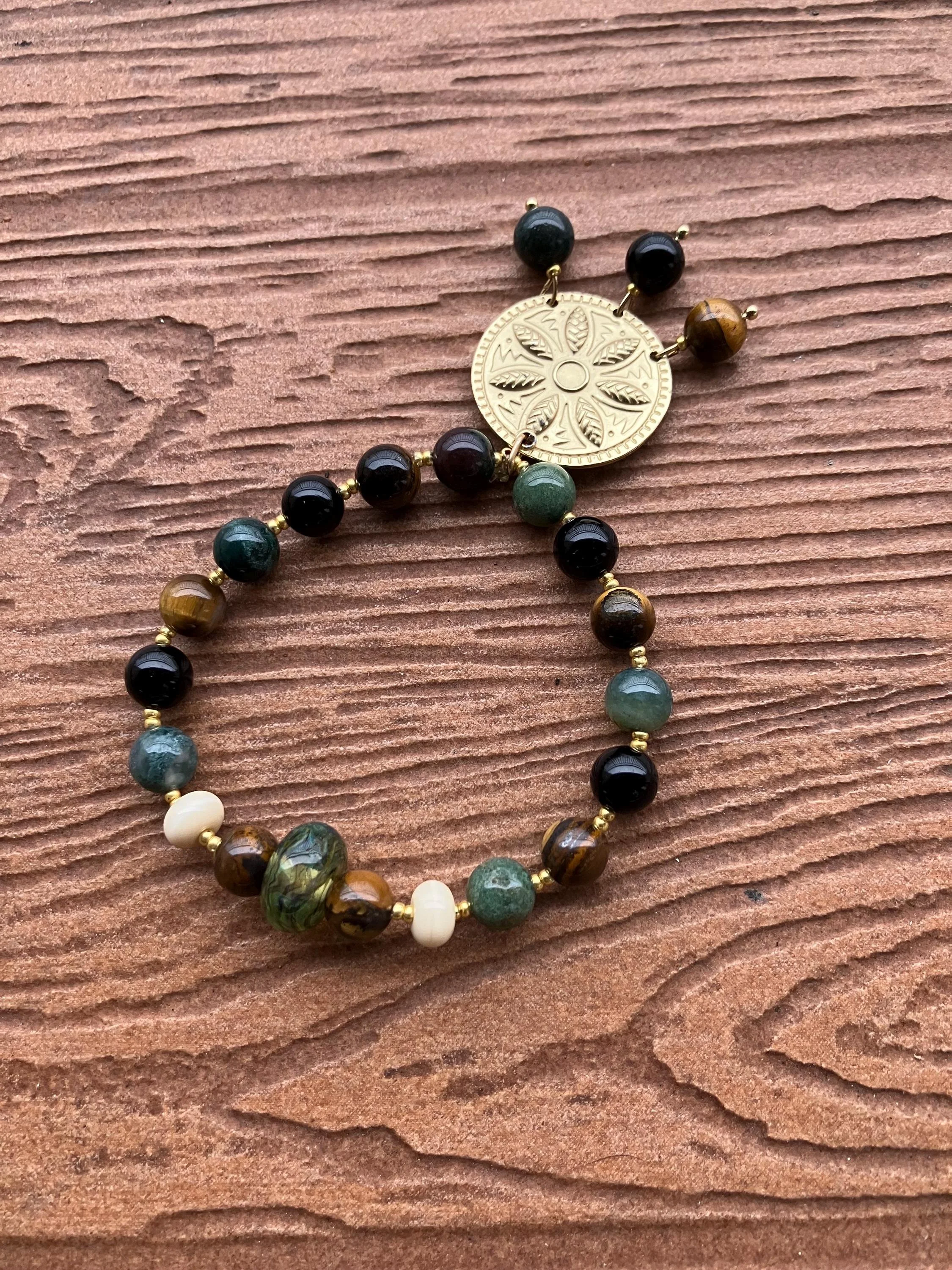 Cathynature-bijoux › bracelet original perles semi précieuse onyx noir, œil de tigre, agate tibétaine Image 1 sur 4 Image 2 sur 4 Image 3 sur 4 Image 4 sur 4 bracelet original perles semi précieuse onyx noir, œil de tigre, agate tibétaine 36,00 € Joli bracelet de 19 cm monté sur élastiqueComposé de Pierres semi précieuse en onyx noir brillant Pierres semi précieuse en œil de tigre Pierres semi précieuse en agate tibétaine Charm médaille fleuri en laitonperles de verre filé au chalumeau faites à la main Acheter Ajout effectué ! Joli bracelet de 19 cm monté sur élastiqueComposé de Pierres semi précieuse en onyx noir brillant Pierres semi précieuse en œil de tigre Pierres semi précieuse en agate tibétaine Charm médaille fleuri en laitonperles de verre filé au chalumeau faites à la main