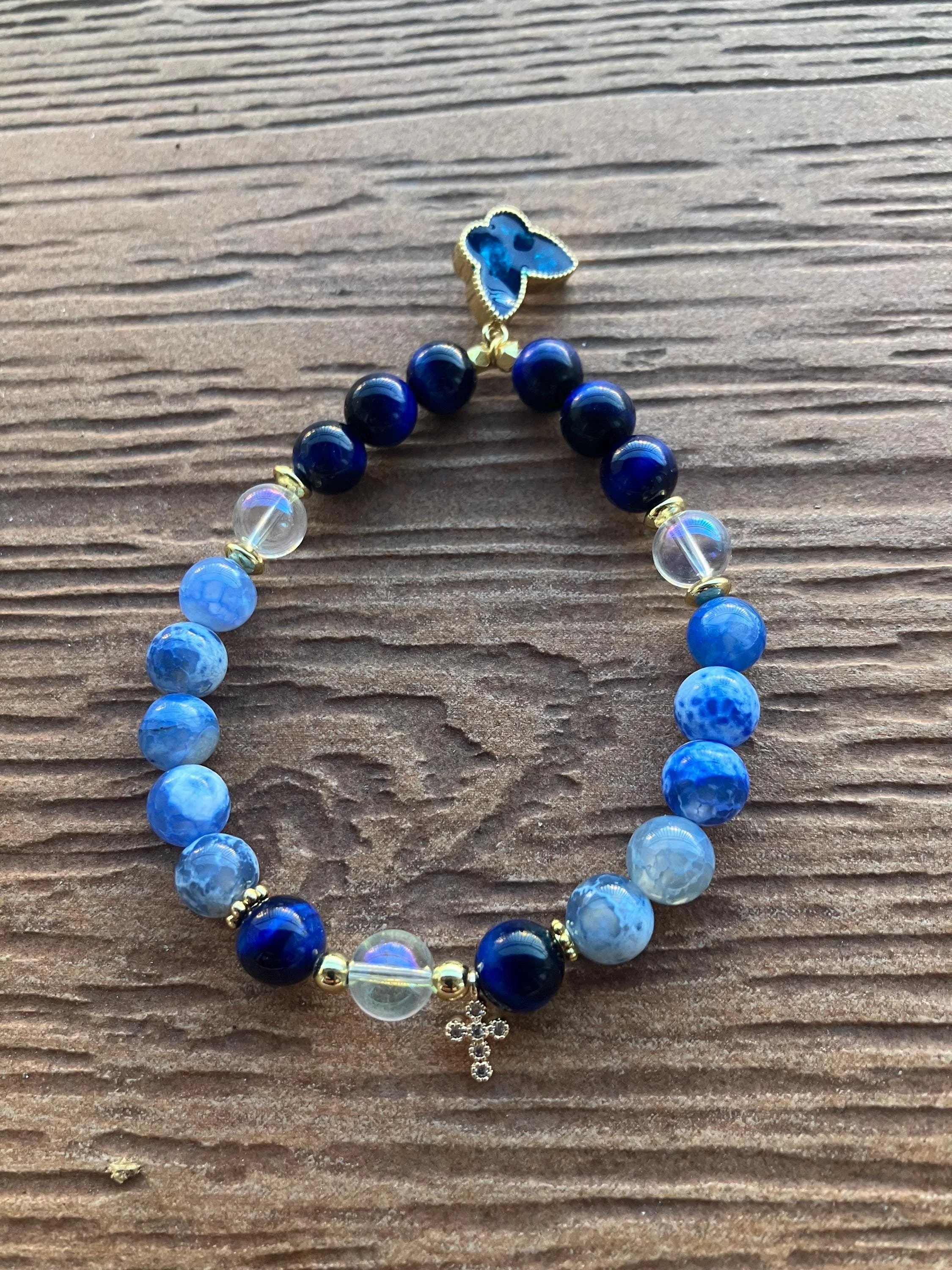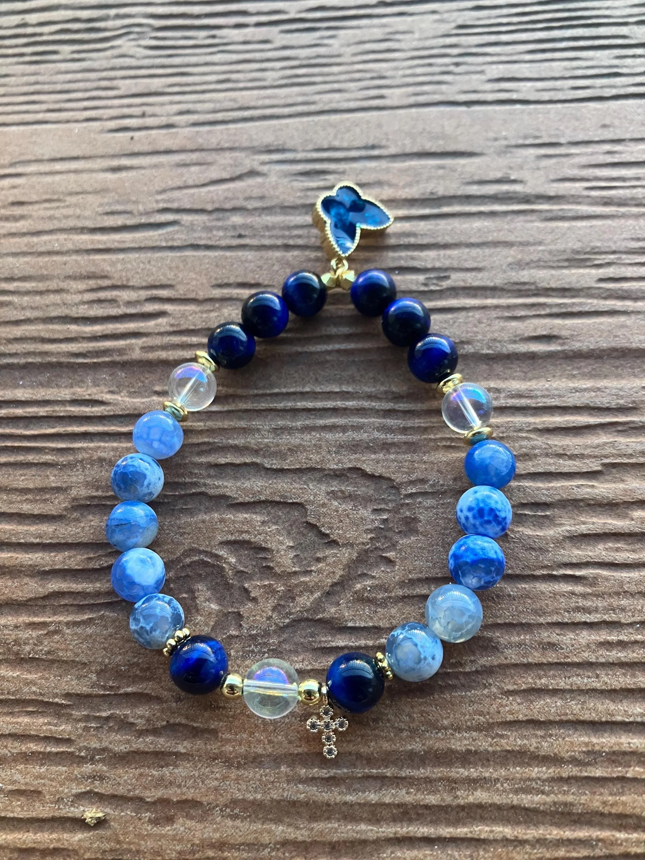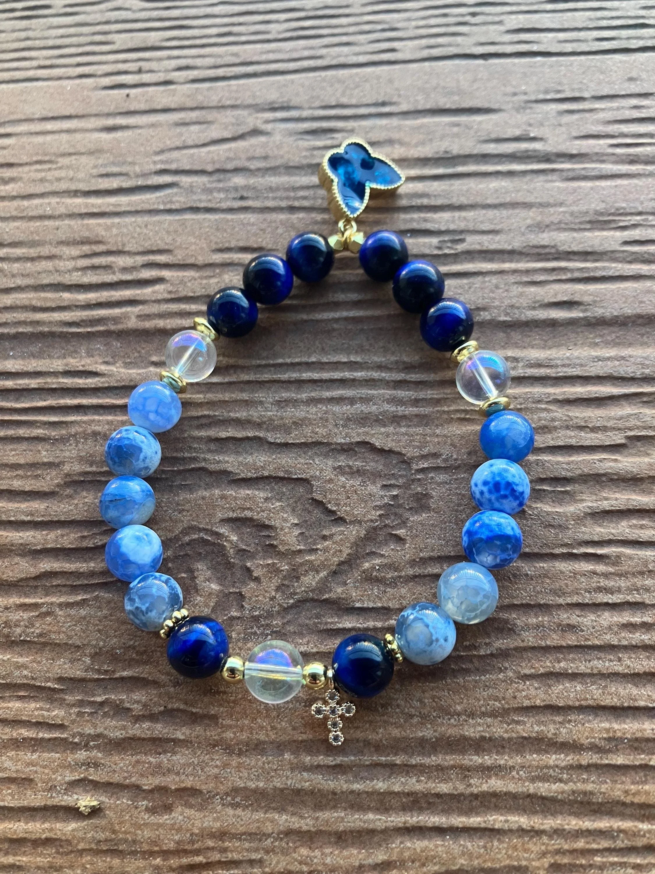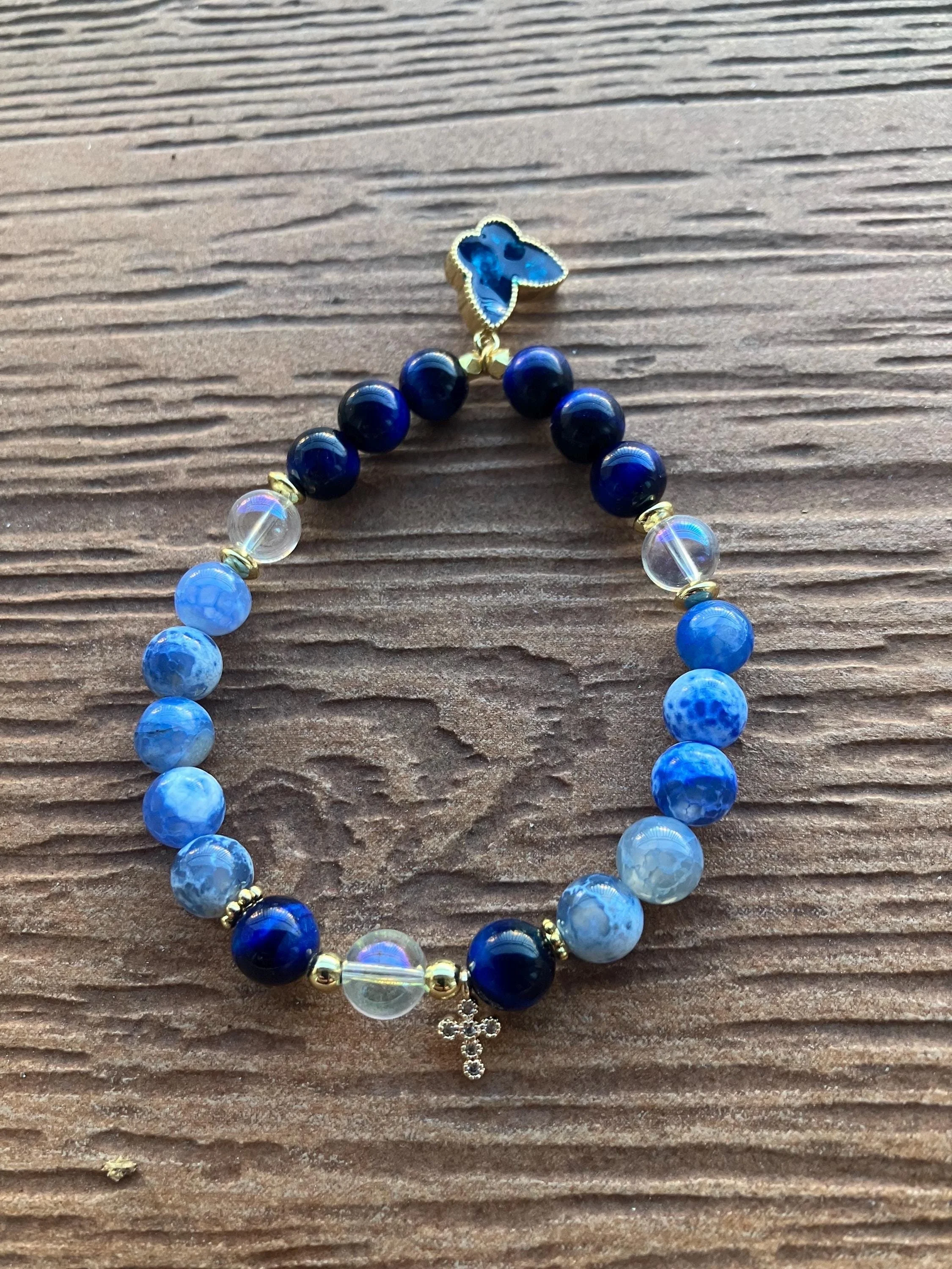 Cathynature-bijoux › Bracelet semi précieuse lapis lazuli et jaspe bleu, plaqué or et son Charm papillon Image 1 sur 4 Image 2 sur 4 Image 3 sur 4 Image 4 sur 4 Bracelet semi précieuse lapis lazuli et jaspe bleu, plaqué or et son Charm papillon 44,00 € Joli bracelet aux tons bleus de 19 cm monté sur élastique Composé de Pierres semi précieuse en lapis lazuli Pierres seul précieuse en jaspe bleu Perles en cristal de quartz Perles et intercalaires fleur en plaqué or 18 carats Charm croix en strass et plaqué or Grand Charm papillon en plaqué or Acheter Ajout effectué ! Joli bracelet aux tons bleus de 19 cm monté sur élastique Composé de Pierres semi précieuse en lapis lazuli Pierres seul précieuse en jaspe bleu Perles en cristal de quartz Perles et intercalaires fleur en plaqué or 18 carats Charm croix en strass et plaqué or Grand Charm papillon en plaqué or