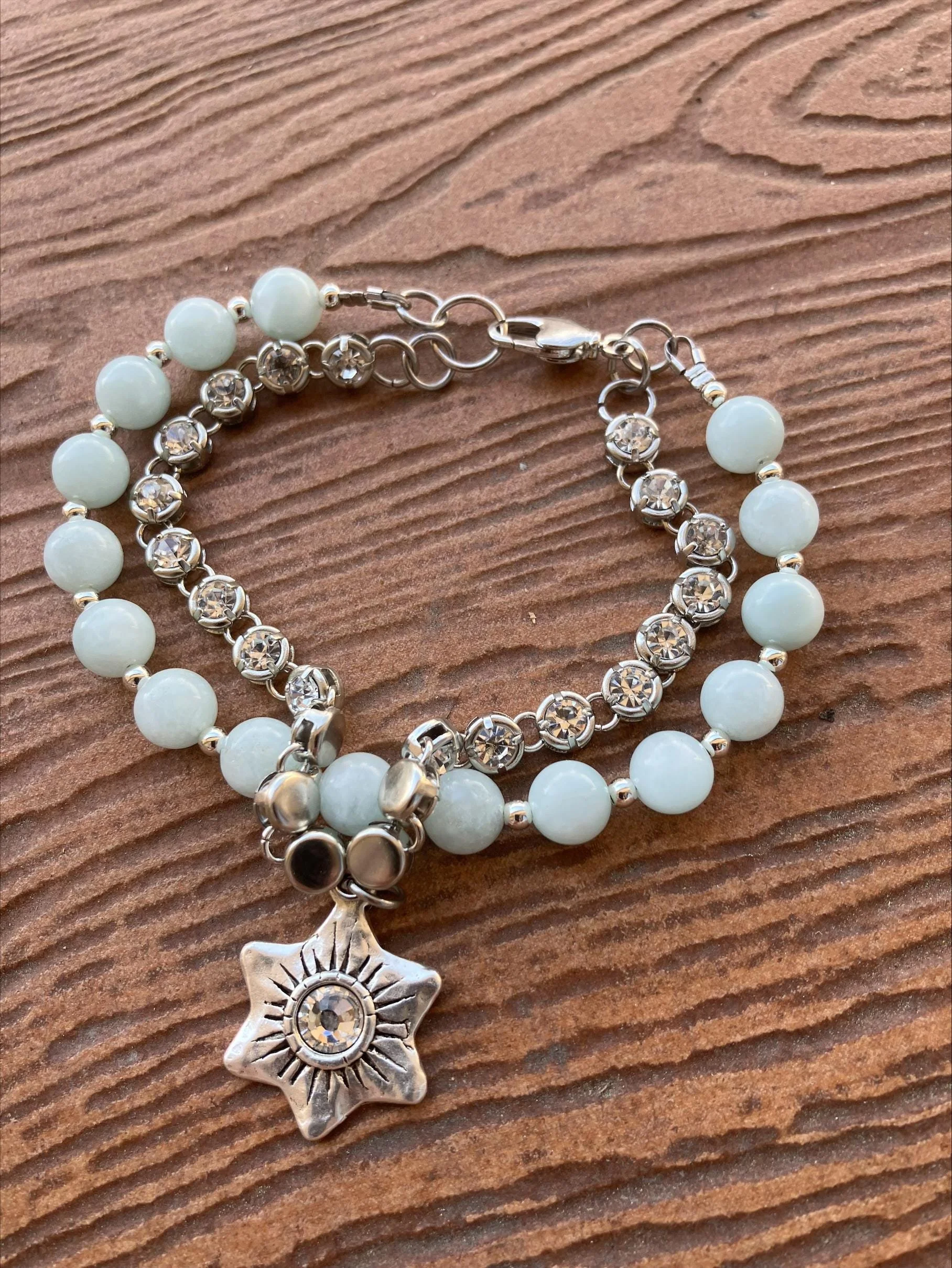 Bracelet semi precieuse, bracelet angelite vert, bracelet chic, bracelet double rang strass, fête des mères