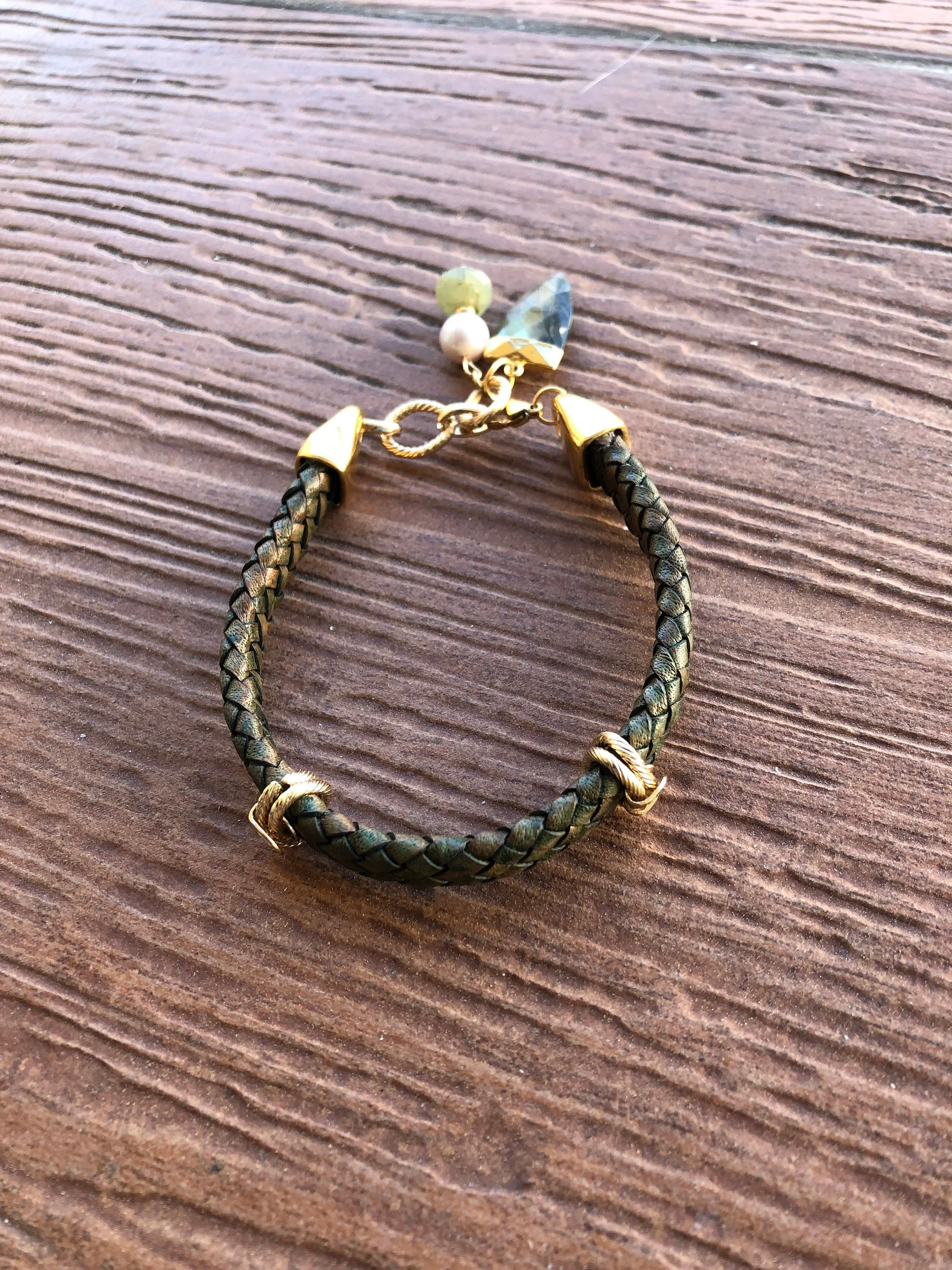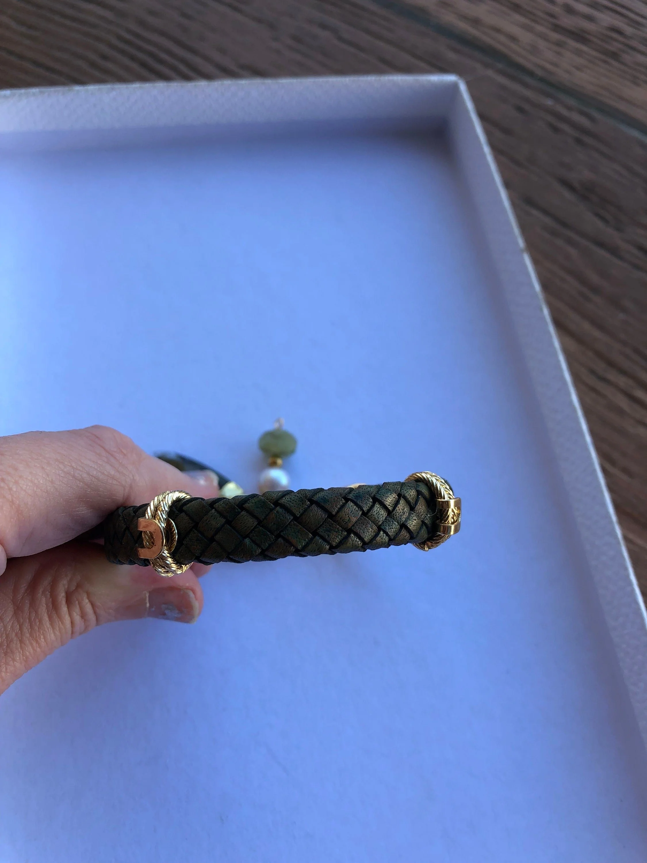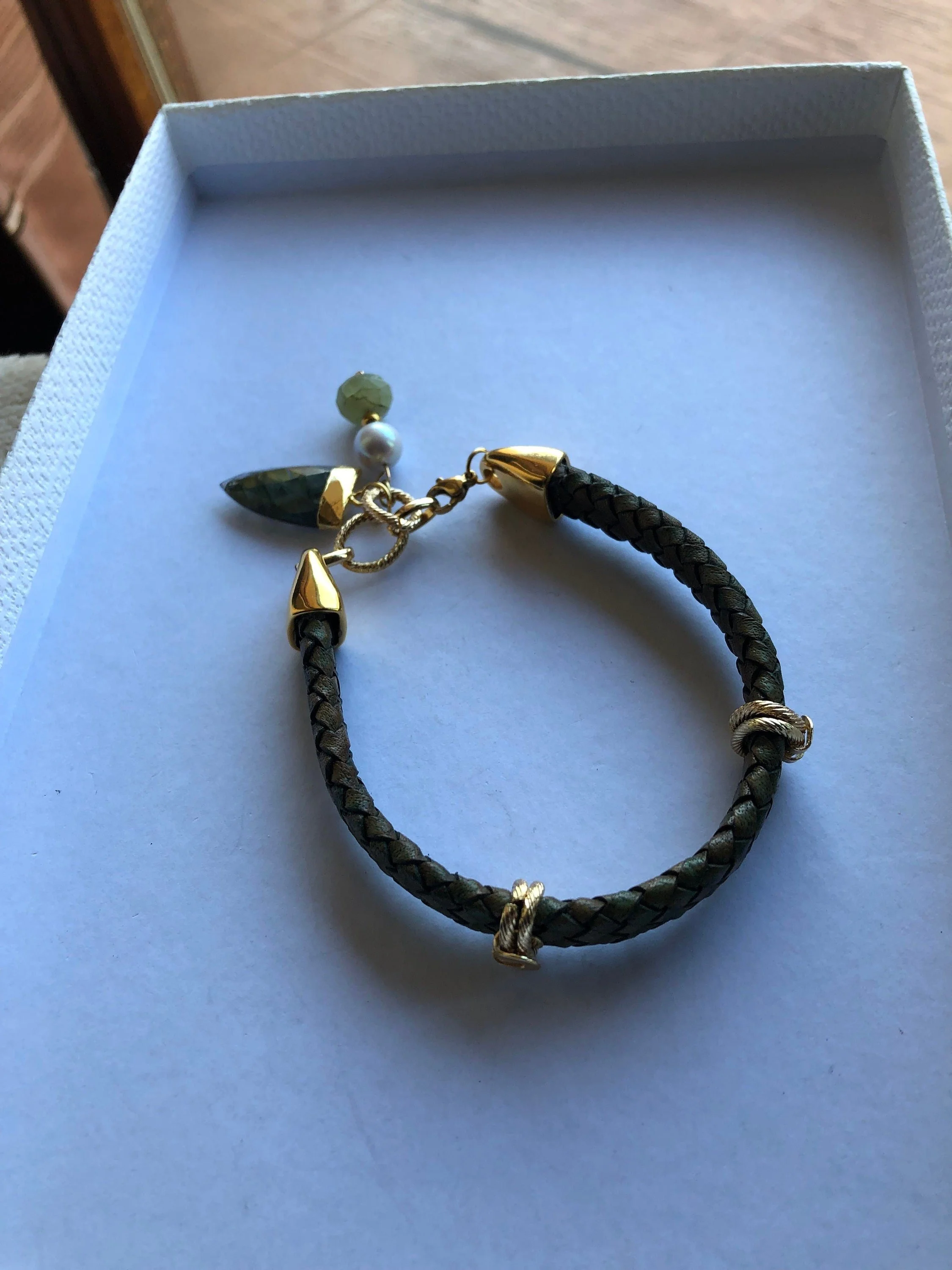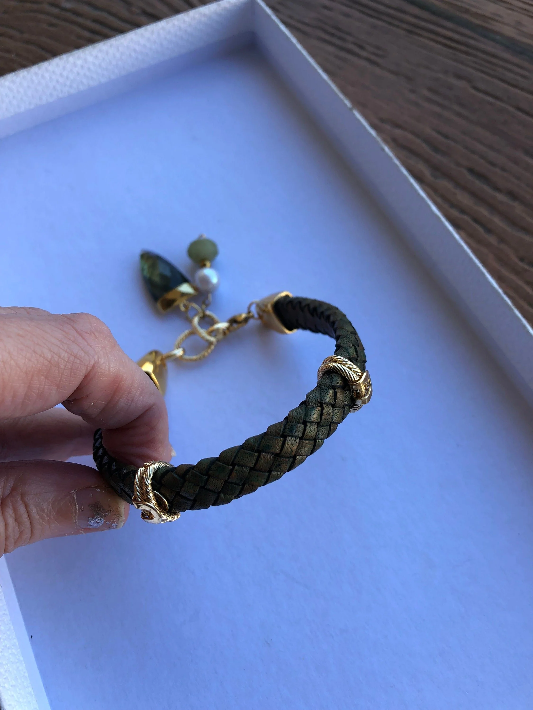 Cathynature-bijoux › CUIR tressé, EDISON, LABRADORITE aiguë marine, bracelet chic en cuir vintage Image 1 sur 9 Image 2 sur 9 Image 3 sur 9 Image 4 sur 9 Image 5 sur 9 Image 6 sur 9 Image 7 sur 9 Image 8 sur 9 Image 9 sur 9 CUIR tressé, EDISON, LABRADORITE aiguë marine, bracelet chic en cuir vintage 46,00 € épuisé Magnifique bracelet composé - d un cordon plat en cuir tressé de haute qualité vintage vert mordoré de 10 mmDe passants en laiton plaque or martèle D embouts en acier inoxydable D anneaux ovales en laiton plaque or D une perle de culture Edison véritable de 10 mmD une magnifique perle semi precieuse en aiguë marine vert pale D un sublime pendentif dent de la mer en plaque or et semi précieuse labradorite(reflets splendides à la lumière) Mesure 22,5 cm Modèle unique Épuisé Ajout effectué ! Magnifique bracelet composé - d un cordon plat en cuir tressé de haute qualité vintage vert mordoré de 10 mmDe passants en laiton plaque or martèle D embouts en acier inoxydable D anneaux ovales en laiton plaque or D une perle de culture Edison véritable de 10 mmD une magnifique perle semi precieuse en aiguë marine vert pale D un sublime pendentif dent de la mer en plaque or et semi précieuse labradorite(reflets splendides à la lumière) Mesure 22,5 cm Modèle unique