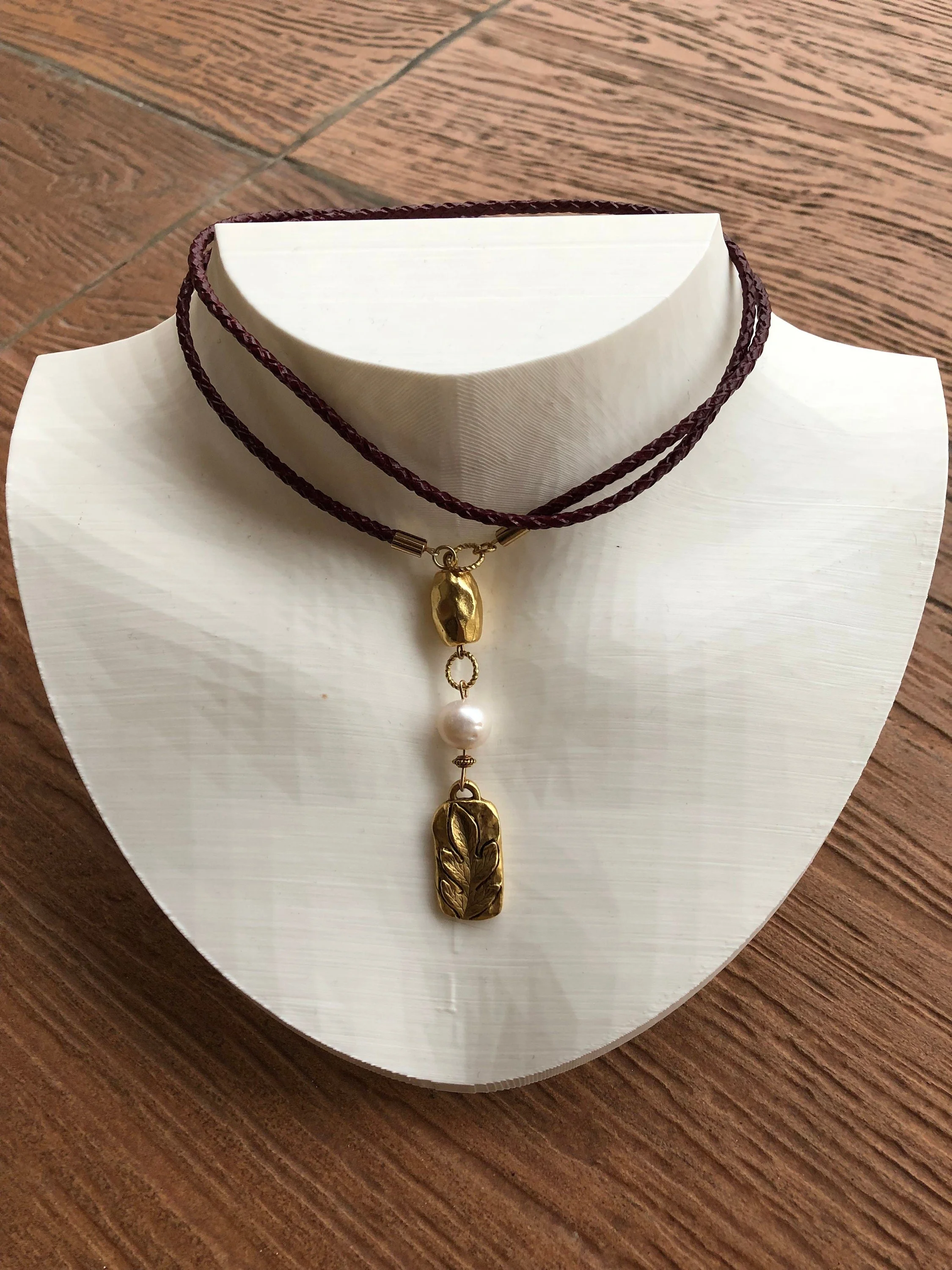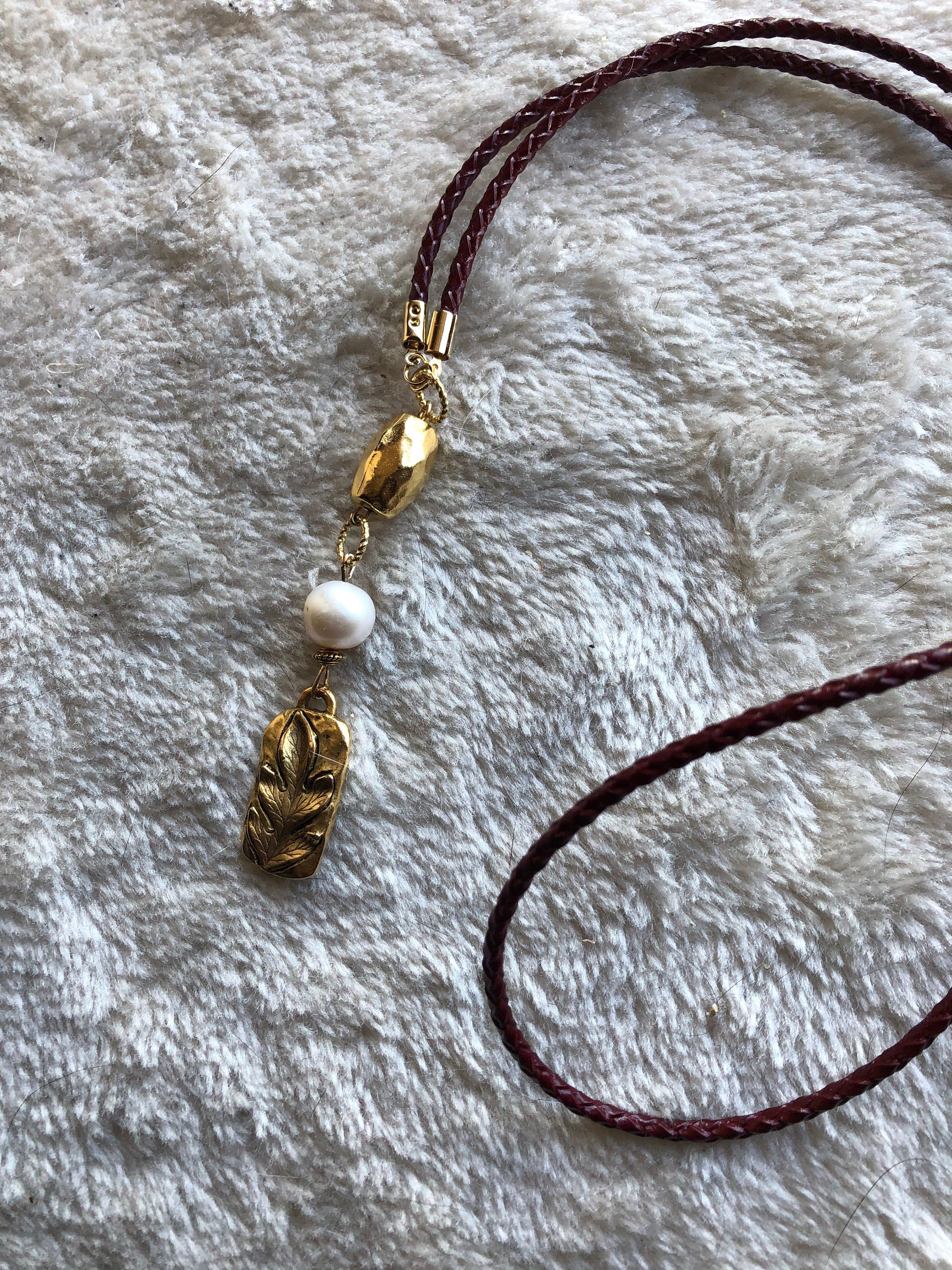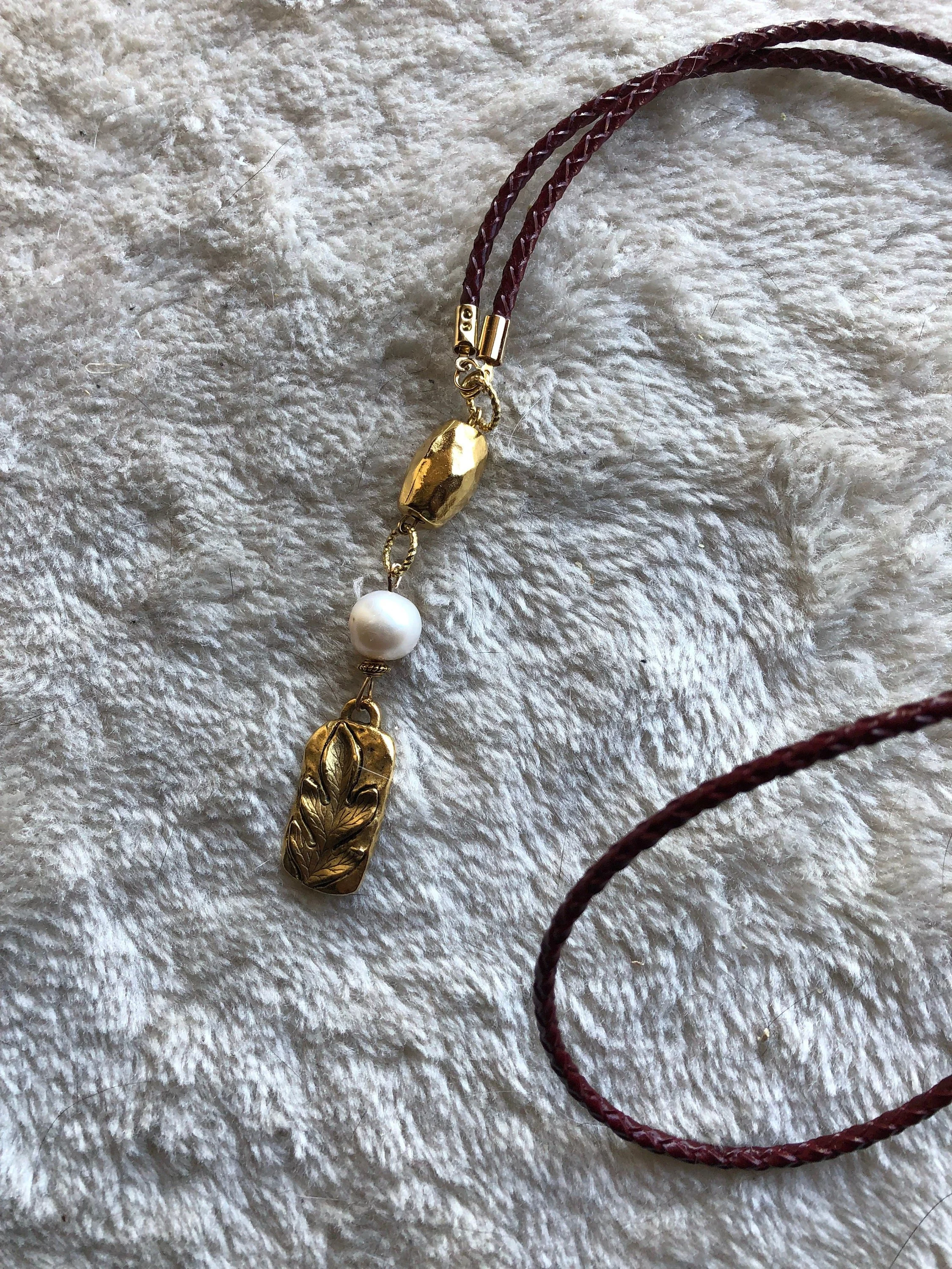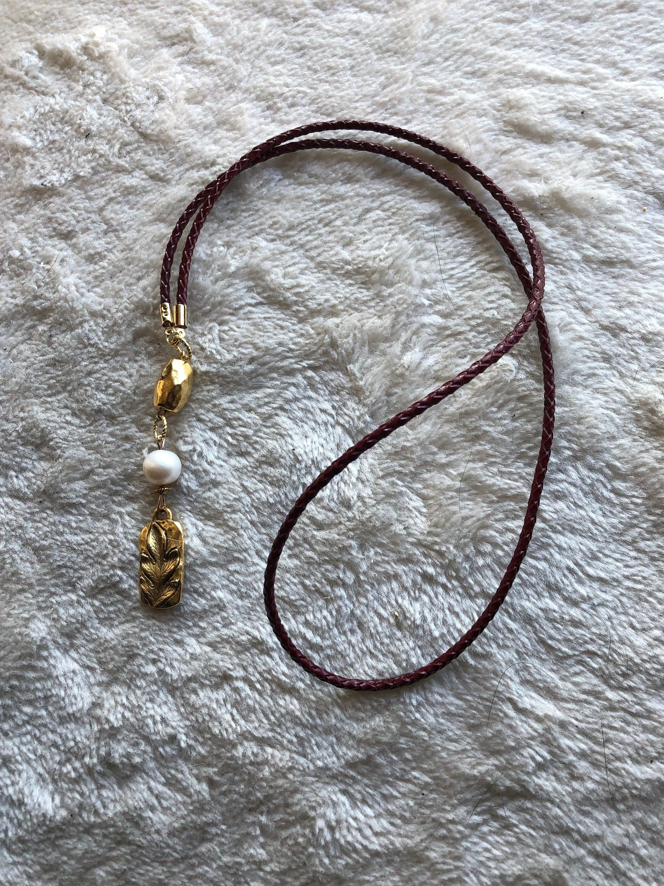 EDISON et CUIR - Sautoir cuir rolo tressé véritable BORDEAUX moderne avec perle de culture Edison et étain massif