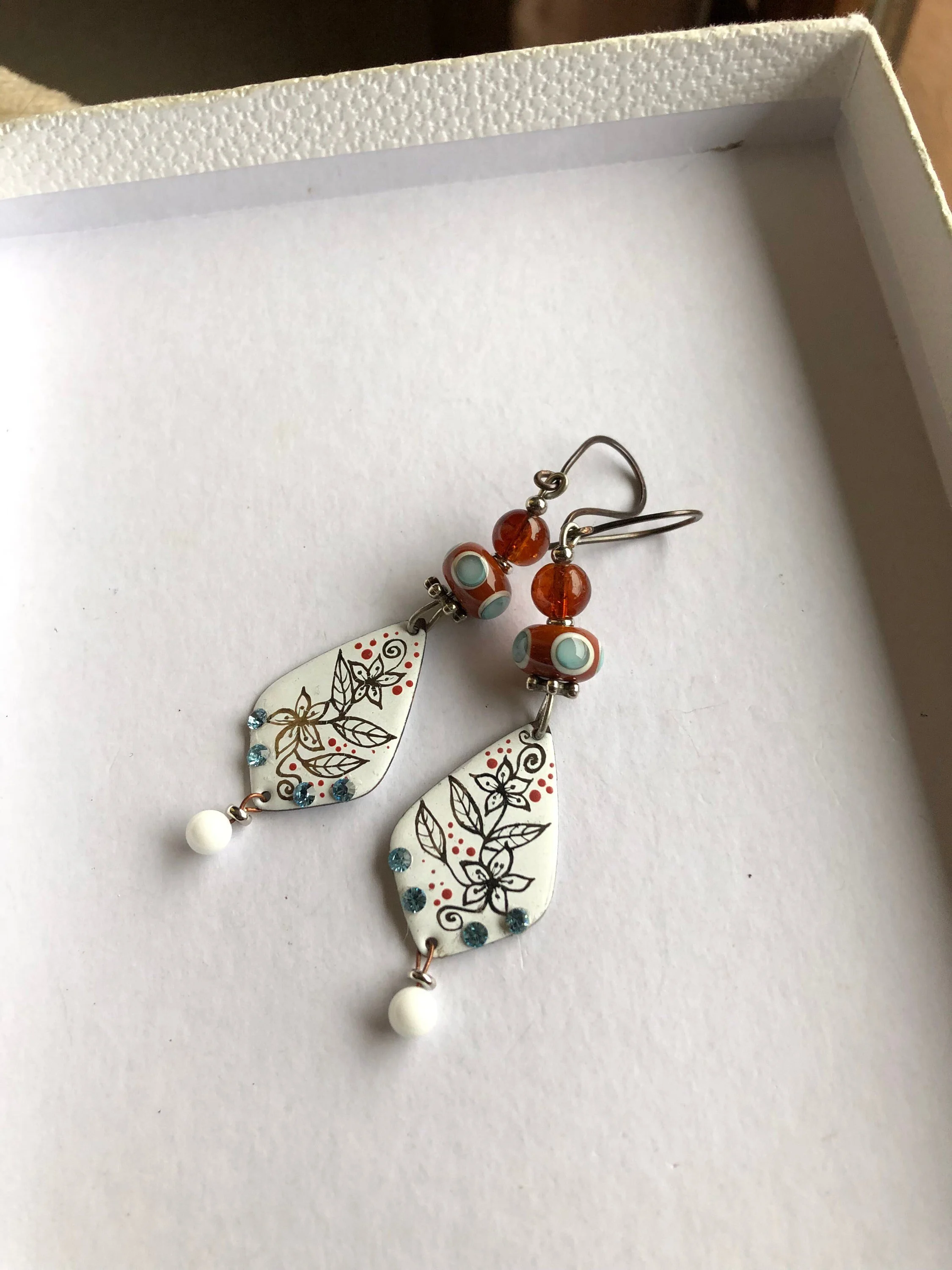 Sublimes breloques fleuries blanches et noires en cuivre emaille d art customises avec cristaux swarosvski
