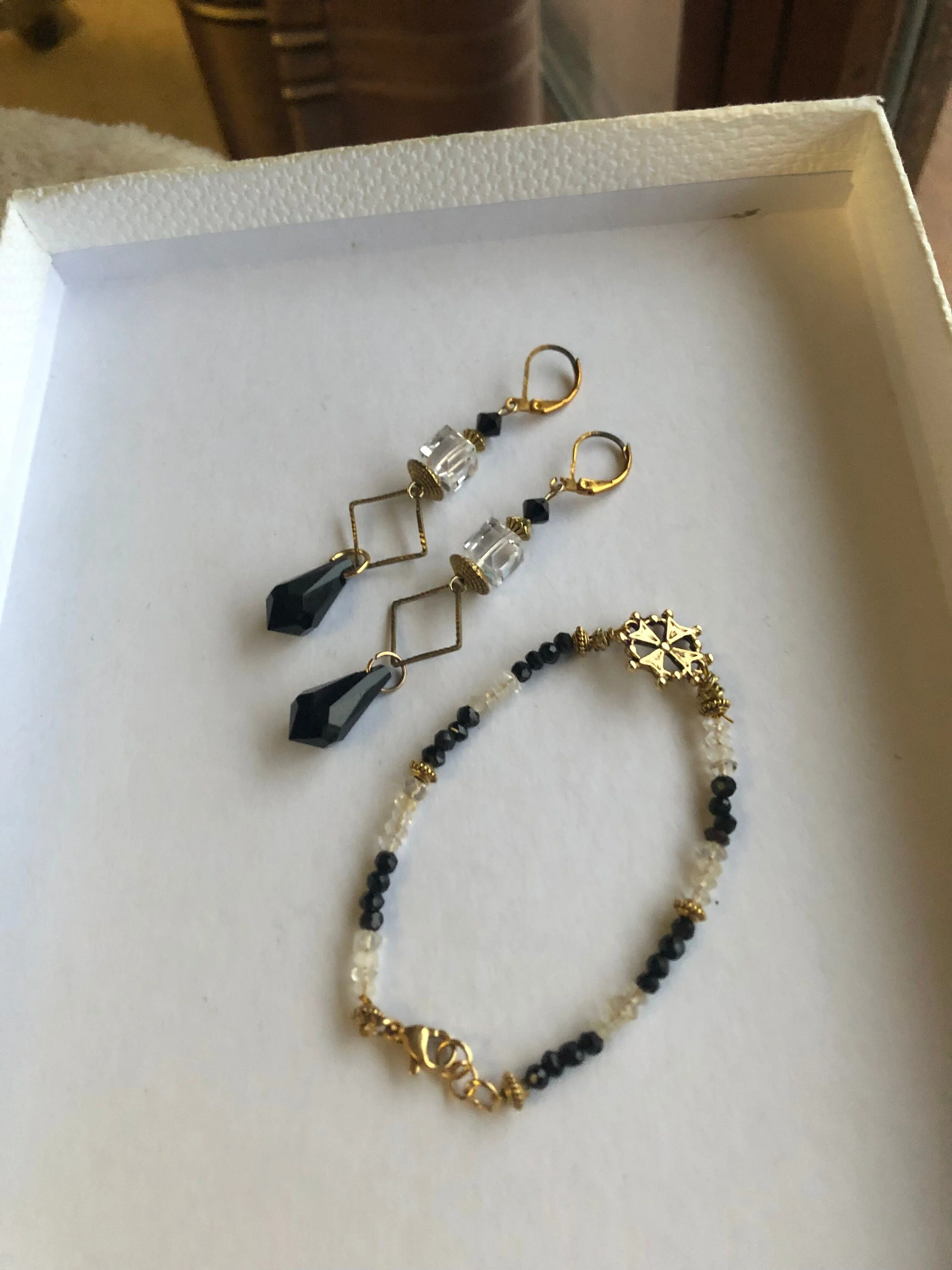 Cathynature-bijoux › Parure boucles et bracelet cristal Swarovski et semi précieuses Image 1 sur 2 Image 2 sur 2 Parure boucles et bracelet cristal Swarovski et semi précieuses 26,00 € épuisé Jolie parure moderne composée de Boucles pendantes en cristal Swarovski Bracelet pour un petit poignet composé de perles précieuse en onyx facettée et cristal de roche Connecteur original en bronze massifSe porte à toute occasion Modèle unique Épuisé Ajout effectué ! Jolie parure moderne composée de Boucles pendantes en cristal Swarovski Bracelet pour un petit poignet composé de perles précieuse en onyx facettée et cristal de roche Connecteur original en bronze massifSe porte à toute occasion Modèle unique