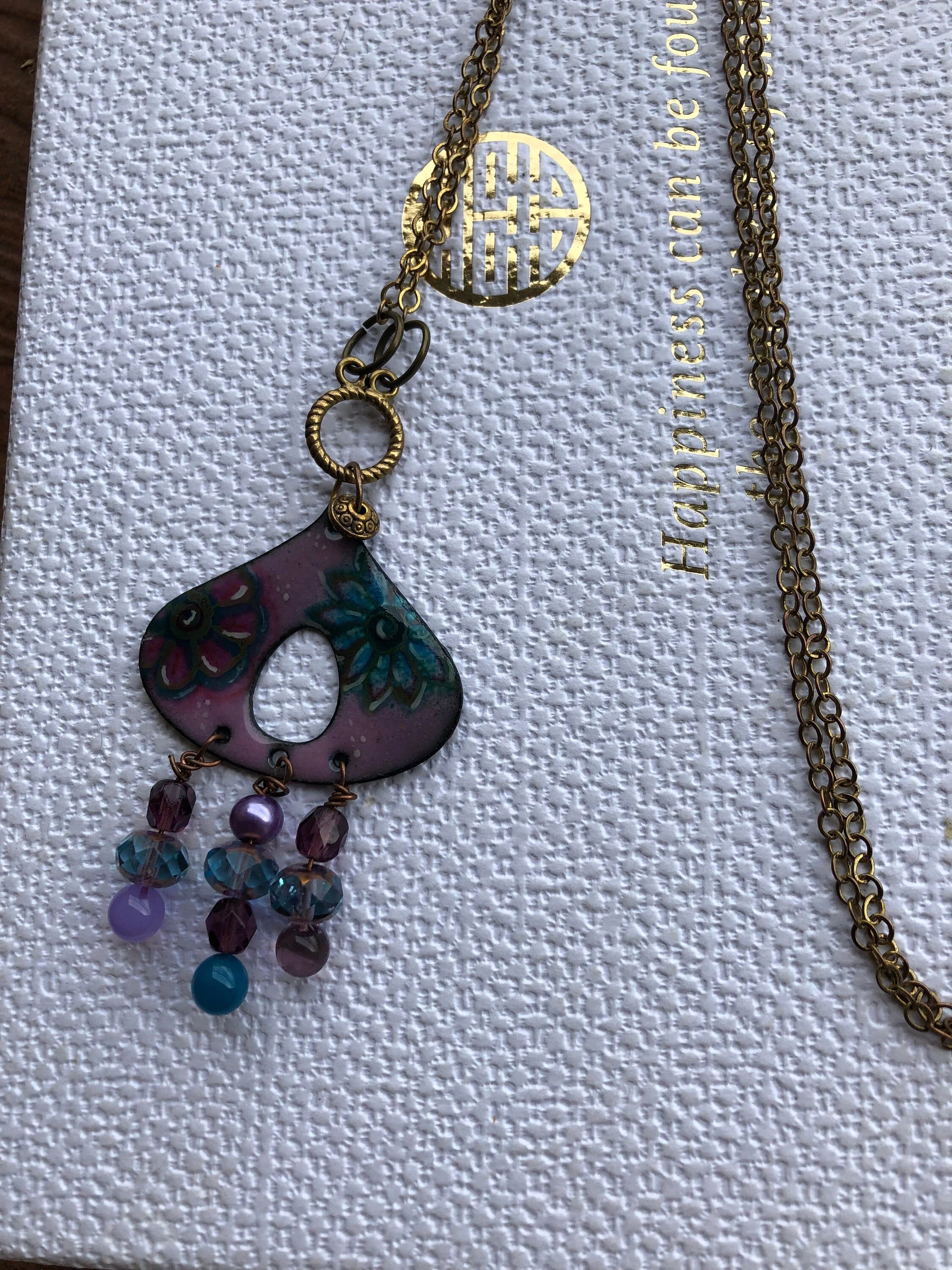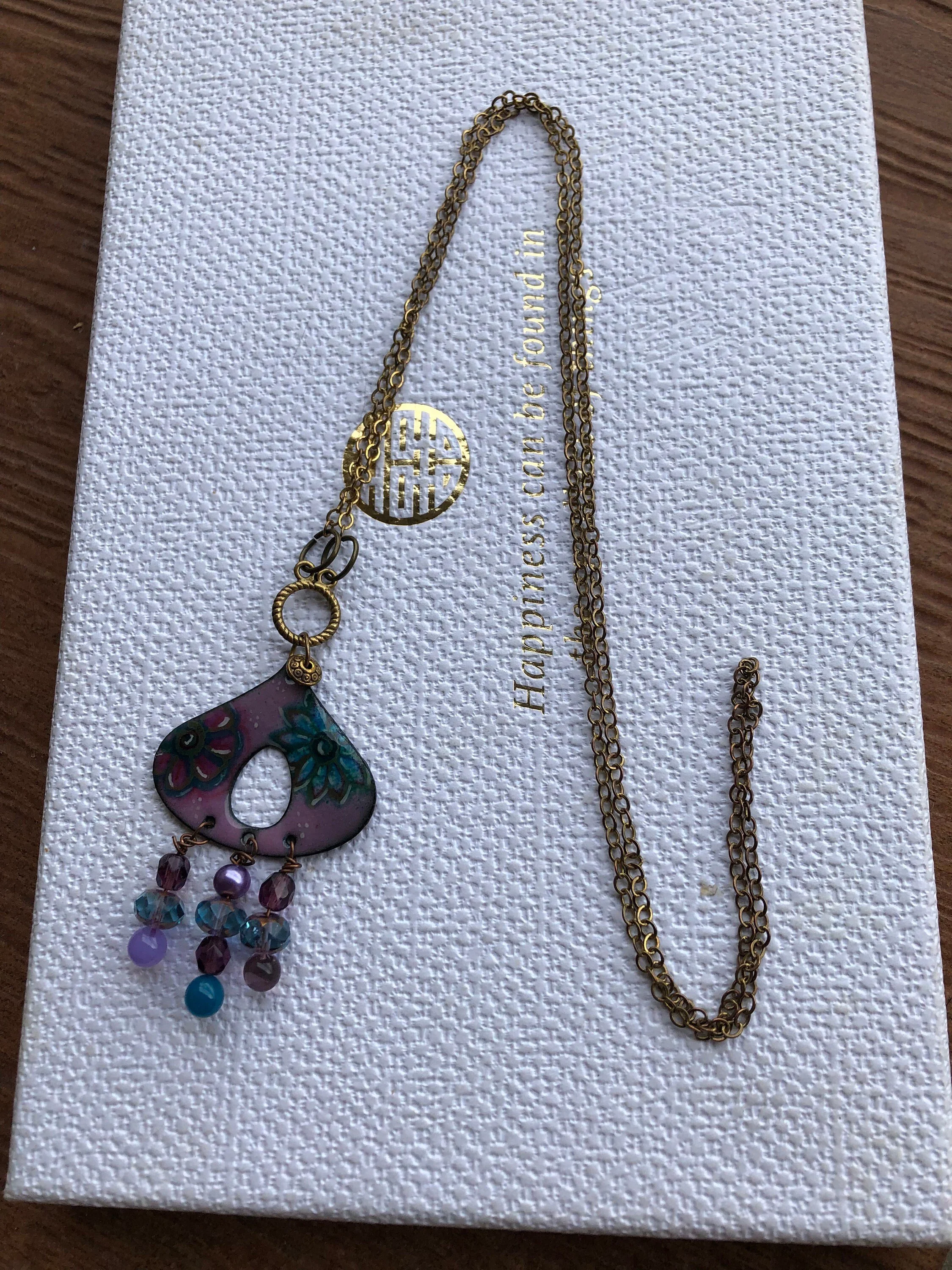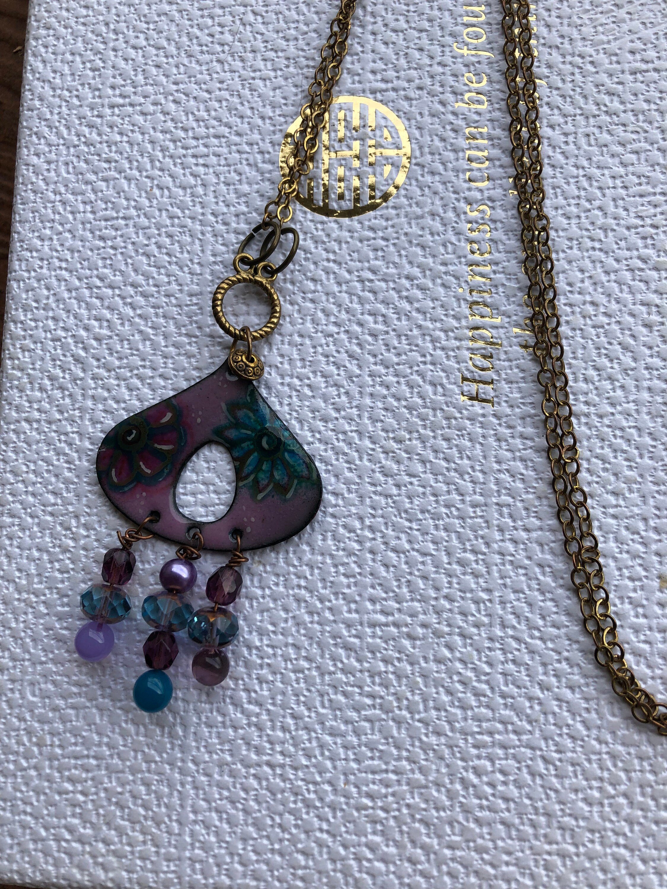 Sautoir bohème chic cuivre émaillé d art bleu violet