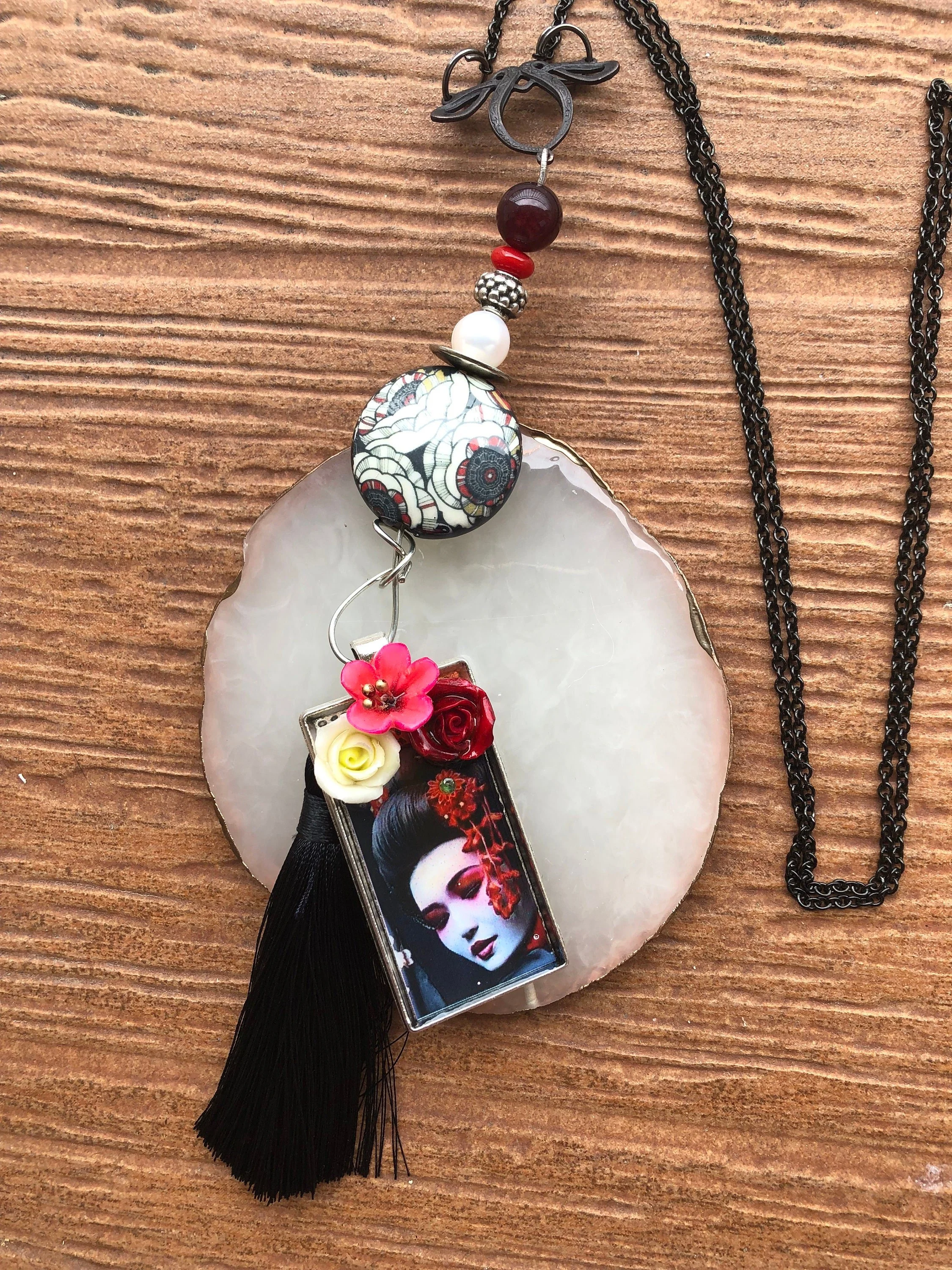 Magnifique pendentif japonisant customises par la talentueuse créatrice de ceramicandco , inclusion fleurs en pâte de porcelaine