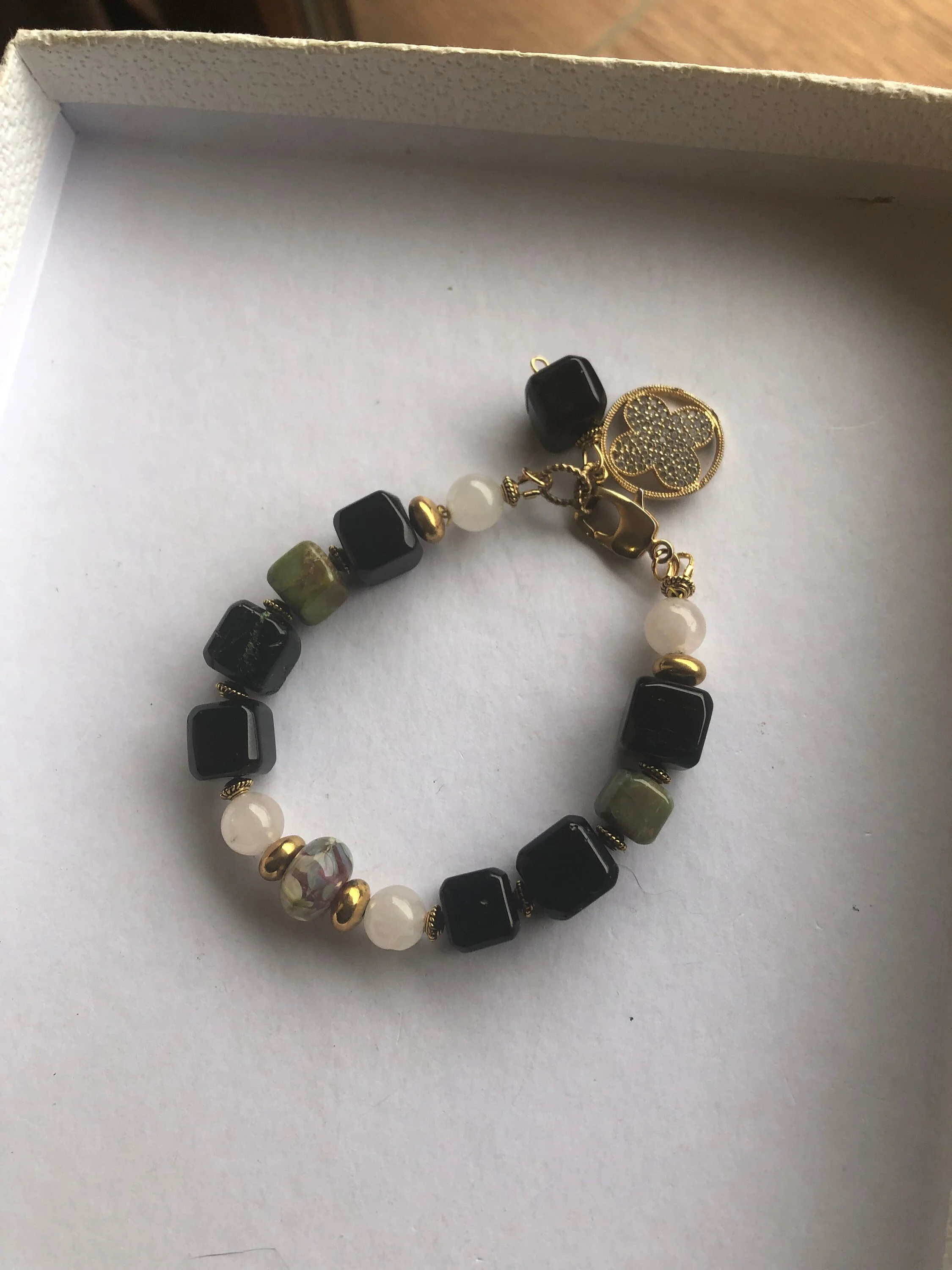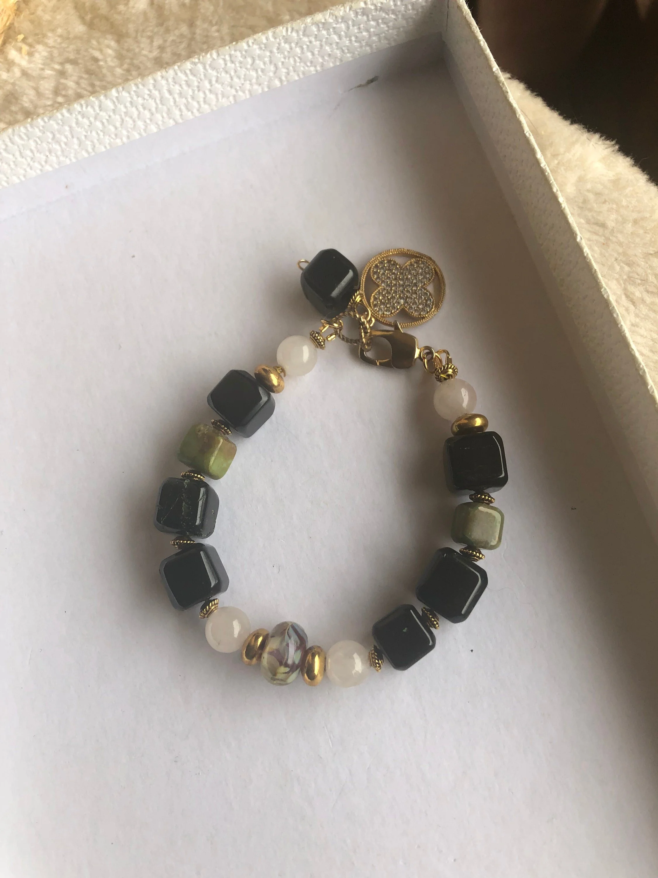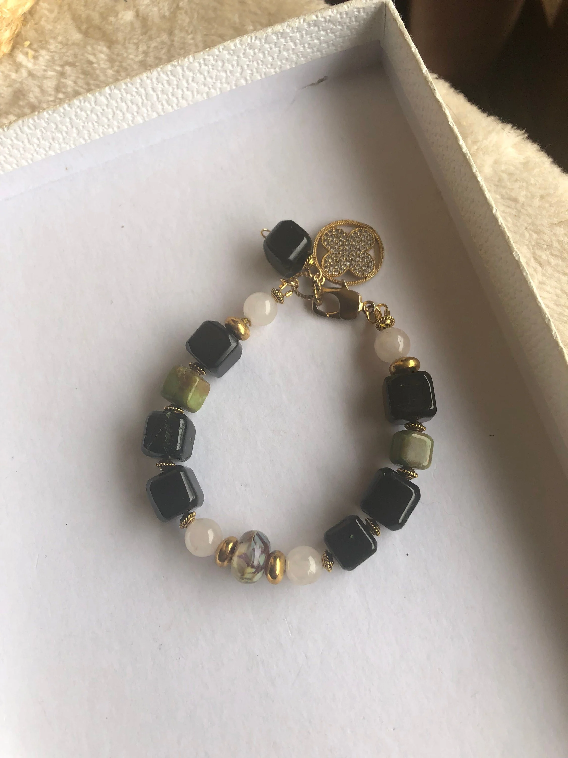 Cathynature-bijoux › SEMI PRÉCIEUSE - Chrysoprase et Jade - Bracelet chic Image 1 sur 8 Image 2 sur 8 Image 3 sur 8 Image 4 sur 8 Image 5 sur 8 Image 6 sur 8 Image 7 sur 8 Image 8 sur 8 SEMI PRÉCIEUSE - Chrysoprase et Jade - Bracelet chic 30,00 € épuisé Magnifique bracelet chic de 20 cm Composé D une très jolie perle centrale en verre file d art Perles semi précieuse en jade blanc Perles semi précieuse carrées très originales en chrysoprase Quelques marques sur les pierres car les sont naturelles Joli jeu de couleur noir et vert Très joli fermoir homard forme originale Très beau charm pendant en plaque or et strass Modele unique Épuisé Ajout effectué ! Magnifique bracelet chic de 20 cm Composé D une très jolie perle centrale en verre file d art Perles semi précieuse en jade blanc Perles semi précieuse carrées très originales en chrysoprase Quelques marques sur les pierres car les sont naturelles Joli jeu de couleur noir et vert Très joli fermoir homard forme originale Très beau charm pendant en plaque or et strass Modele unique
