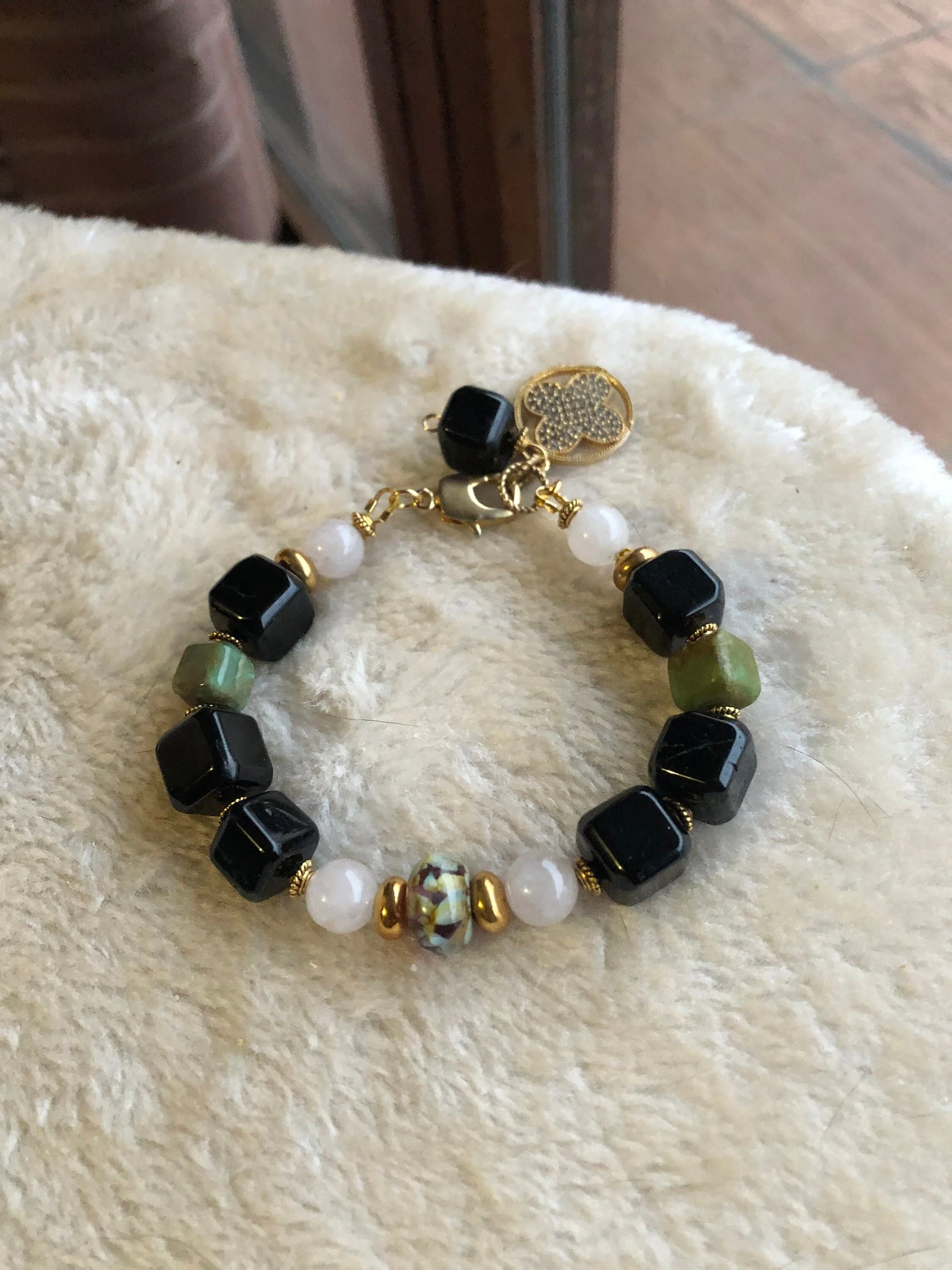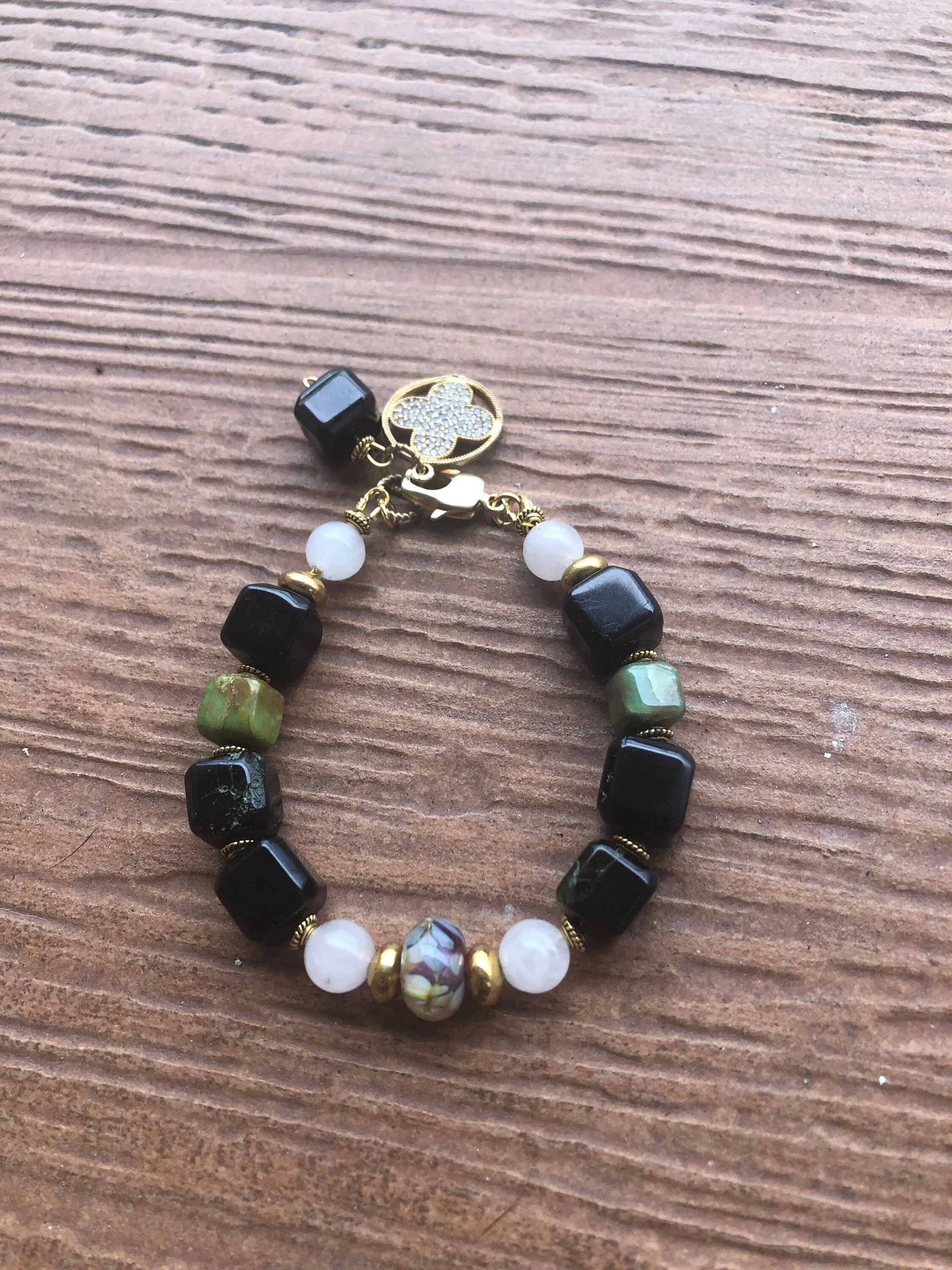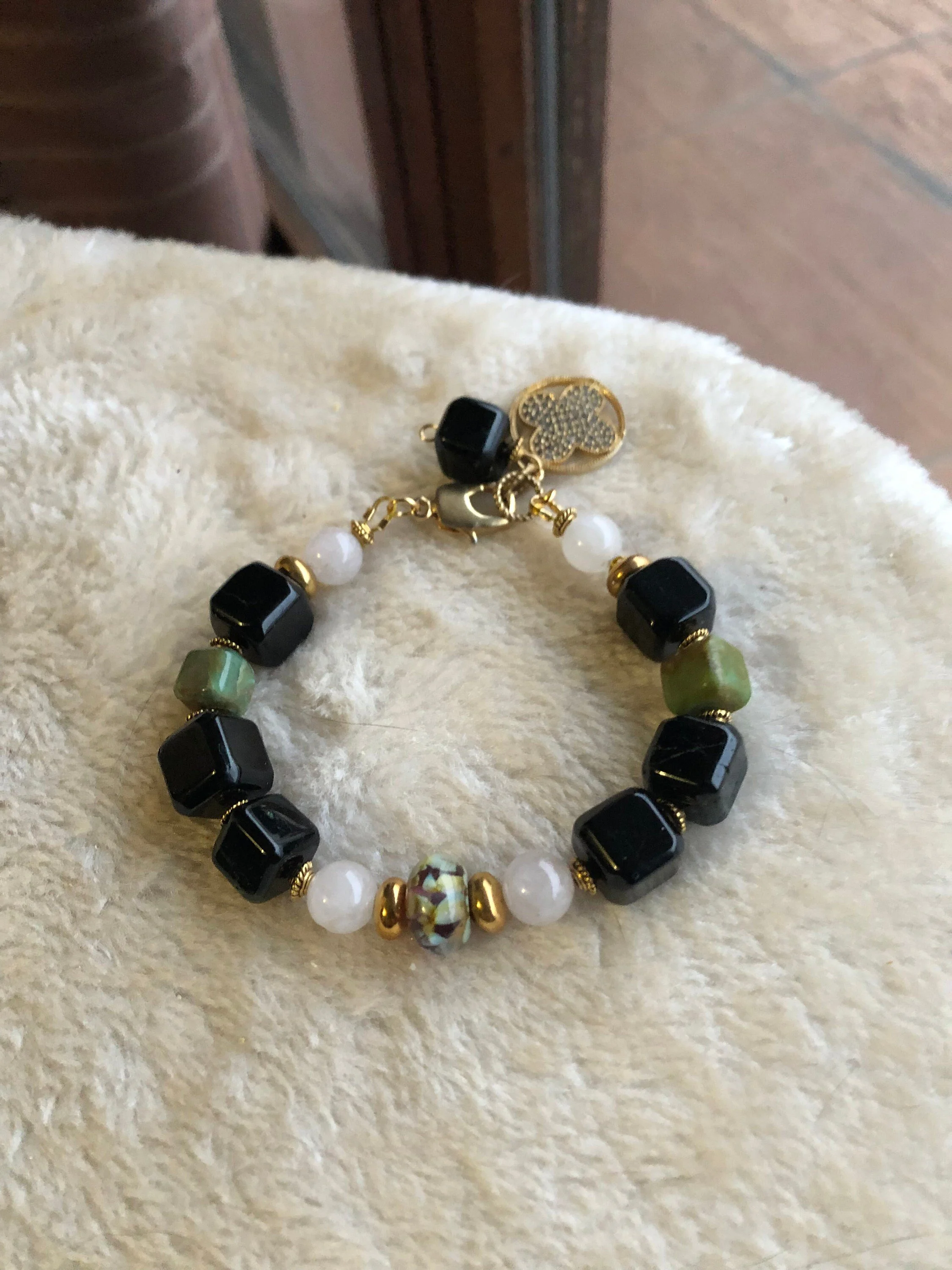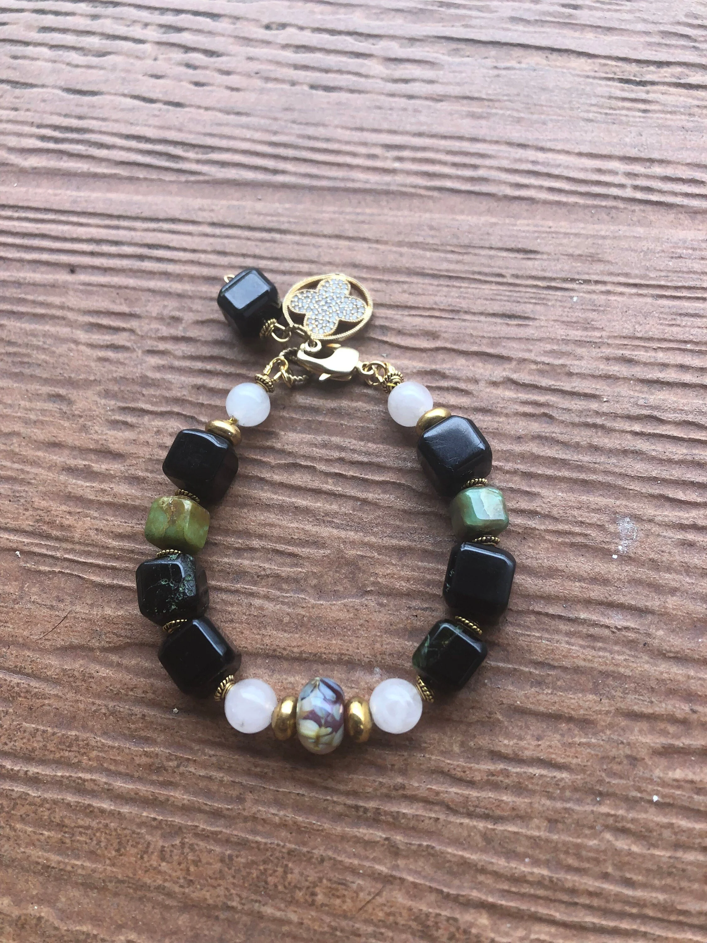 Cathynature-bijoux › SEMI PRÉCIEUSE - Chrysoprase et Jade - Bracelet chic Image 1 sur 8 Image 2 sur 8 Image 3 sur 8 Image 4 sur 8 Image 5 sur 8 Image 6 sur 8 Image 7 sur 8 Image 8 sur 8 SEMI PRÉCIEUSE - Chrysoprase et Jade - Bracelet chic 30,00 € épuisé Magnifique bracelet chic de 20 cm Composé D une très jolie perle centrale en verre file d art Perles semi précieuse en jade blanc Perles semi précieuse carrées très originales en chrysoprase Quelques marques sur les pierres car les sont naturelles Joli jeu de couleur noir et vert Très joli fermoir homard forme originale Très beau charm pendant en plaque or et strass Modele unique Épuisé Ajout effectué ! Magnifique bracelet chic de 20 cm Composé D une très jolie perle centrale en verre file d art Perles semi précieuse en jade blanc Perles semi précieuse carrées très originales en chrysoprase Quelques marques sur les pierres car les sont naturelles Joli jeu de couleur noir et vert Très joli fermoir homard forme originale Très beau charm pendant en plaque or et strass Modele unique
